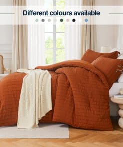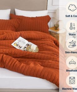 Nuestro juego de edredón terracota de 3 piezas es una excelente opción para añadir comodidad y elegancia a tu dormitorio. El material de poliéster lavado al 100% garantiza su suavidad, durabilidad y ligereza. La colcha seersucker con diseño microplisado ofrece una textura única que crea un efecto visual tridimensional llamativo. Además, con su equilibrio perfecto de peso y calidez, este edredón es adecuado para todas las estaciones.