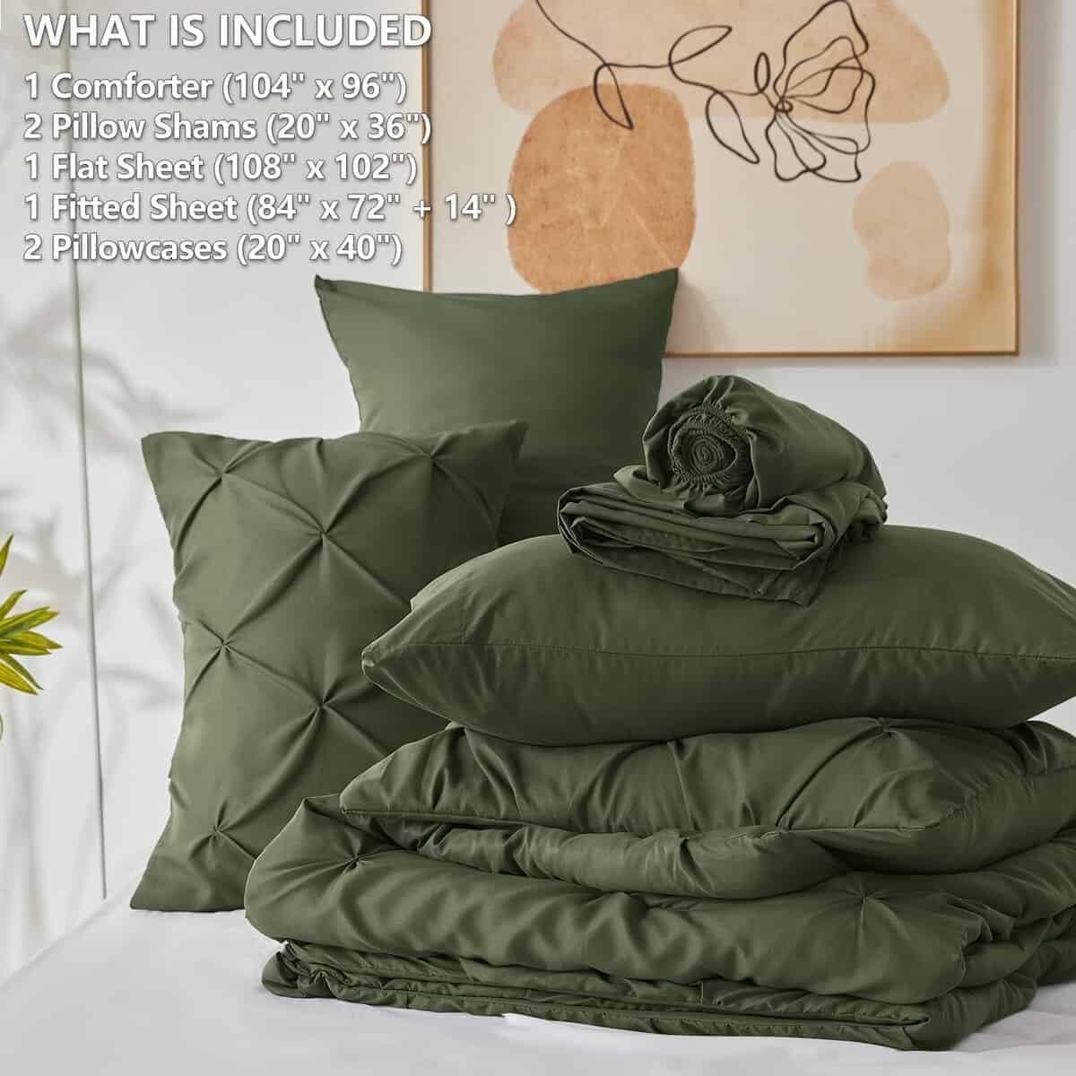 La decoración moderna del Juego de Edredón CozyLux en verde oliva para cama King de California es simplemente impresionante. Con pliegues que crean patrones geométricos exquisitos, este juego de cama eleva instantáneamente tu espacio con elementos modernos y nobles. Proporciona a tu dormitorio una elegancia atemporal y a la moda. Los juegos de edredón de pliegues de California King son tanto suaves como transpirables, gracias a la tela de microfibra premium que es absorbente del sudor. Además, el edredón está relleno con microfibra alternativa extremadamente suave que es amigable para aquellos que son sensibles a las plumas y al plumón. Experimenta una fabulosa noche de descanso con este juego de cama. El diseño elaborado incluye una sábana bajera con bolsillos elásticos que se ajusta a colchones de hasta 16″ de profundidad, garantizando que la sábana siempre se mantenga en su lugar sin importar cuánto te muevas en la cama. El edredón cuenta con un acolchado resistente en caja que ofrece un aspecto sofisticado junto con la simplicidad, además de mantener el relleno en su lugar. El juego de cama incluye un edredón King Cal de 104″x96″, 2 fundas de almohada de 20″x36″, una sábana plana de 108″ x 102″, una sábana ajustable de 84″ x 72″ + 14″ y 2 fundas de almohada de 20″ x 40″. Empacado en una bolsa de vacío, puedes secar el juego de cama a baja temperatura o dar golpecitos suaves al edredón al hornearlo al sol para restaurar su esponjosidad. Los juegos de ropa de cama son lavables a máquina, lo que te ahorra tiempo y energía. Para disfrutar de la suavidad durante todo el año y prevenir la formación de bolitas, se recomienda lavar en el ciclo suave con agua fría, secar al sol o secar a baja temperatura según sea necesario. Deja que el Juego de Edredón CozyLux siga proporcionándote a ti y a tu familia un sueño confortable y acogedor.