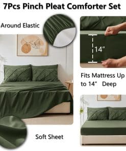 El juego de edredón CozyLux Olive Green King de 7 piezas es una excelente adición a tu dormitorio. Con un diseño pinch pleat de moda, este juego de cama crea patrones geométricos exquisitos que elevan tu espacio con elementos modernos y nobles, aportando una elegancia atemporal y moda a la decoración de tu dormitorio. El edredón king size está hecho de tela de microfibra premium que es transpirable y absorbente al sudor, lo que te brinda una sensación suave y acogedora. Además, el edredón está relleno con microfibra alternativa extremadamente suave que es amigable para aquellos que estornudan con ropa de cama de plumas y plumón, lo que te permite disfrutar de un descanso fabuloso. La sábana ajustable de bolsillo profundo se adapta a un colchón de hasta 16″ de profundidad, manteniéndose siempre antideslizante sin importar cómo te retuerzas en la cama. El edredón cuenta con un acolchado de caja duradero que ofrece un aspecto sofisticado junto con la simplicidad y asegura que el relleno se mantenga estable en su lugar. En cuanto a lo que recibirás, el juego de cama incluye un edredón king size de 102″x90″, dos fundas de almohada de 20″x36″, una sábana plana de 108″x102″, una sábana ajustable de 78″x80″+14″ y dos fundas de almohada de 20″x40″. Nuestro juego de cama se envía empaquetado al vacío para que puedas secarlo a baja temperatura o golpear suavemente el edredón mientras lo colocas al sol para que vuelva a estar esponjoso. Además, es fácil de cuidar, ya que es lavable a máquina, lo que te ayuda a ahorrar tiempo y energía. Para mantener la suavidad durante todo el año y prevenir la formación de bolitas, se recomienda lavarlo en ciclo suave con agua fría, secarlo al sol o en secadora a baja temperatura cuando sea necesario. Deja que nuestras sábanas de edredón sigan brindándote a ti y a tu familia un sueño acogedor y placentero durante mucho tiempo.