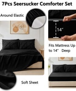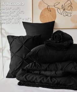 El juego de edredón CozyLux para cama matrimonial de 7 piezas en color negro es la combinación perfecta entre elegancia y confort. Los pliegues pintuck crean patrones geométricos exquisitos que elevan el diseño de tu dormitorio a otro nivel. El edredón está relleno con una microfibra alternativa al plumón extremadamente suave que proporciona una sensación acogedora y cálida. La sábana ajustable con bolsillo elástico profundo se adapta a colchones de hasta 16″ de profundidad, lo que garantiza un ajuste perfecto y sin deslizamientos. El acolchado durable en caja ofrece un aspecto sofisticado y una estabilidad excepcional al relleno. Además, el juego de cama incluye todo lo necesario para una experiencia de sueño placentera, desde las fundas de almohada hasta las sábanas planas y ajustables. Disfruta de la comodidad, el estilo y la calidad con el juego de edredón CozyLux en color negro. Lavable a máquina para facilitar el mantenimiento y durabilidad. ¡No te pierdas la oportunidad de transformar tu dormitorio con este juego de cama elegante y funcional!