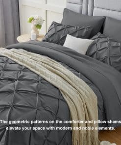 El juego de edredón CozyLux Twin XL en gris oscuro de 5 piezas es perfecto para aquellos que desean darle un toque de elegancia y moda moderna a su dormitorio. El diseño de pliegues y patrones geométricos exquisitos eleva instantáneamente el aspecto de cualquier espacio. Fabricado con tela de microfibra de primera calidad, este juego de edredón es transpirable y absorbente del sudor, ideal para garantizar una noche de descanso reparador. El edredón está relleno con microfibra alternativa al plumón extremadamente suave, que es perfecto para quienes sufren de alergias. La sábana ajustable de bolsillo profundo elástico se adapta a colchones de hasta 16″ de profundidad y garantiza un ajuste seguro y antideslizante. ¡Este juego de edredón Twin XL incluye todo lo que necesitas para una cama cómoda y elegante! Llévalo a casa y disfruta de la combinación perfecta de comodidad y estilo.
