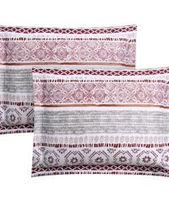 Eleva con estilo la decoración de tu dormitorio con los Conjuntos de Cama Tangier de French Connection. Tangier cuenta con un estampado tribal bohemio en tonos ricos de rojo sobre un satinado blanco de algodón con un reverso blanco a juego. Cada juego de tres piezas es tan acogedor como elegante. El juego de edredón Queen de 3 piezas incluye (1) edredón de 96″ x 96″ y (2) fundas de almohada de 21″ x 27″. Las opciones de tamaño incluyen Queen y King. Disponible en juego de edredón y juego de funda nórdica. Instrucciones de cuidado: Voltear del revés antes de lavar. Lavar a máquina en frío con colores similares, ciclo suave. No usar lejía. Secar en línea. No usar secadora. Planchar caliente del revés si es necesario. No lavar en seco. 100% Algodón. Relleno del edredón: 100% Poliéster. Importado.