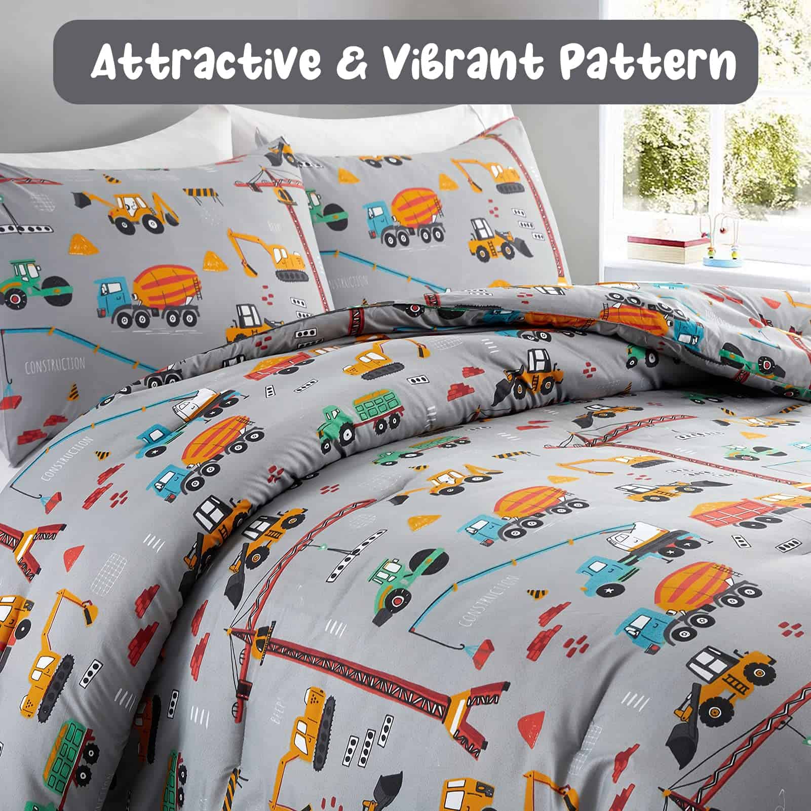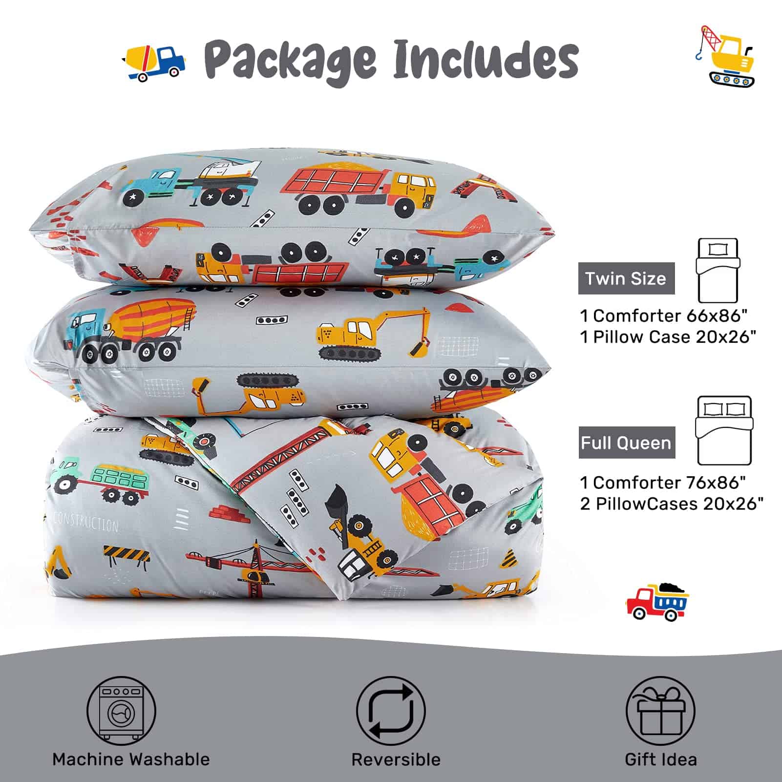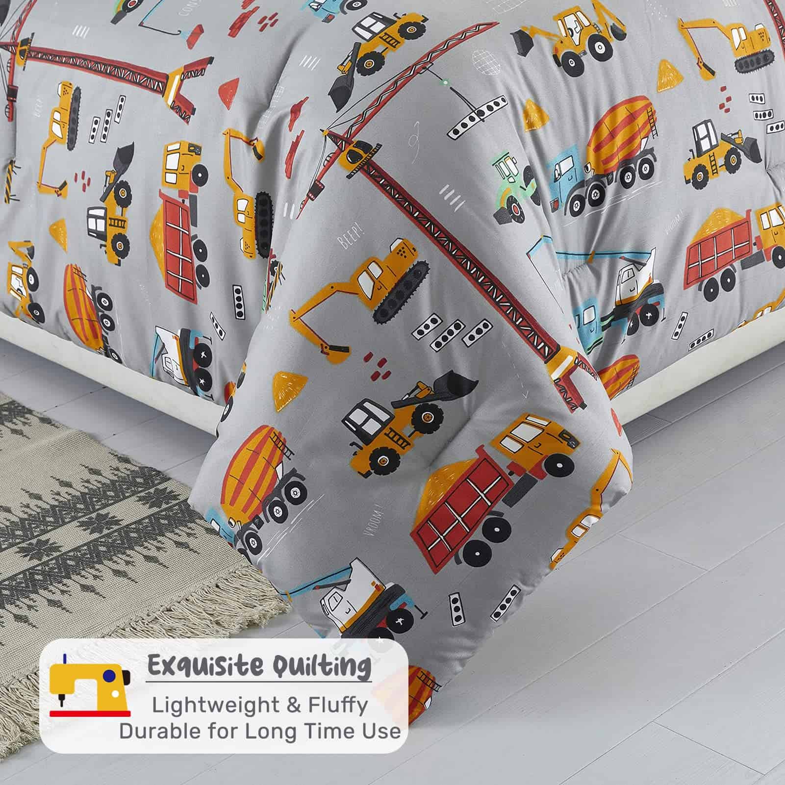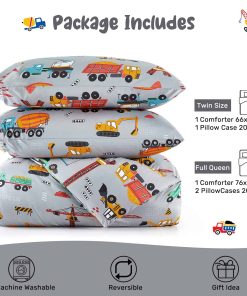 El juego de edredón de 3 piezas HollyHOME para cama Full/Queen es perfecto para los niños que aman los camiones de dibujos animados. Hecho de 100% poliéster, este set incluye un edredón de tamaño Full/Queen de 76″ x 86″ y 2 fundas de almohada de 20″ x 26″. El relleno de poliéster del edredón brinda una mayor comodidad y es ideal para usar durante todas las estaciones. Con un diseño de dibujos animados coloridos, este juego de edredón será el regalo perfecto para la habitación de adolescentes o la habitación de invitados. Fácil de cuidar, se puede lavar a máquina en agua fría y secar al sol o en secadora a baja temperatura. ¡Haz que la hora de dormir sea más divertida con este adorable juego de edredón de camiones de dibujos animados!