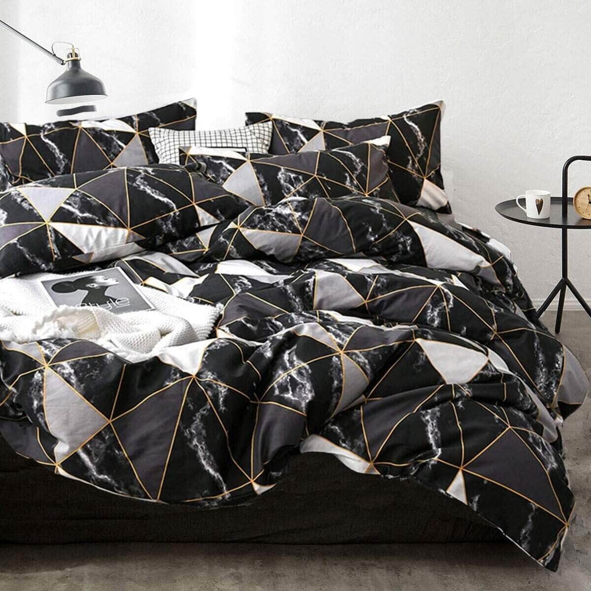 Juego de Edredón de Algodón Negro Dorado King Marble
