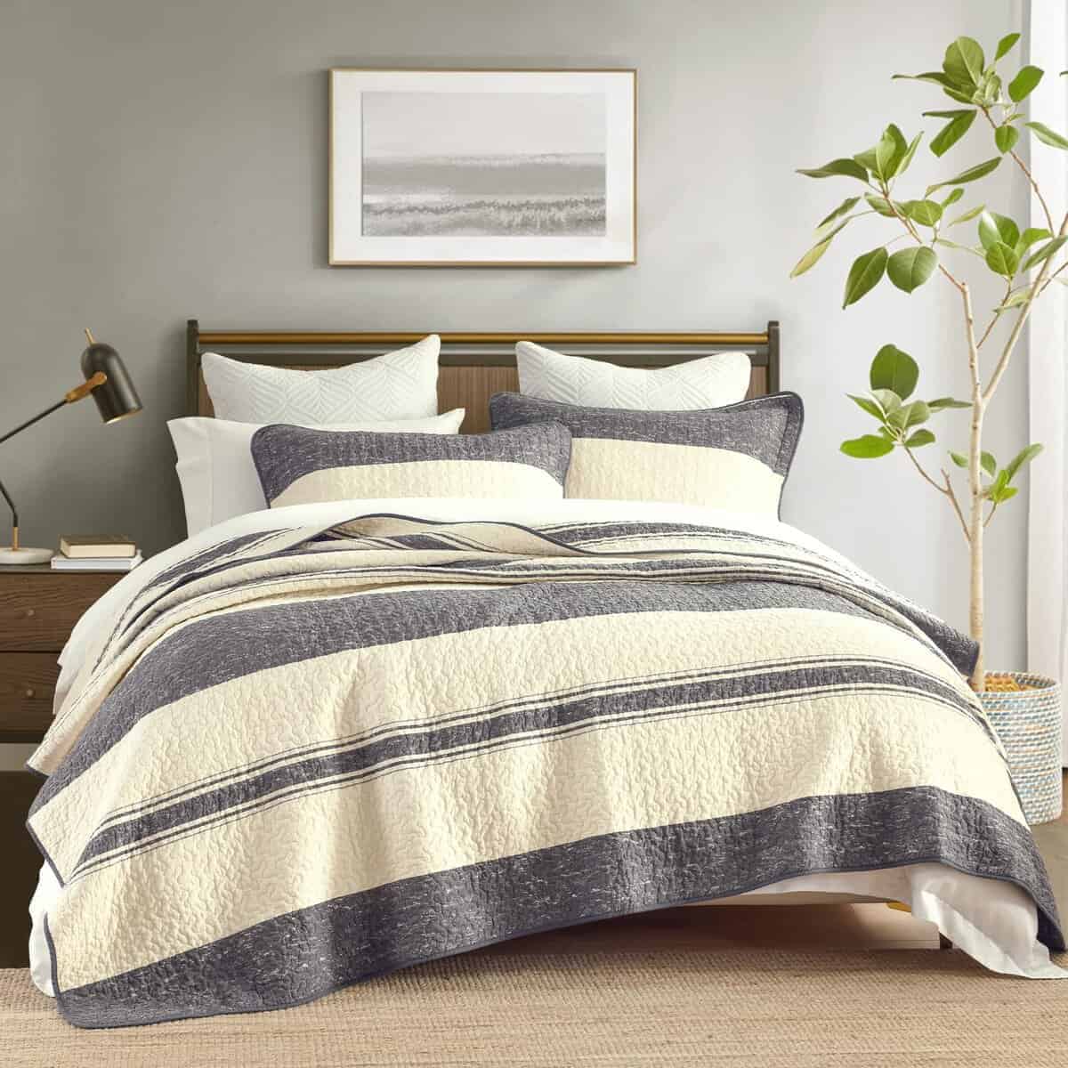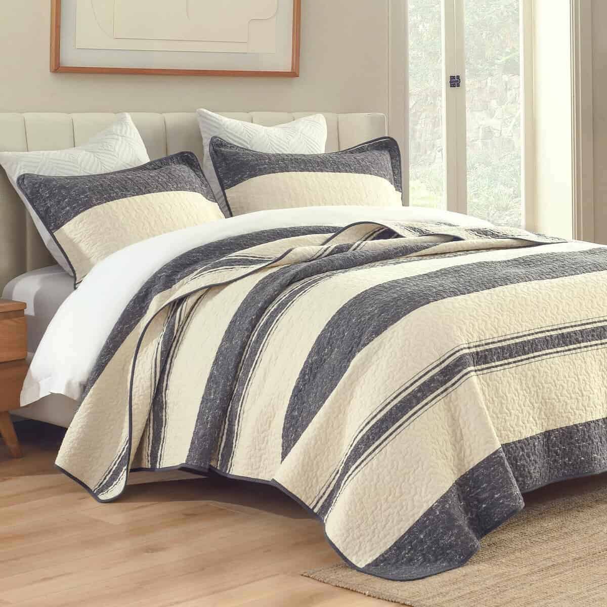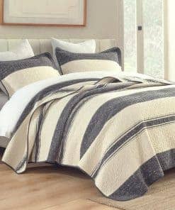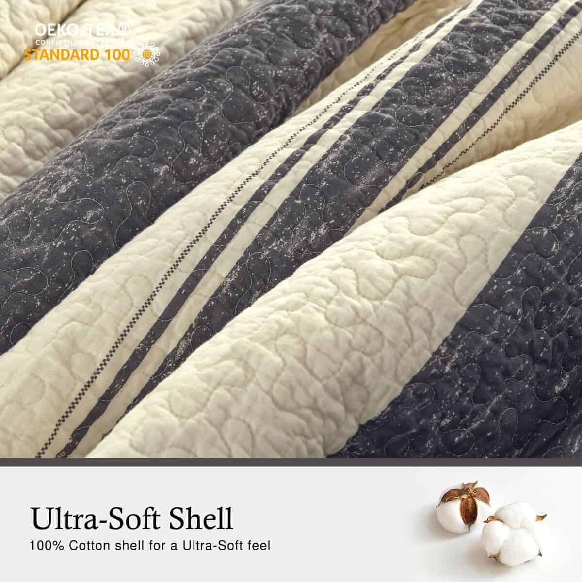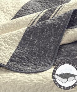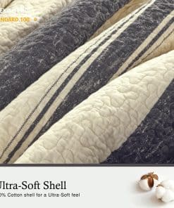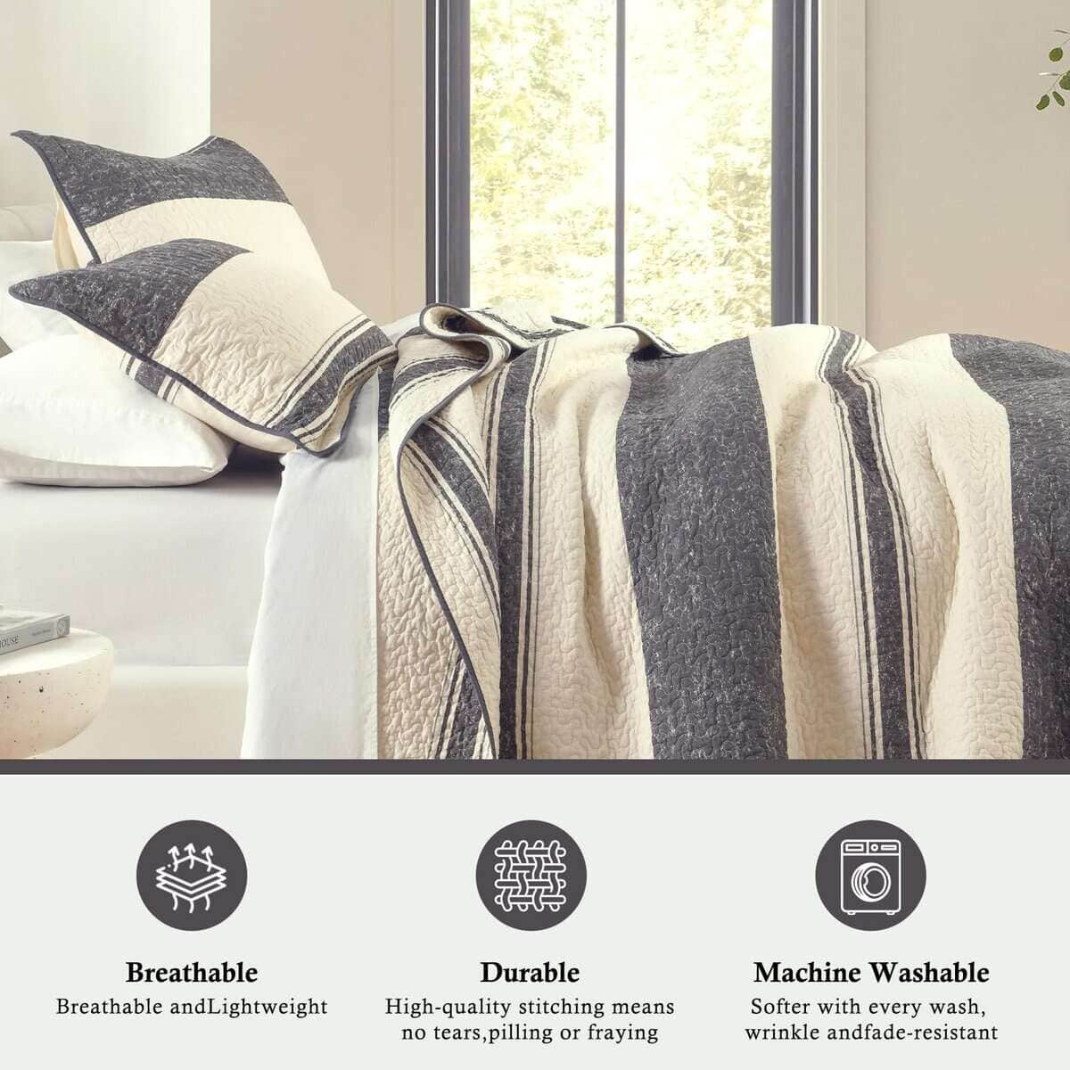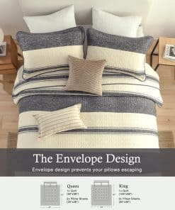 QuiltMuse presenta este elegante juego de edredón de algodón tamaño King en un atractivo color gris oscuro con un diseño de rayas que añade un toque de modernidad a cualquier habitación. El material 100% algodón de alta calidad asegura una excelente transpirabilidad para regular la temperatura del cuerpo y garantizar un sueño seco y confortable, ideal para aquellas personas que tienden a tener calor durante la noche.
