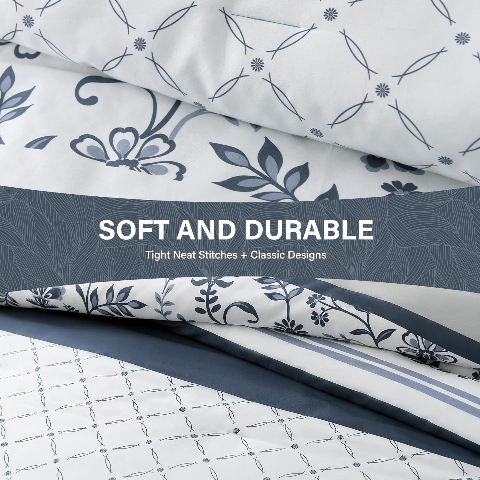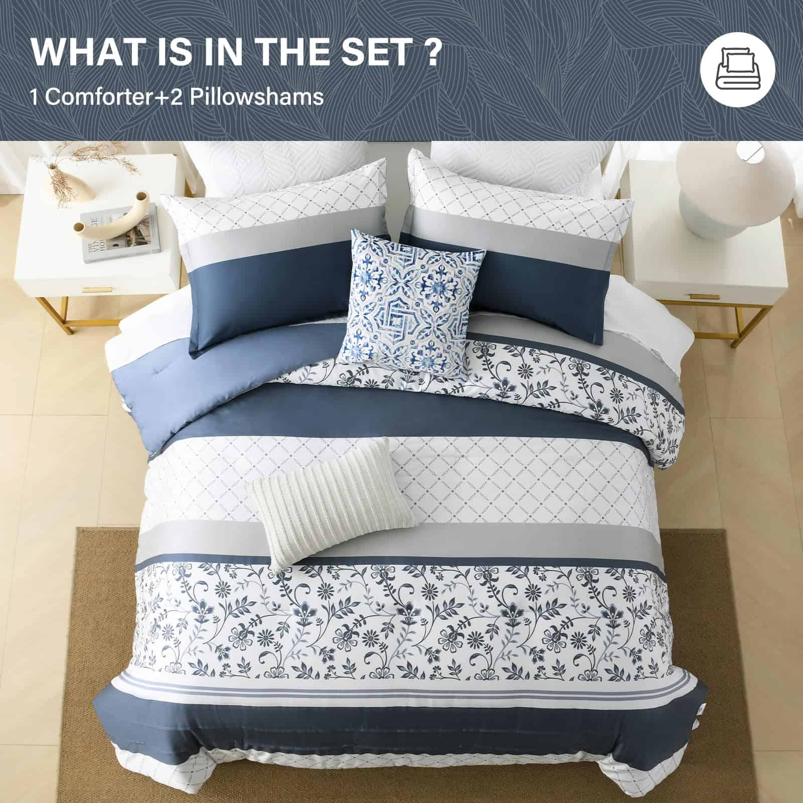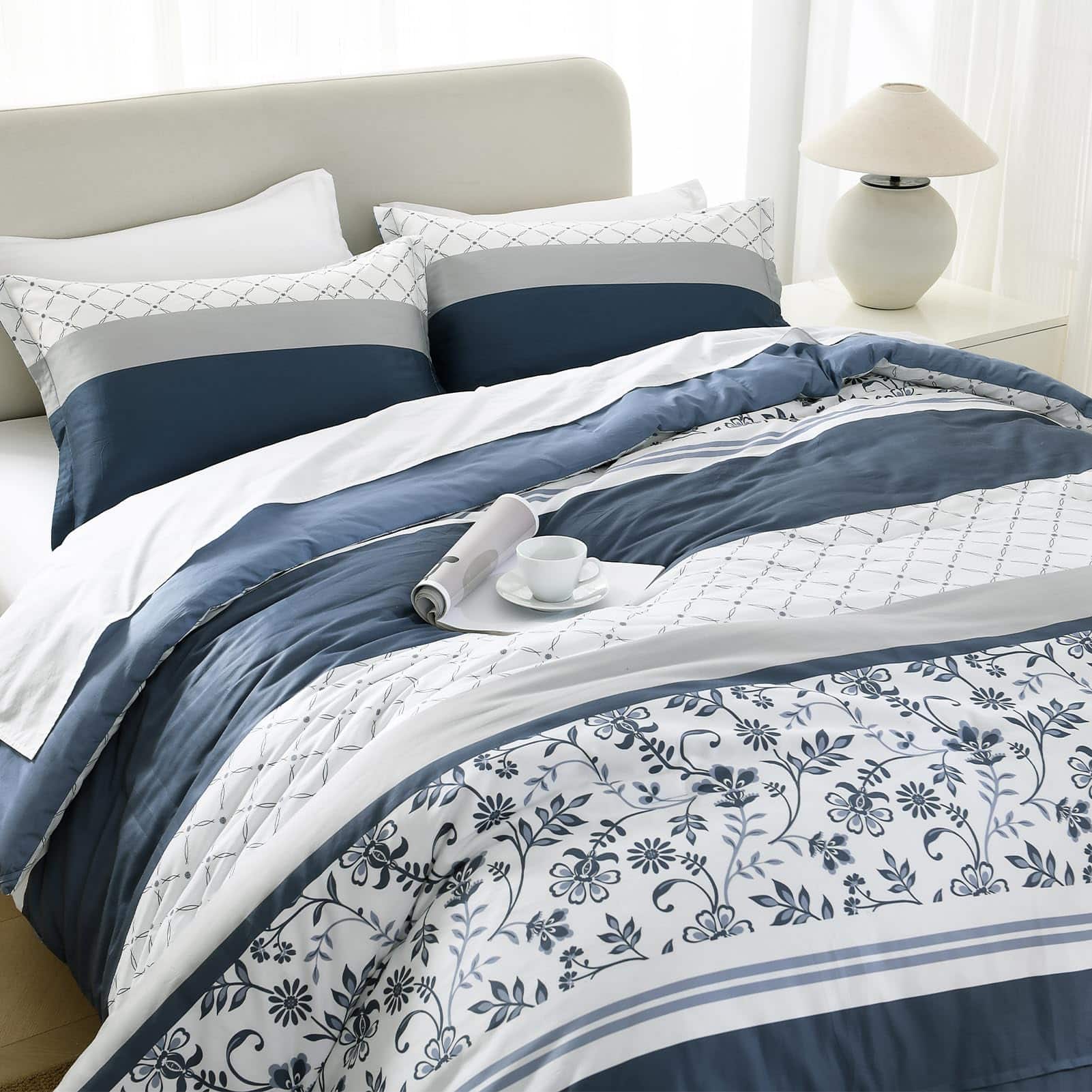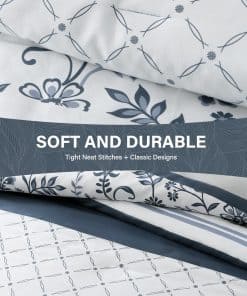 2. Diseños Únicos: Edredón de lujo sedoso reversible en esquema de colores azul marino / blanco / gris. Un lado diseñado con patrones florales y rayados y el otro lado es un suave tono sólido de azul marino. Este edredón agrega un toque de moda e ingenio artístico a su habitación. Dale a tu habitación un nuevo aspecto. Ideal para dormitorio, cuarto principal, habitación de invitados, dormitorio, interiores, camping y RVs.