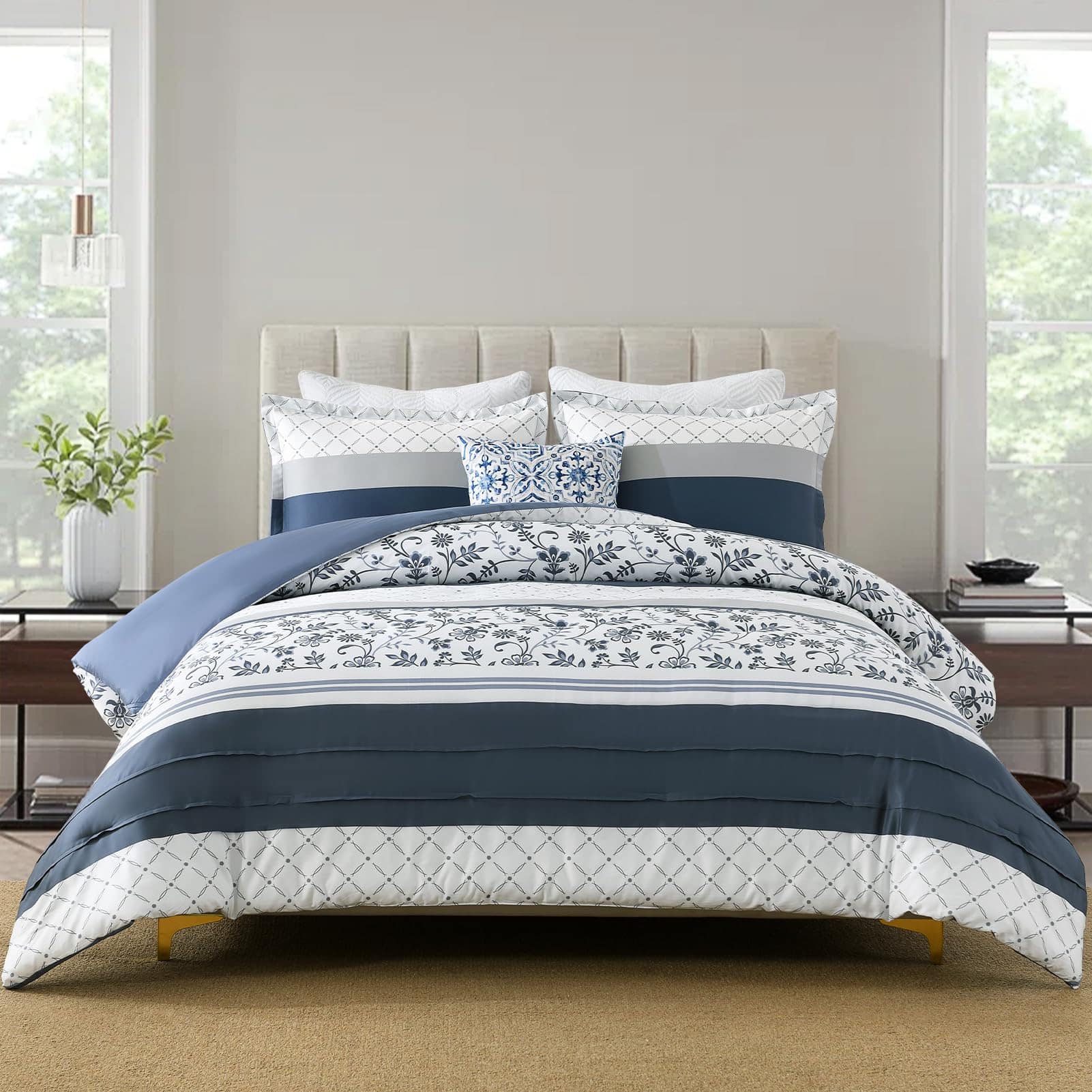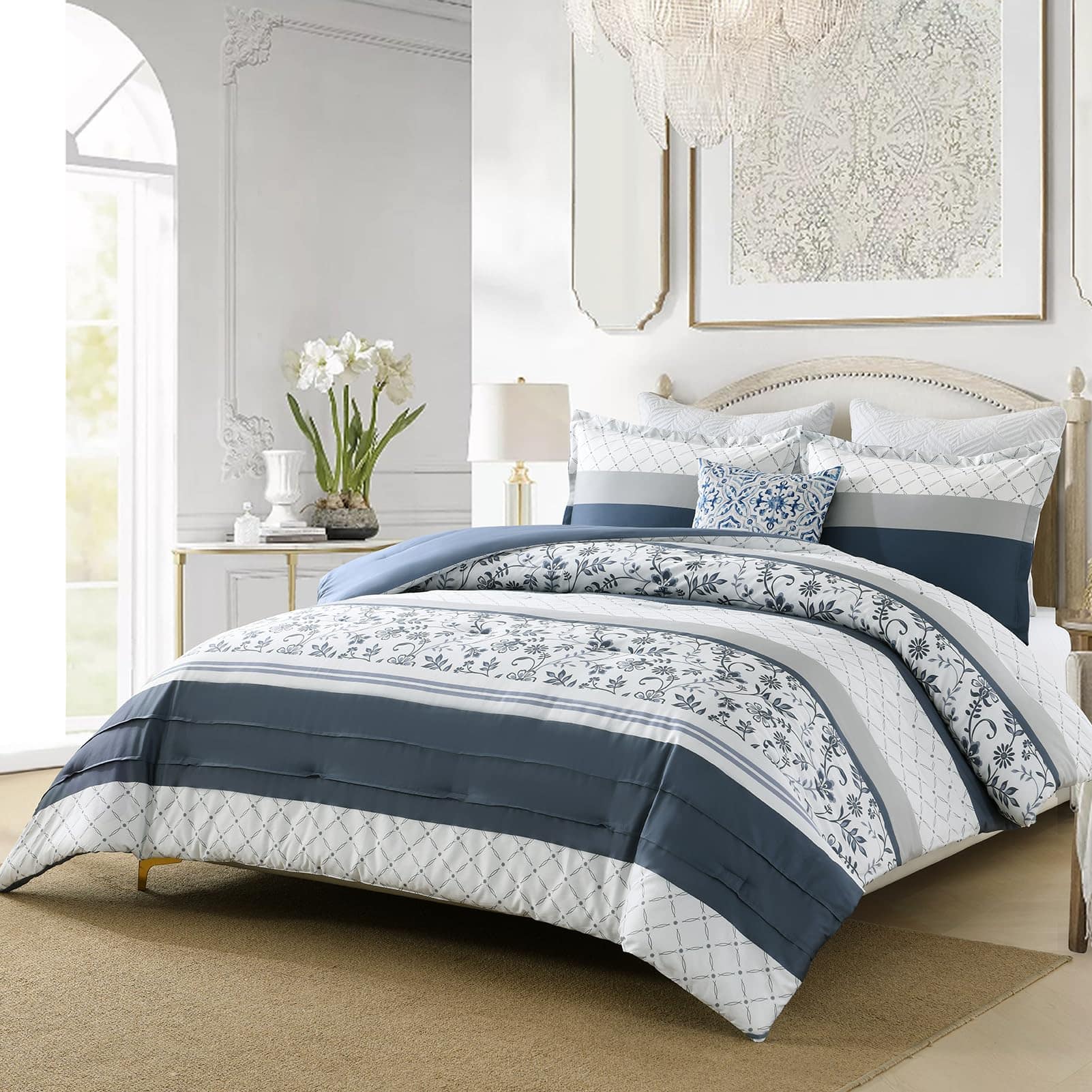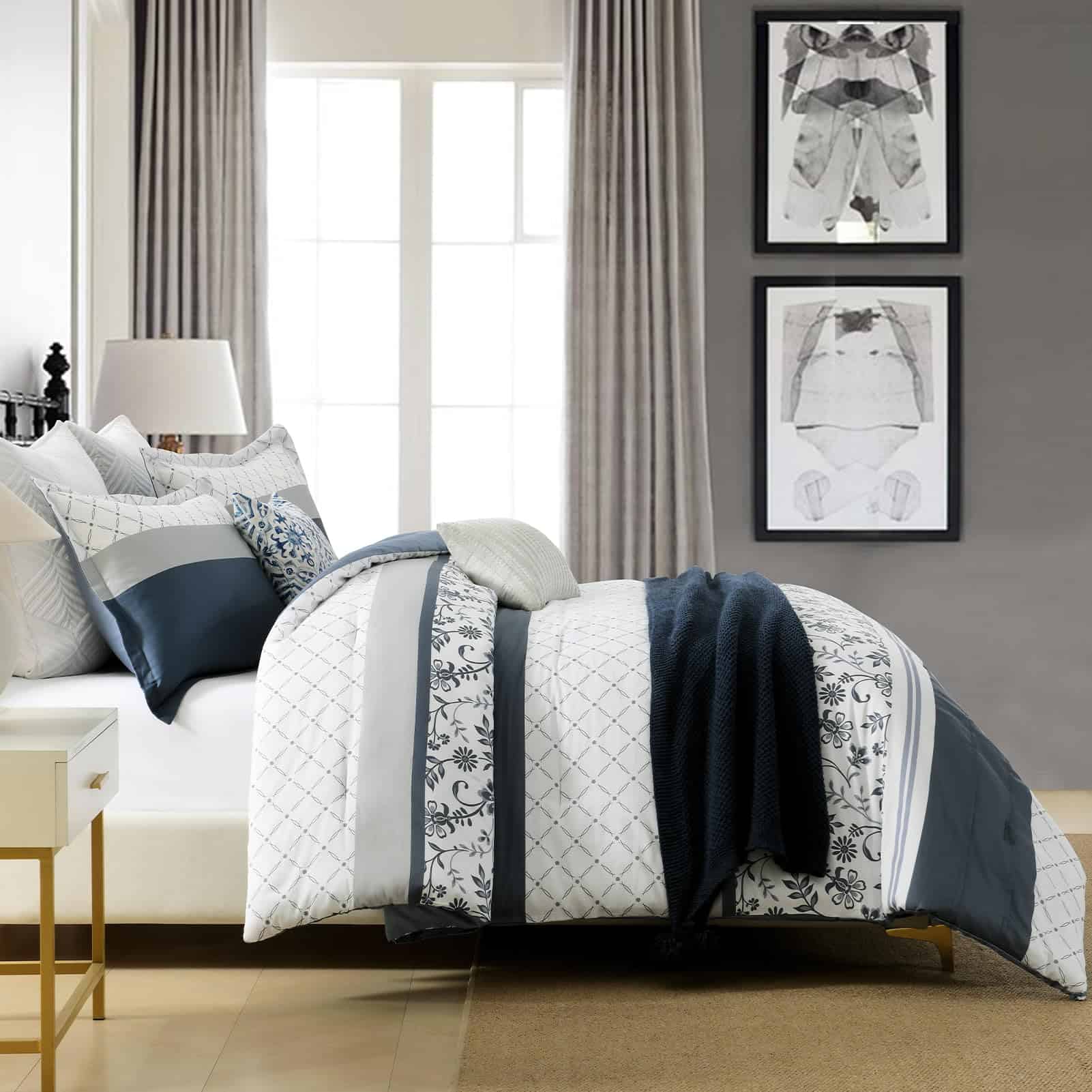 2. Diseños Únicos: Edredón de lujo sedoso reversible en esquema de colores azul marino / blanco / gris. Un lado diseñado con patrones florales y rayados y el otro lado es un suave tono sólido de azul marino. Este edredón agrega un toque de moda e ingenio artístico a su habitación. Dale a tu habitación un nuevo aspecto. Ideal para dormitorio, cuarto principal, habitación de invitados, dormitorio, interiores, camping y RVs.