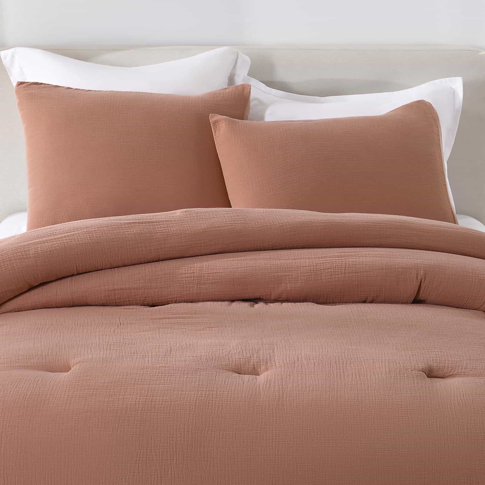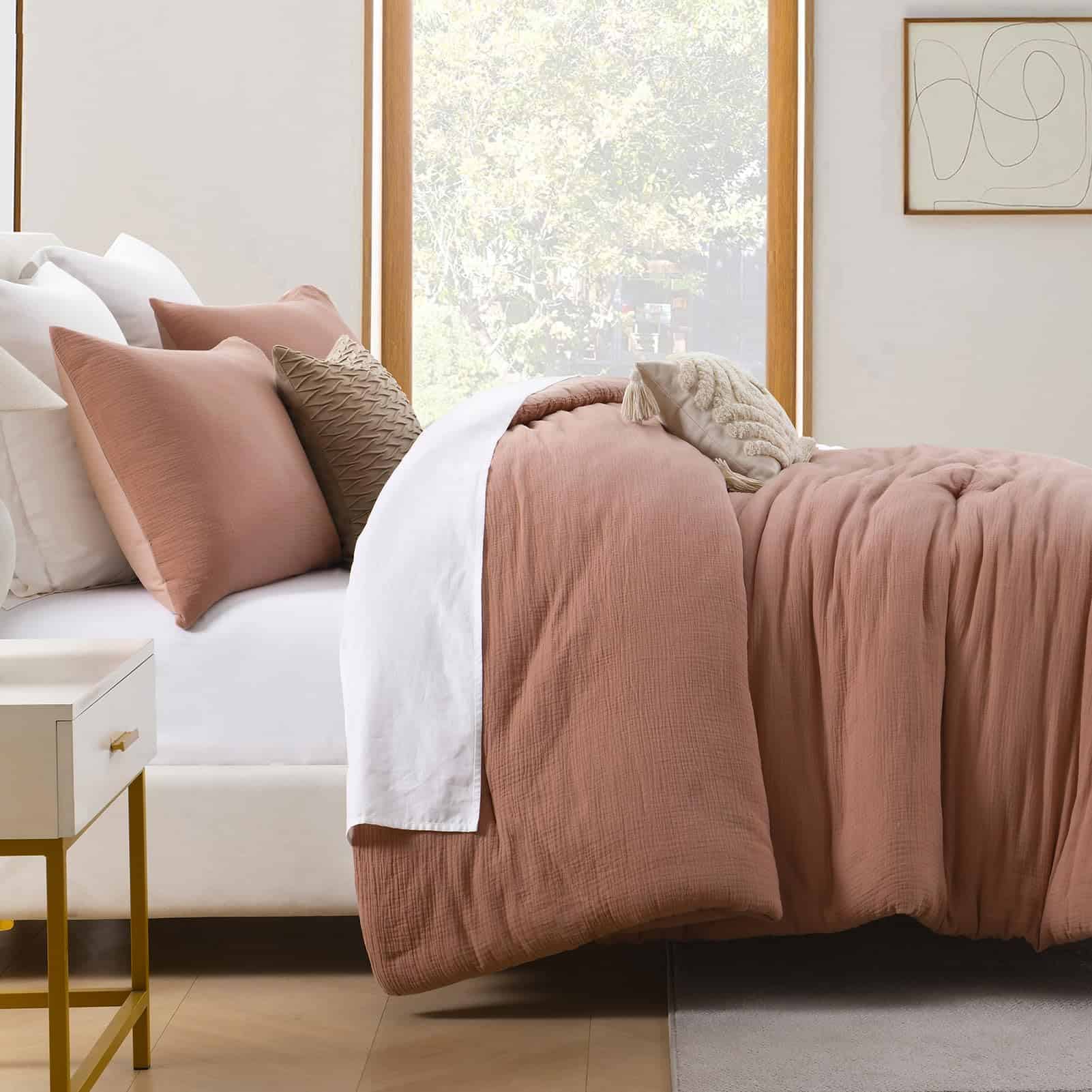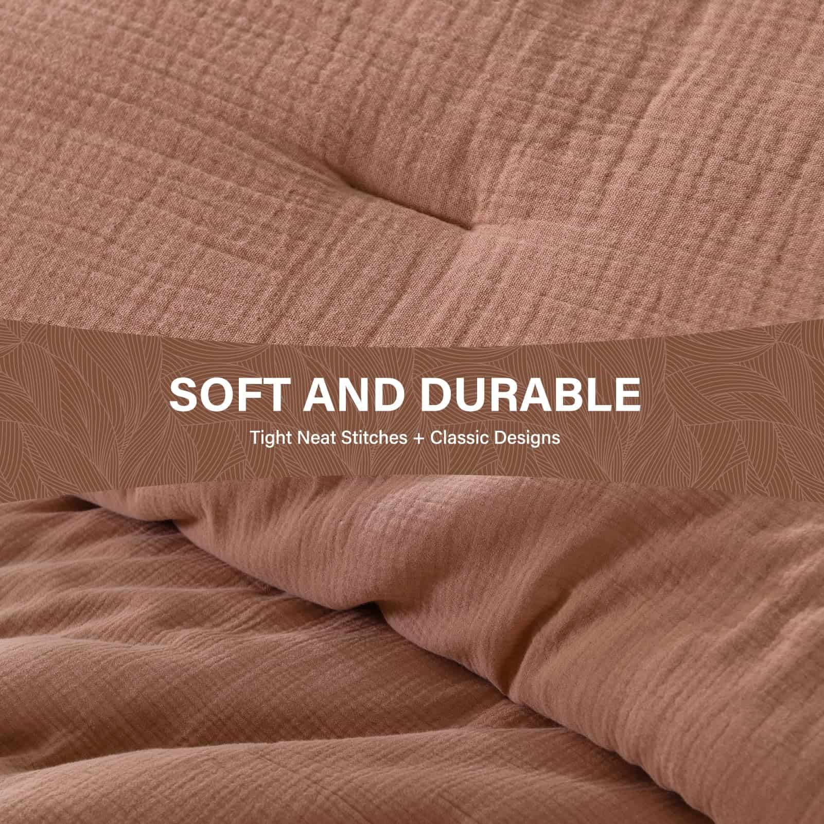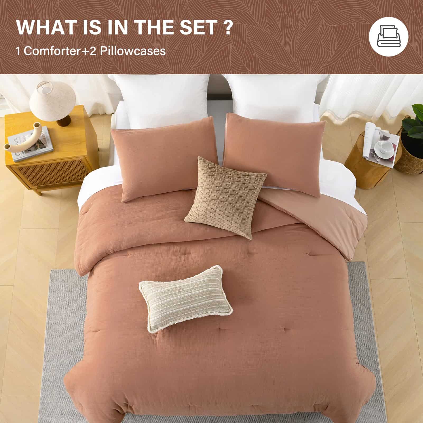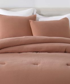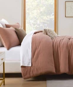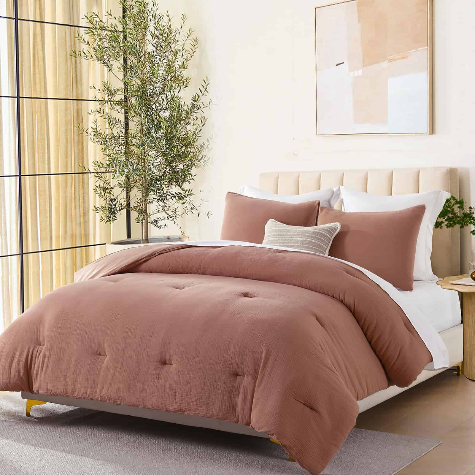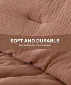 Además de su comodidad sin igual, este Juego de Edredón también es una declaración de estilo. El suave tono rosa polvoriento es elegante y versátil, combinando fácilmente con una variedad de estilos de decoración de dormitorios. La parte delantera de tela de gasa de algodón agrega textura y transpirabilidad, mientras que la parte trasera de algodón sedoso garantiza un tacto suave y agradable para la piel. Ya sea en la habitación principal, la habitación de invitados, el dormitorio o incluso en un viaje de campamento o en tu RV, este juego de edredón elevará instantáneamente la estética de tu espacio.