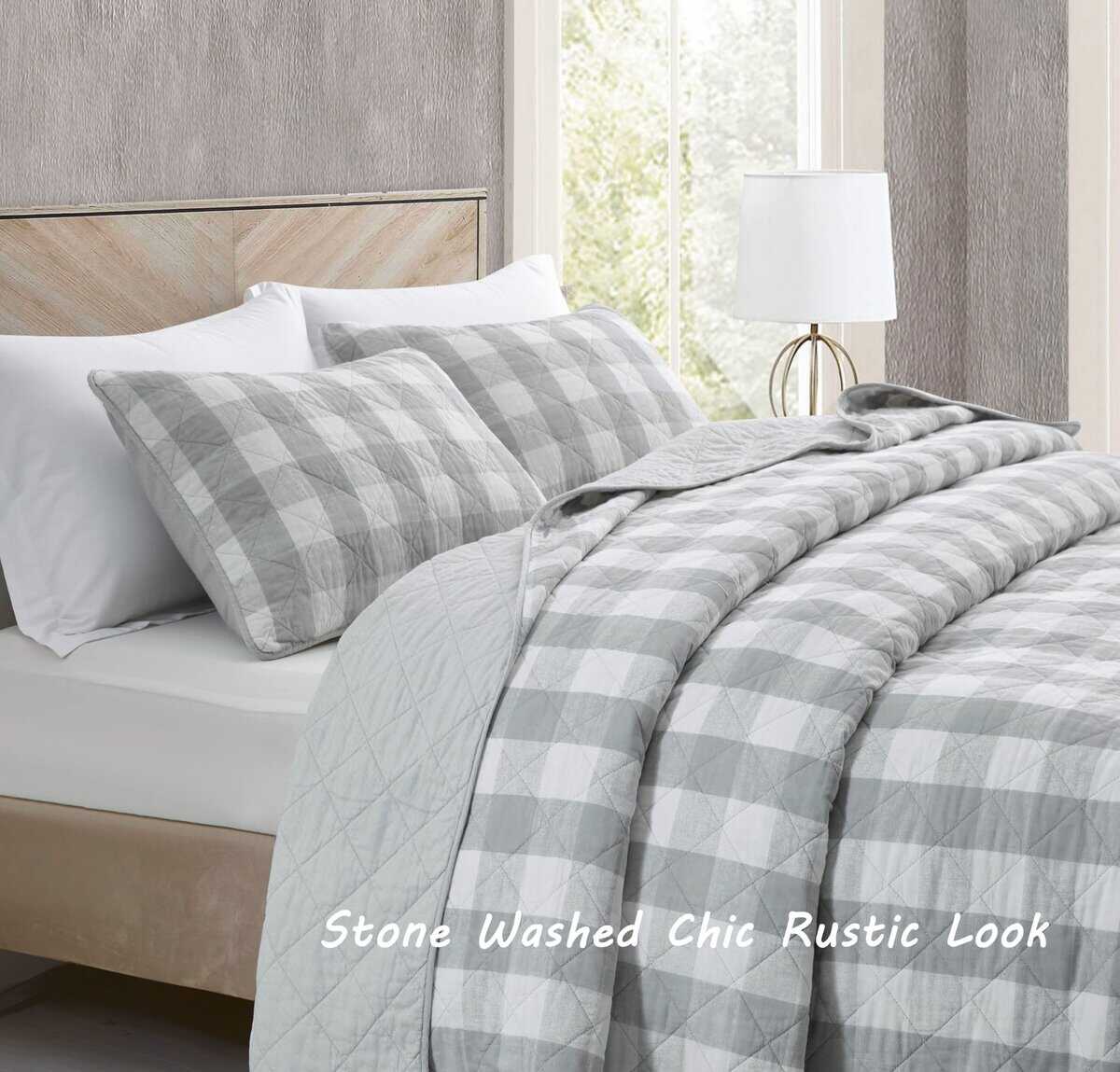 Un clásico atemporal juego de edredón de patrón de cuadros buffalo check que sirve como un hermoso punto focal en tu dormitorio o habitación de invitados o una bonita pieza de capas para completar tu decoración de dormitorio. Su ambiente rústico exhibe una vibra tranquila y relajante para brindar una experiencia de sueño más cómoda. Hecho con una opción reversible de un estampado sólido en la parte trasera. Ligero pero no falto de calor, proporcionando comodidad transpirable para su uso durante todo el año, el edredón está hecho de 100% algodón y stone-washed para una sensación súper suave.