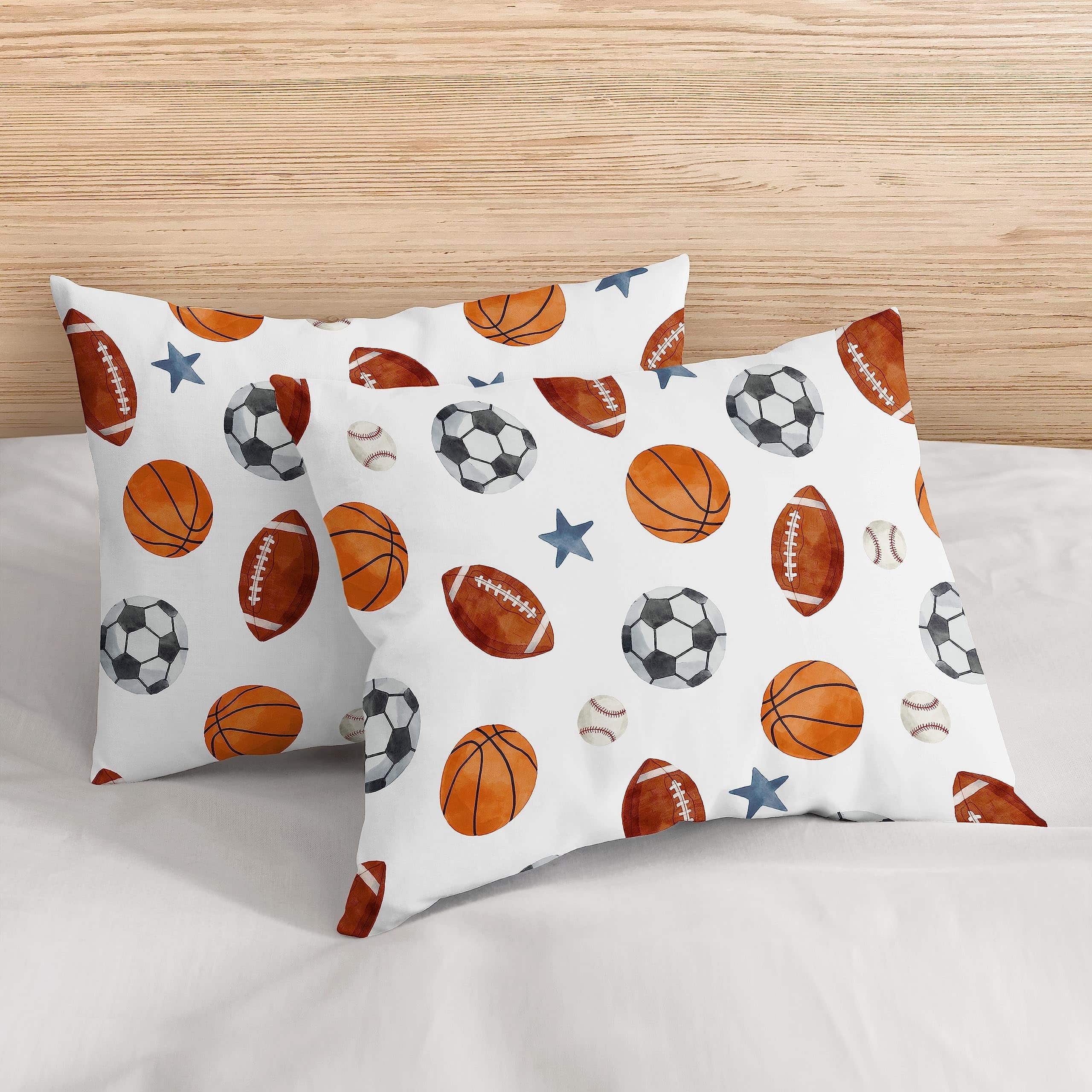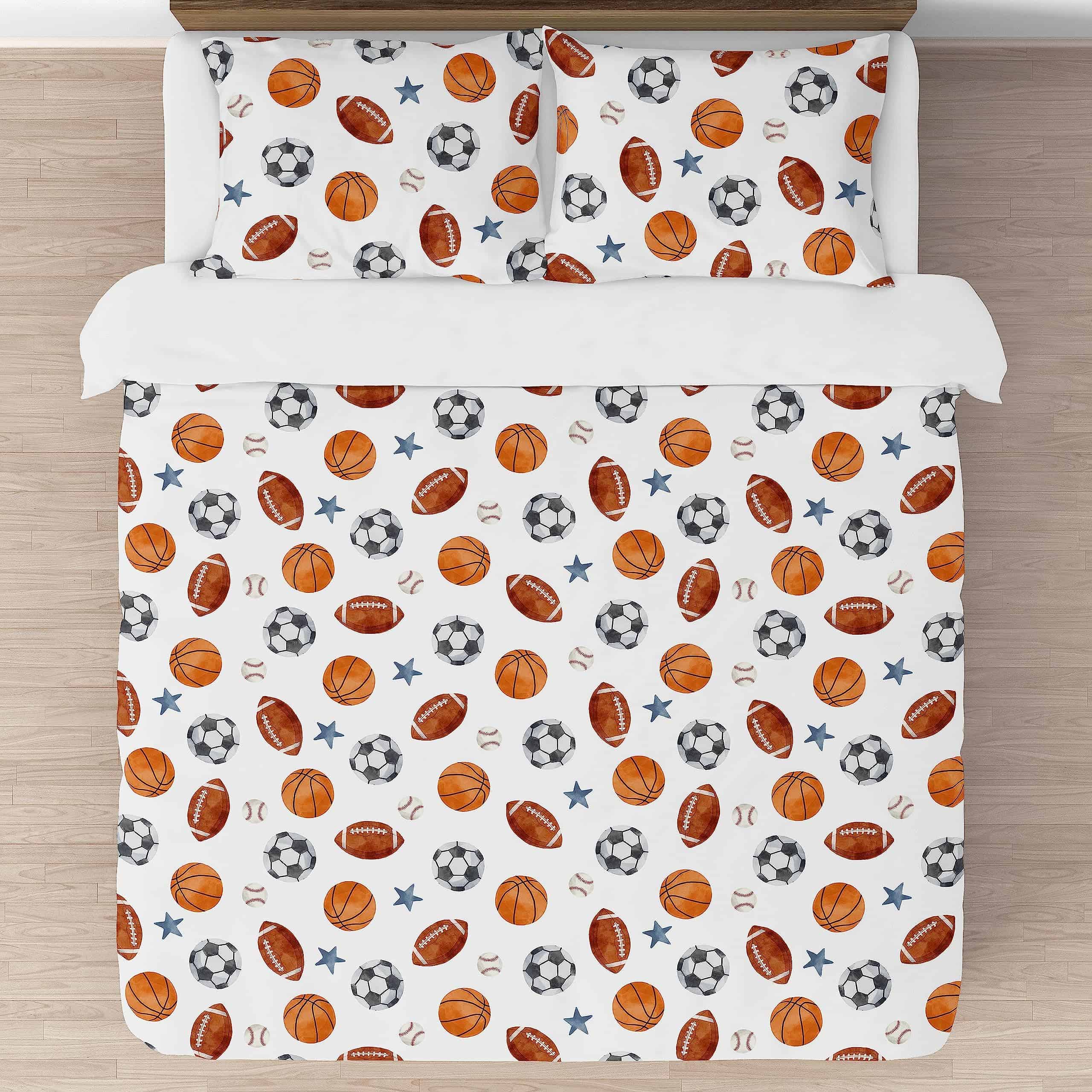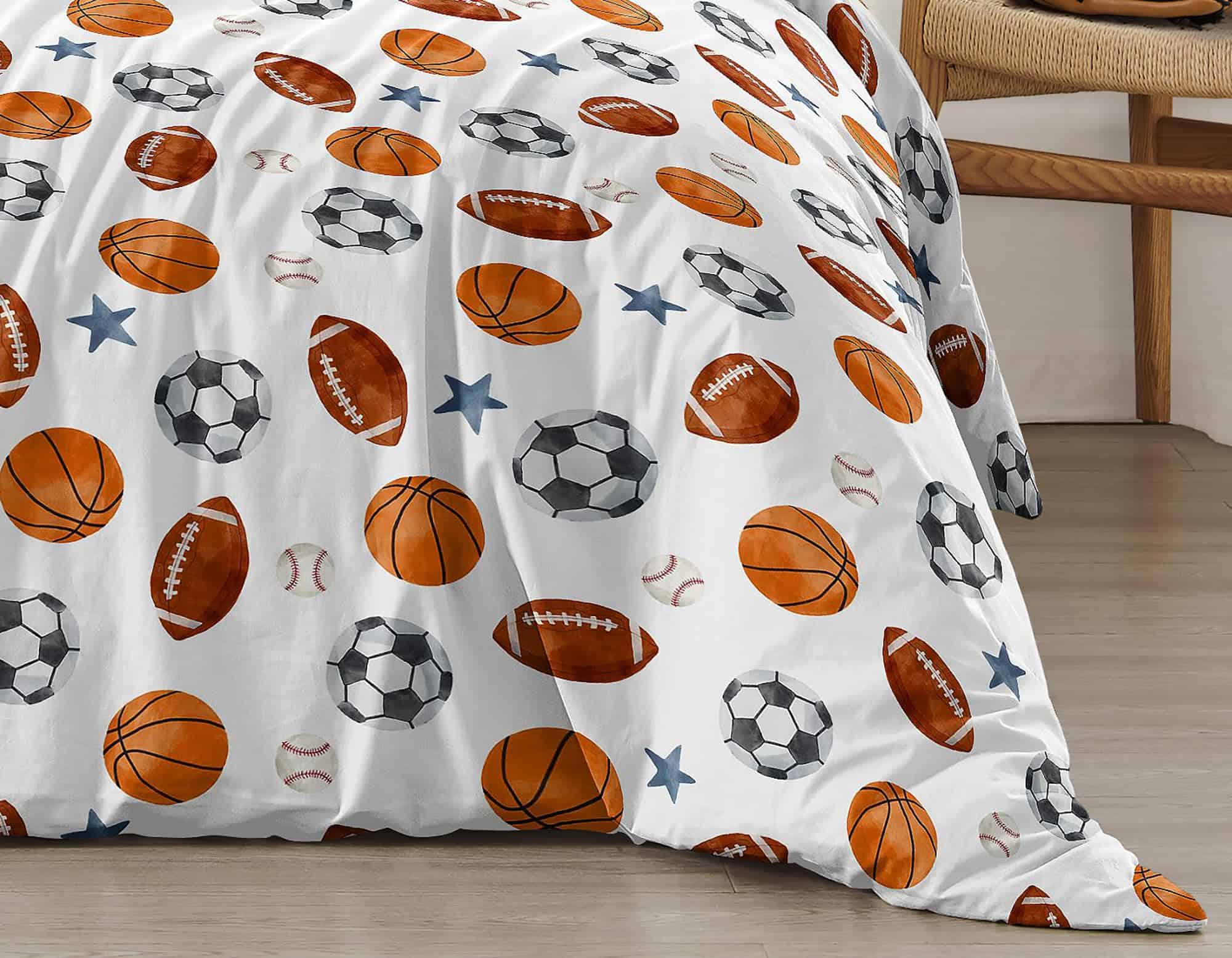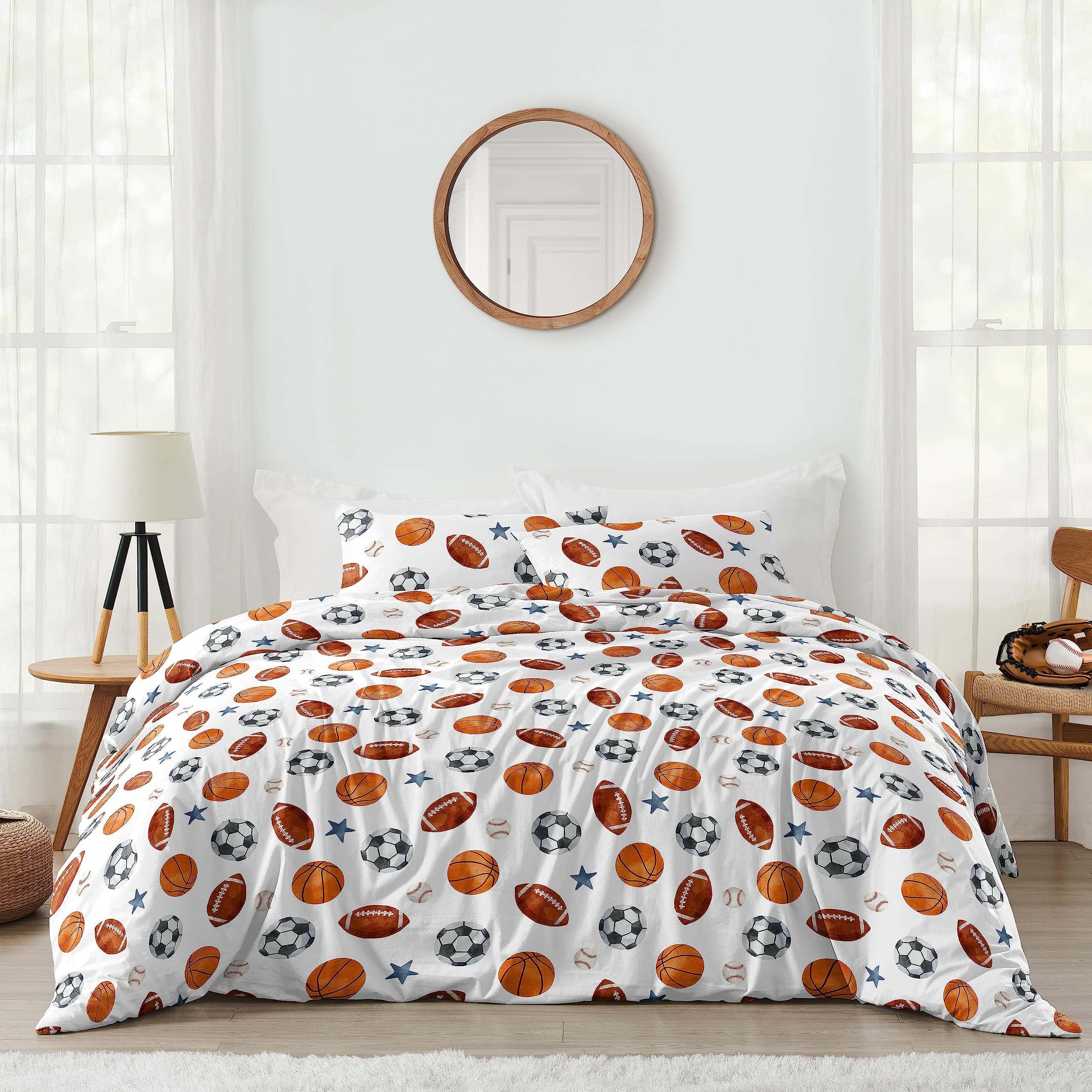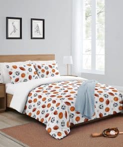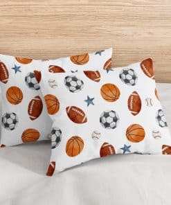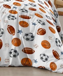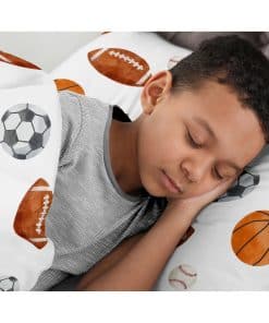Este juego cuenta con una variedad de balones de fútbol pintados a mano en blanco y negro, balones de fútbol americano marrones, balones de baloncesto naranjas, balones de béisbol blancos y rojos y estrellas azules vintage en acuarela. Este juego está hecho de telas exclusivas de microfibra cepillada y es lavable a máquina. Secar a baja temperatura. Si te gusta el estilo de tela, Sweet Jojo Designs también ofrece ropa de cama coordinada y accesorios de decoración.