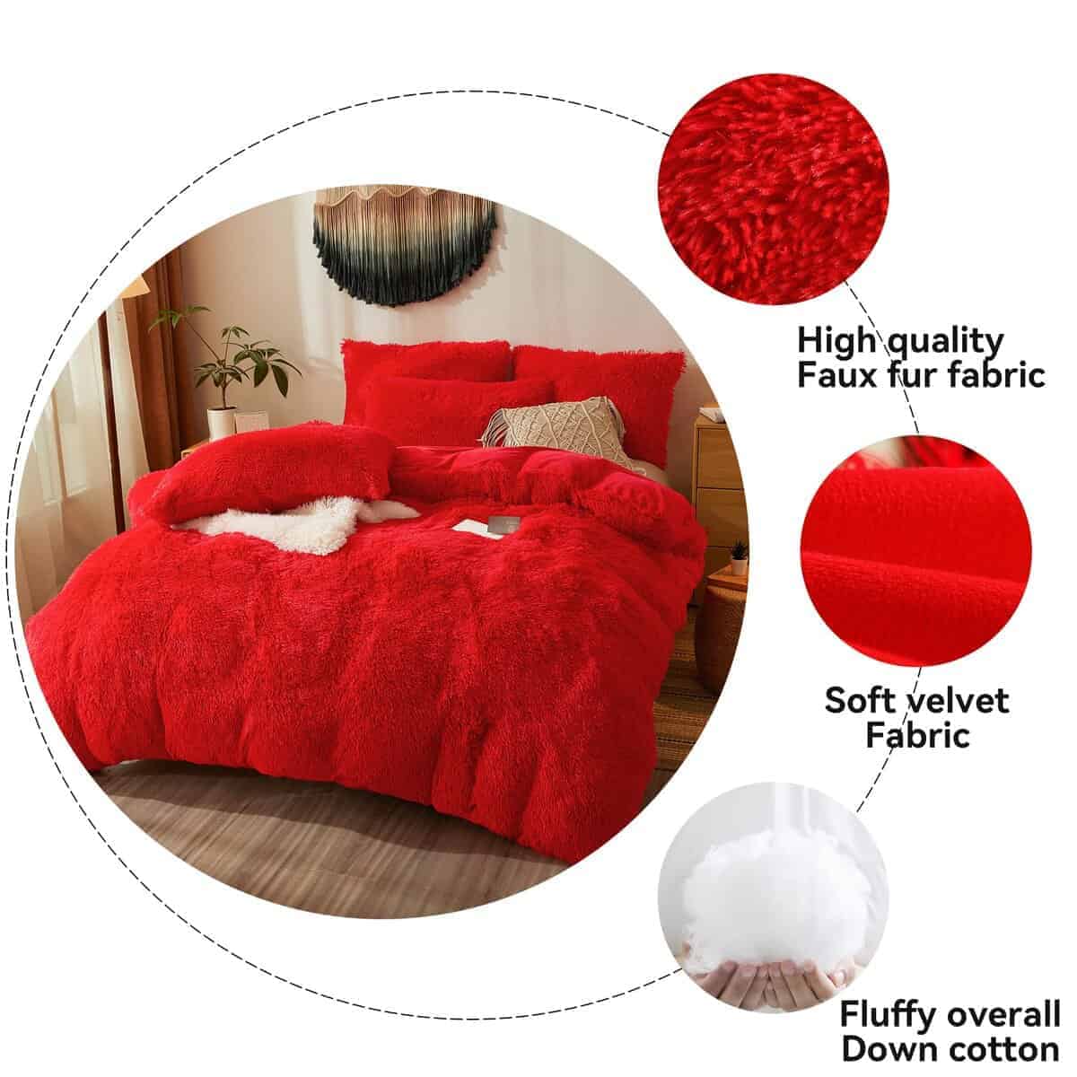 Incluye un edredón de felpa rojo tamaño queen (90×90 pulgadas) y dos fundas de almohada estándar peludas (20×26 pulgadas). Fabricado con telas de felpa suave de lujo con un relleno de microfibra elástica de alta calidad, este edredón suave y esponjoso brinda un placer y una lujuria ilimitados. Perfecto para combinar con todos los estilos de tu habitación, cama y granja. Hecho de telas de felpa suave, este juego de ropa de cama de felpa roja está bien ventilado, amigable para la piel y acogedor, especialmente para aquellos que duermen sin ropa. Creemos que quedarás fascinado por este lindo juego de edredón. El juego de edredón suave te brinda una experiencia de sueño como si estuvieras en las nubes. Ligero y muy bien ventilado, este juego delgado de edredón rojo está relleno de suficiente material para que sea más esponjoso, especialmente en invierno para mantenerte cálido. Tecnología de costura excelente y un relleno de fibra que no se desplaza en ambos lados. Acuéstate en este juego ligero y disfruta de un sueño reparador. Este juego de edredón rojo es una excelente opción como regalo para tus seres queridos, ya sea para adultos, niños o niñas en diferentes festividades como el Día de San Valentín y Navidad. Si tienes alguna necesidad o pregunta, no dudes en contactarnos por correo electrónico y te brindaremos una solución satisfactoria de manera oportuna. Tu experiencia de compra siempre será nuestra máxima prioridad.