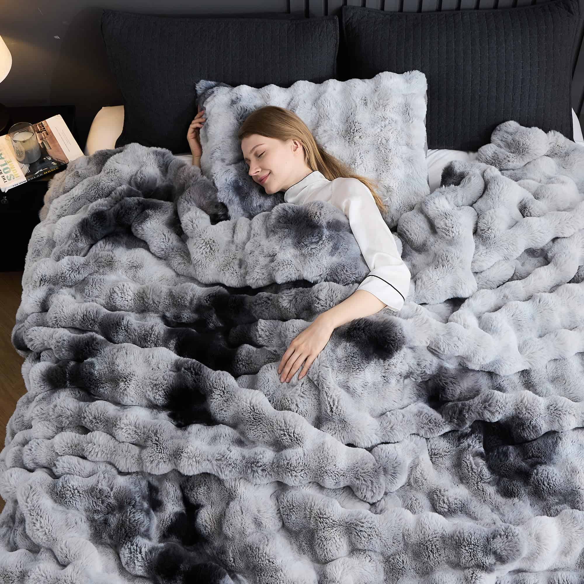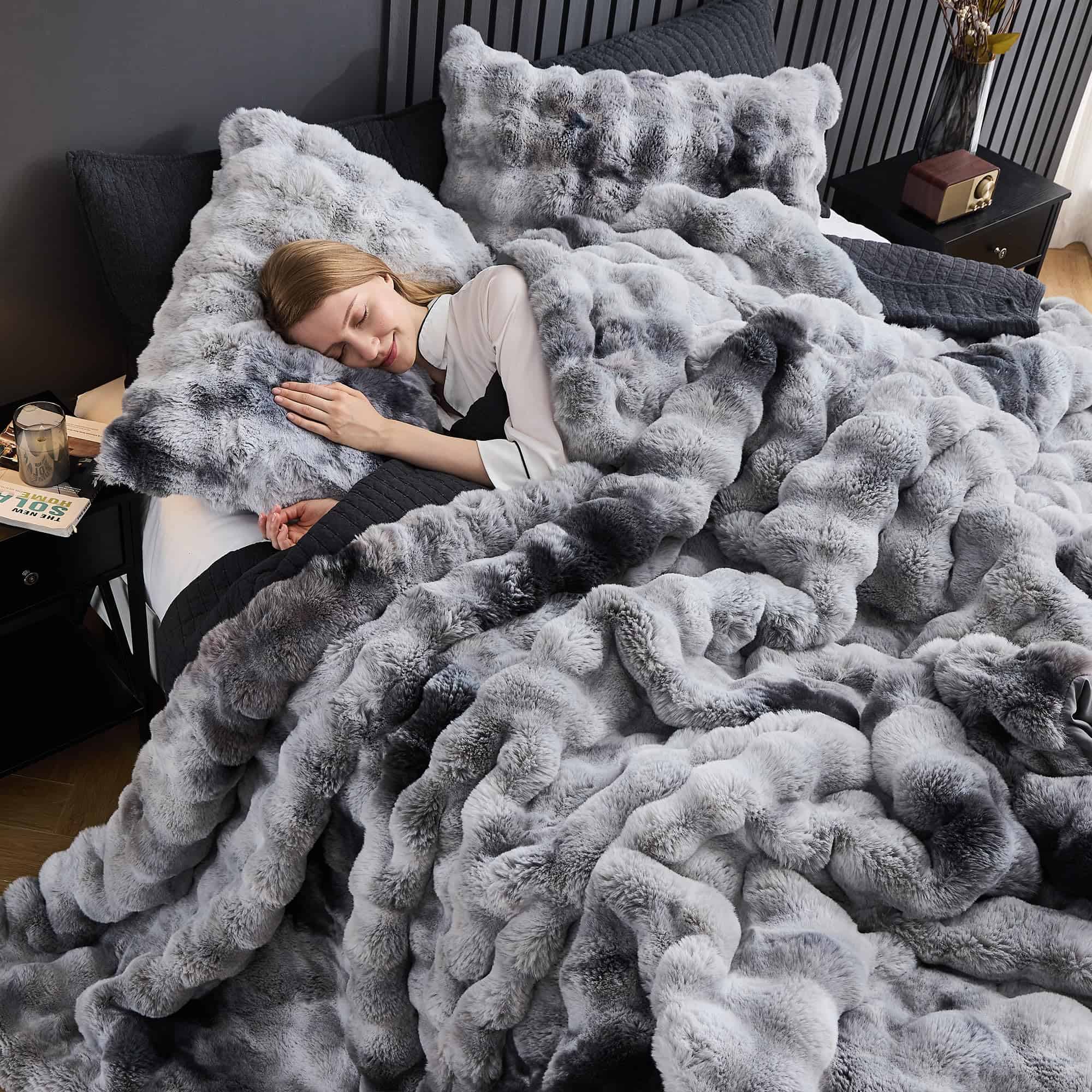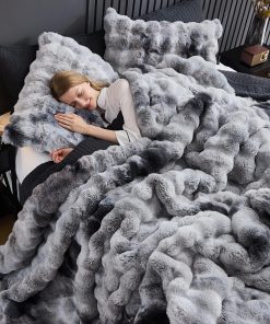 Nuestro juego de edredón de piel sintética de conejo está hecho de un 100% de suave felpa, con un suave tejido cepillado en la parte trasera, ultrasuave y cálido para ti y tu familia en el invierno. El diseño de tinte anudado en la parte delantera y el diseño de burbujas lo hacen más lujoso y cómodo, ofreciendo la sensación más cómoda al dormir. El diseño de burbujas junto con un tejido trasero de gamuza lavada proporciona lados ultrasuaves y cómodos con acolchado en el medio, brindando una sensación nubosa y cálida que envuelve toda la noche. Lavable a máquina, lavar a máquina a temperatura ambiente, secar al sol o en secadora. No usar lejía ni planchar. Nuestro edredón se entrega en un paquete sellado al vacío. Golpee suavemente el edredón y permítale descansar hasta 48 horas para restaurar su máxima esponjosidad. También puede secarlo en secadora a baja temperatura.