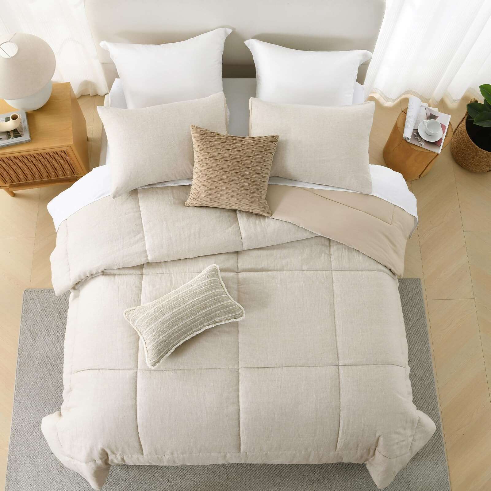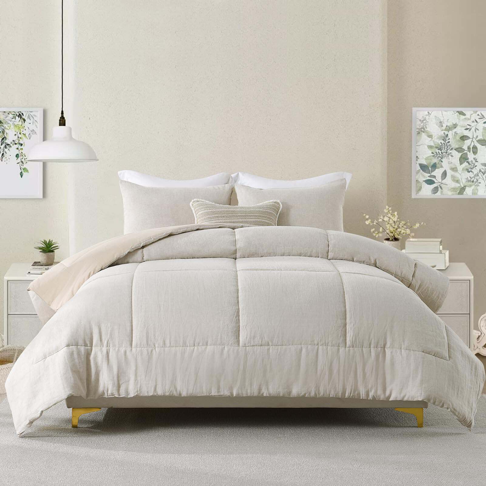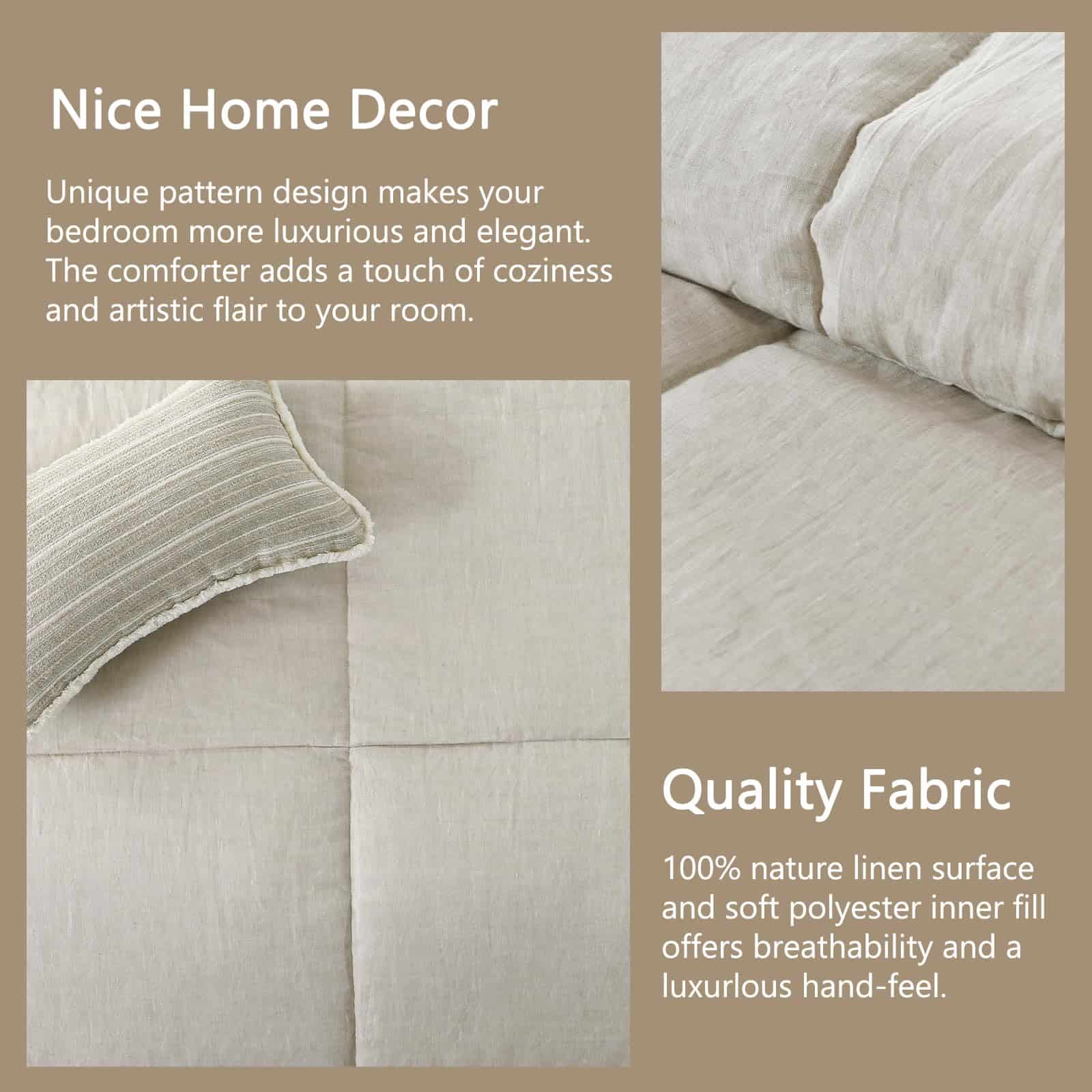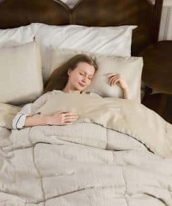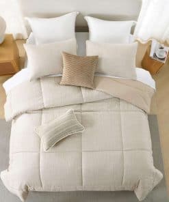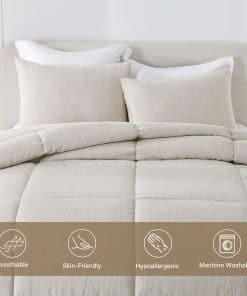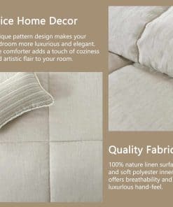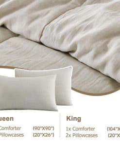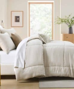El juego de edredón de lujo Finlonte Queen es la elección perfecta para aquellos que buscan combinar elegancia y comodidad en su dormitorio. La parte delantera de lino puro proporciona una superficie natural y transpirable, ideal para garantizar un sueño reparador durante todo el año. En contraste, la parte trasera de algodón suave y duradero ofrece una sensación de lujo y comodidad extra. El relleno de poliéster de alta calidad garantiza un confort excepcional y calidez en las noches más frías. El diseño clásico de cuadros minimalista en color lino crea una atmósfera discreta pero lujosa y elegante en cualquier habitación. Las delicadas costuras y los exquisitos detalles de fabricación agregan un atractivo visual sin igual a este juego de edredón. Con un tamaño de 90″x90″, el set incluye 1 edredón queen y 2 fundas de almohada coordinadas de 20″ x 26″ + 2″. El juego de edredón es perfecto para usar durante todas las temporadas, manteniéndote abrigado en invierno y fresco en verano. El diseño acolchado garantiza una distribución uniforme del relleno en el interior del edredón, mientras que las costuras ajustadas evitan que el relleno se desplace, asegurando su durabilidad a lo largo del tiempo. Además, el juego de edredón es fácil de mantener: se puede lavar a máquina en ciclo suave con agua fría y luego secar al sol o planchar para restaurarlo a su estado original. El juego de edredón Finlonte Queen ha sido certificado Standard 100 por OEKO-TEX, lo que garantiza que cumple con los criterios de prueba más rigurosos para productos químicos dañinos, siendo seguro incluso para personas con alergias. Disfruta de un descanso de ensueño con este exquisito y confortable juego de edredón de lujo.