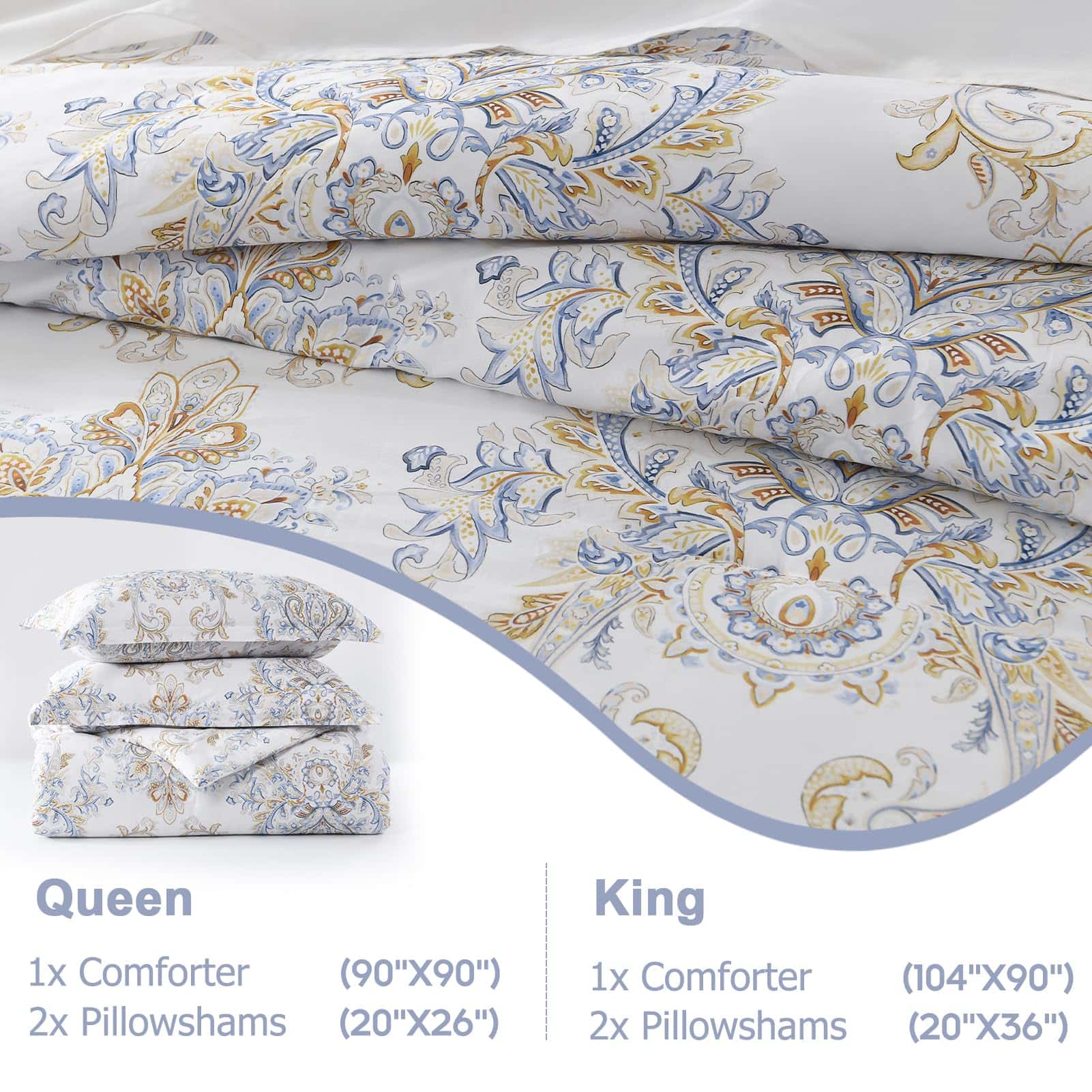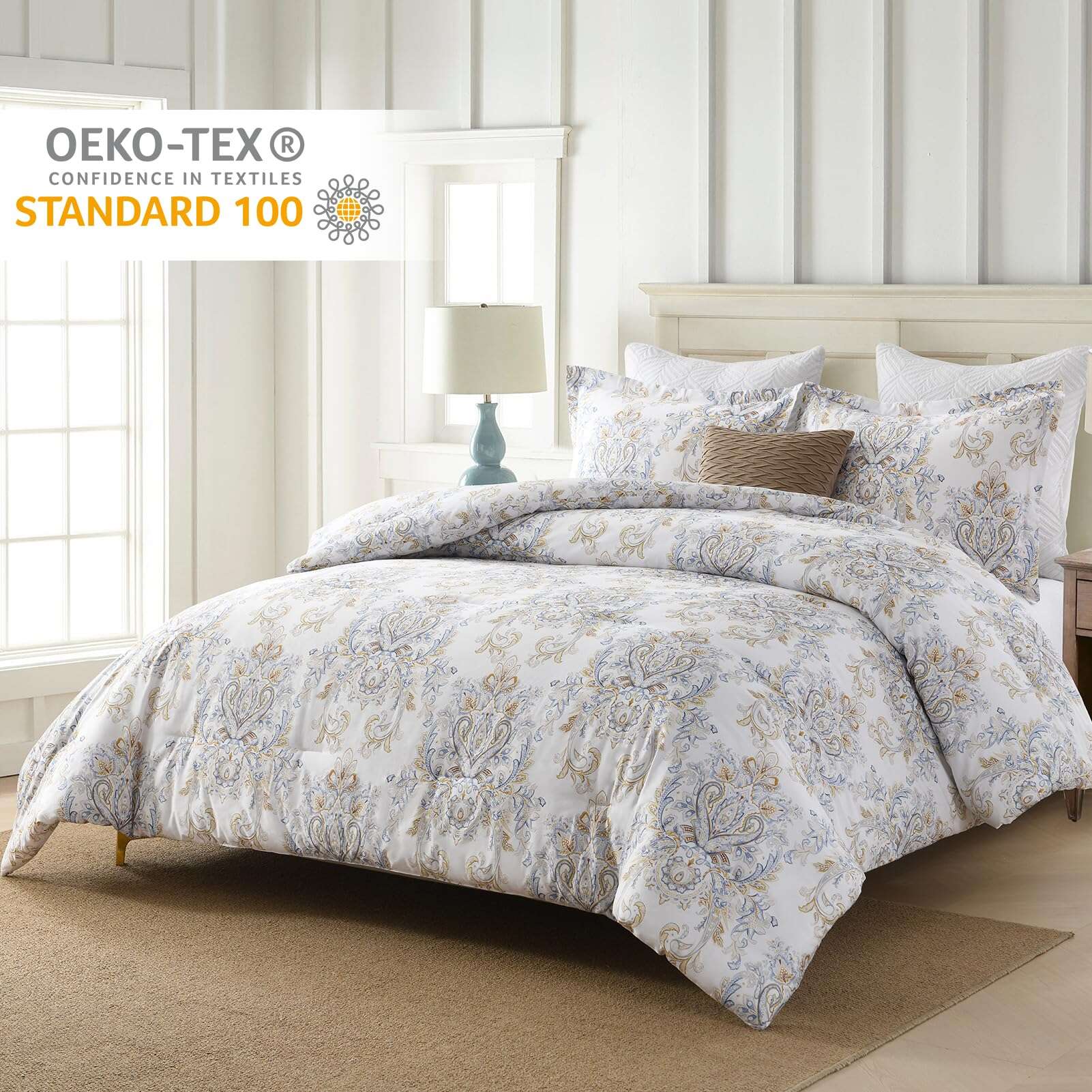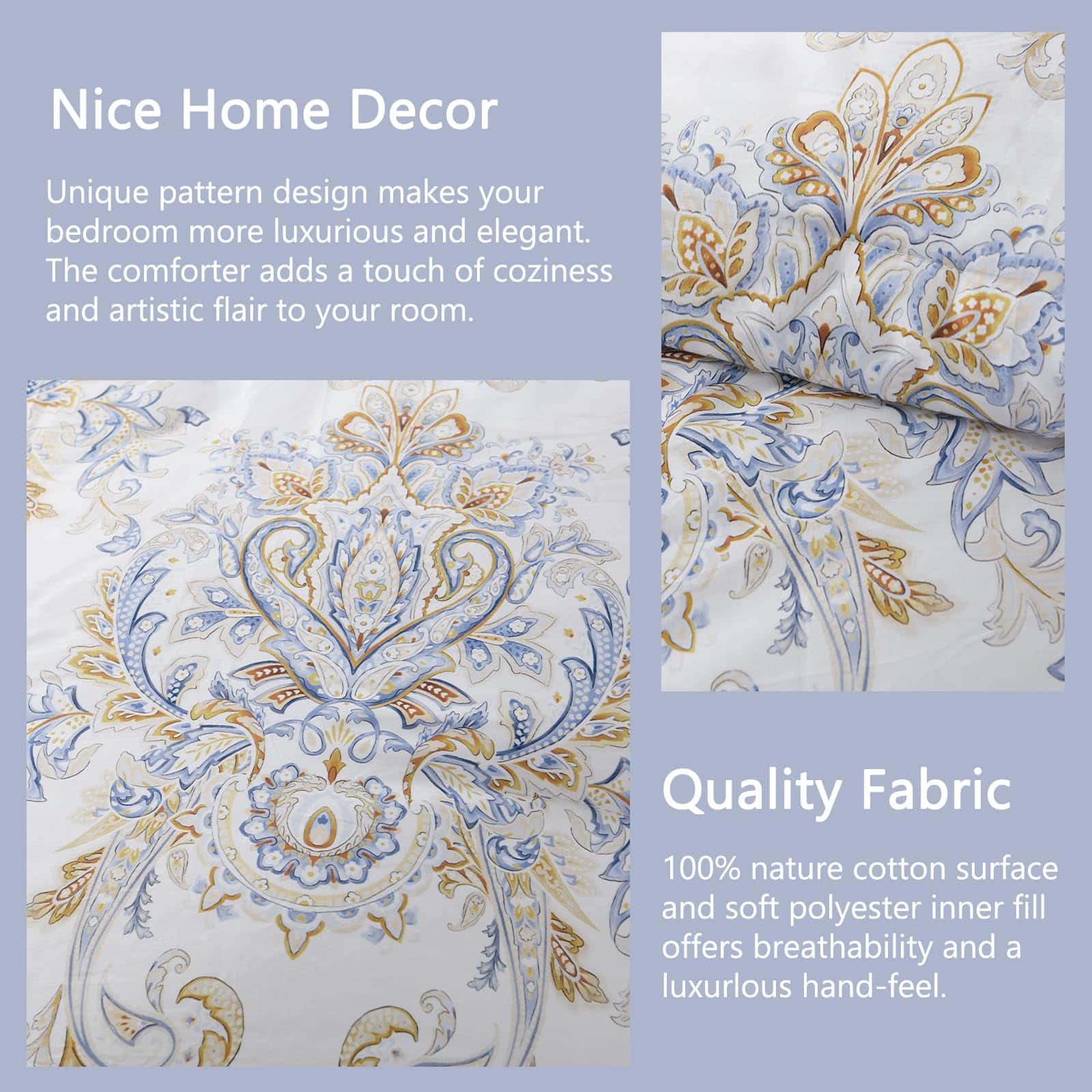 1. Suavidad y comodidad: Este edredón de tamaño queen está confeccionado con una superficie de algodón 100% de fibra larga y un relleno interno de poliéster suave, más saludable y suave para la piel, suavidad y tacto suave como una nube para disfrutar de una noche de sueño reparador. 2. Estilo exquisito y lujoso: Estilo moderno lujoso en color blanco, oro y azul con diseño floral de panales, creando una atmósfera sobria pero lujosa y digna. Con telas exquisitas y costuras delicadas, añade un atractivo estético sin precedentes a tu espacio. 3. Juego de 3 piezas: El juego de edredón de tamaño Queen incluye 1 edredón (90″ x 90″) y 2 fundas de almohada (20″ x 26″ + 2″). Dado que el juego de edredón se encuentra en envase al vacío, se recomienda golpear suavemente la cubierta unas cuantas veces antes de usarla por primera vez para que recupere su esponjosidad. 4. Uso para todas las estaciones: El juego de edredón es ideal para usar durante todo el año, manteniéndote cálido en el invierno y fresco en el verano. El edredón cuenta con un diseño acolchado para una distribución uniforme del relleno en su interior, y las costuras ajustadas evitan que el relleno se desplace para garantizar un uso a largo plazo. 5. Fácil mantenimiento: El juego de edredón es duradero y fácil de mantener. Lavar a máquina en ciclo suave con agua fría y secar al sol o planchar para una restauración como nueva, no usar lejía para mantener el color vibrante. 6. Certificación de seguridad: Este juego de edredón está certificado por Standard 100 de OEKO-TEX por cumplir con los criterios de prueba más altos para productos químicos dañinos y se ha comprobado que es inofensivo para los humanos. Es la mejor opción para personas con alergias.