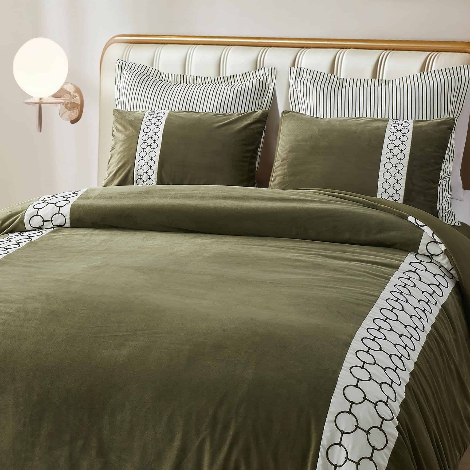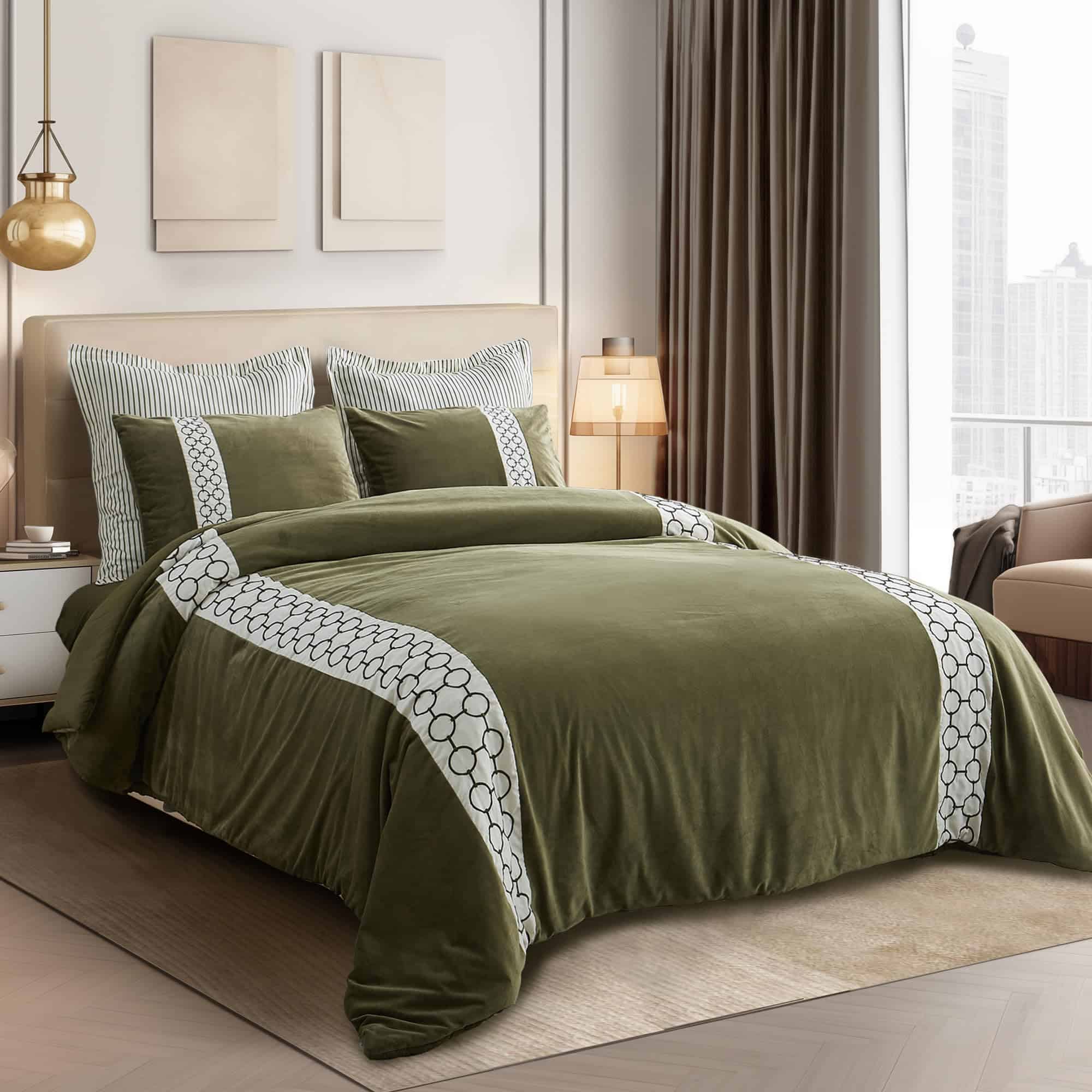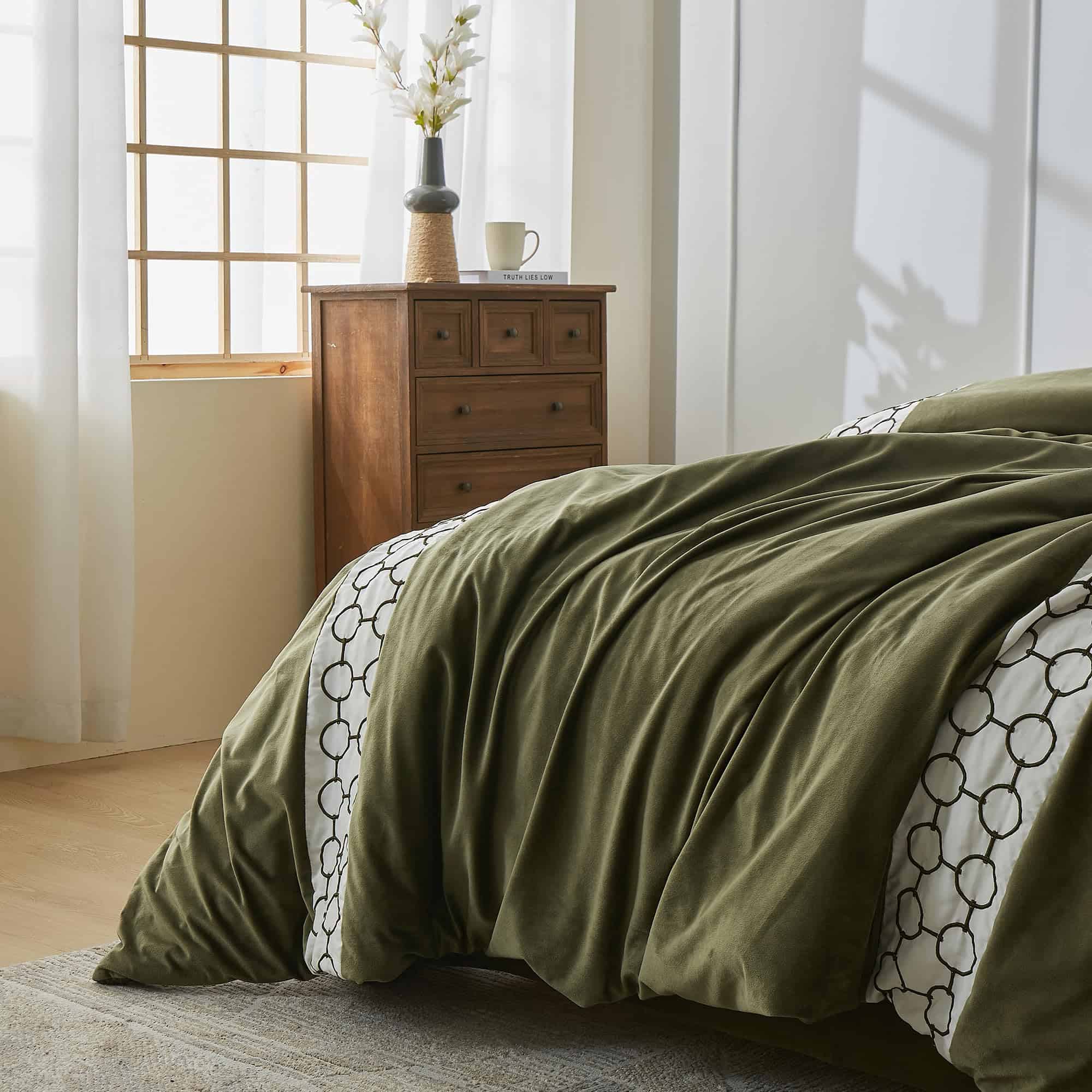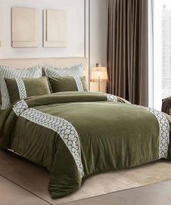 Transforma tu dormitorio en un refugio cálido y acogedor con el Edredón Maravilloso. Sus tonos rústicos en Verde Militar y sus lujosos tejidos aportan un toque de elegancia inspirada en lodges a tu espacio. El rostro del edredón presenta una textura de terciopelo de algodón suave al tacto, conocido por su suavidad y calidez, realzado con elegantes bordados. La parte trasera cuenta con un tejido de cepillado lavado suave y respetuoso con la piel, lo que lo convierte en una elección ideal para aquellos que valoran tanto la comodidad como el estilo en su ropa de cama. Los detalles añaden un toque personalizado, convirtiendo tu cama en una pieza declarativa. Este set de 3 piezas incluye todo lo que necesitas para un look cohesivo: edredón king (106″ x 94″), 2 fundas de almohada (20″ x 36″). Las almohadas cuentan con intrincados bordados e inlayers, complementando perfectamente los tejidos de la parte superior de la cama. Experimenta el equilibrio perfecto entre calidez y comodidad con este edredón. El tejido de microterciopelo está diseñado para mantenerte acogedor durante el invierno mientras sigue siendo lo suficientemente ligero para la comodidad en los meses más cálidos. Nuestros juegos de edredón cuentan con la certificación Oekotex 100, lo que garantiza que está libre de más de 400 sustancias nocivas para una elección segura y responsable. Disfruta de la conveniencia de ropa de cama lavable a máquina. Simplemente sigue las instrucciones de cuidado para un mantenimiento sin complicaciones, asegurando que tu set se mantenga fresco y hermoso durante todo el año.