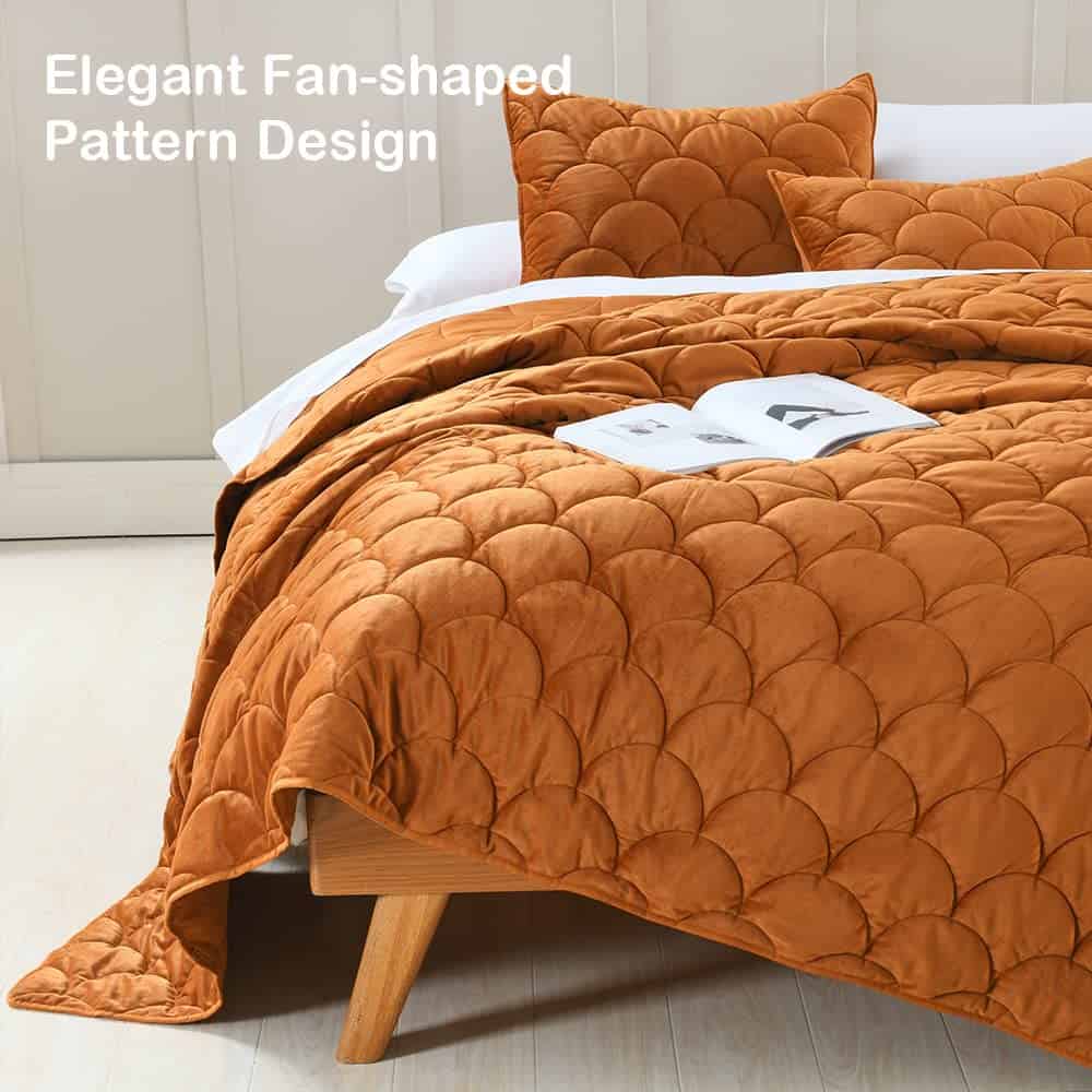 1. Un Juego de Edredón de Terciopelo Perfecto Este es un bonito juego de edredón ligero, la calidad y la artesanía son sólidas. Tiene un poco de brillo debido al microfibra de terciopelo. La funda de almohada a juego también está hecha de terciopelo, se siente muy agradable en su cabeza y cara. El material es muy suave. Se siente bien en la piel. 2. Diseño de Patrón en Forma de Abanico: Diseño de patrón en forma de abanico simple pero elegante, aspecto único y chic, gran combinación con tela de terciopelo lujoso. Definitivamente especial para tu dormitorio. 3. Tamaño Completo/Queen Incluido: 1 Colcha de 90″ x 96″, 2 Fundas de Almohada de 20″ x 26″. 4. FÁCIL CUIDADO – Este edredón es fácil de cuidar y resistente a la decoloración, arrugas y encogimiento. Lavar a máquina por separado en agua fría, secar a baja temperatura, no usar lejía. 5. Postventa – Puede haber alguna diferencia de color bajo diferentes luces. Si tiene alguna pregunta sobre color/talla o calidad, por favor contáctenos. Estamos dispuestos a ayudar.