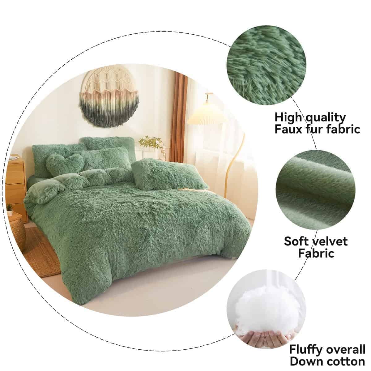 Este juego de ropa de cama de piel sintética incluye un edredón verde de piel y dos fundas de almohada estándar de peluche. Te llevarás un auténtico edredón de peluche y una funda de almohada de peluche en lugar de una funda nórdica y dos fundas de almohada. Fabricado con un tejido de piel sintética de alta calidad y un relleno de microfibra elástica de alta calidad, este edredón es perfecto para disfrutar de un sueño reconfortante y una sensación lujosa sin límites. Es ideal para combinar con todos los estilos en tu habitación, cama y casa de campo. ¡El edredón verde de felpa full size es una excelente opción para regalar a tu amor, a niños y niñas! Fabricado con tejidos de piel sintética, este juego de ropa de cama de piel verde es muy ventilado, respetuoso con la piel y acogedor, especialmente para los durmientes descalzos. Creemos que quedarás fascinado por este lindo juego de edredón. Este juego de ropa de cama de piel suave te brinda una experiencia de sueño como en las nubes. Ligero y bien ventilado, este juego de edredón de piel verde está relleno con bastante relleno para ser más esponjoso, especialmente en invierno, ¡manteniendo muy caliente! Tecnología de costura excelente y cableado idéntico en ambos lados para no desplazamiento del relleno. ¡Acuéstate en el juego de edredón ligero y disfruta de un sueño reparador! Este juego de edredón verde peludo es una excelente opción para regalar a tu amor, a niños y niñas en varias festividades como el Día de San Valentín y Navidad. Si tienes alguna necesidad o pregunta, avísanos por correo electrónico y te proporcionaremos una solución satisfactoria de manera oportuna. ¡Tu experiencia de compra siempre será nuestra máxima prioridad!