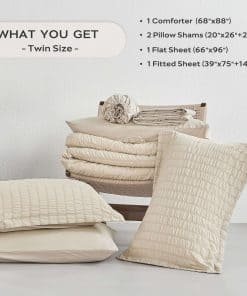 El juego de edredón JELLYMONI Seersucker en tamaño Twin con Ropa de Cama Esponjosa en Crema Gris es la elección perfecta para aquellos que buscan una combinación de estilo y comodidad en su habitación. Confeccionado con 100% microfibra, este juego de cama garantiza un calor excepcional y una sensación acogedora para que puedas disfrutar de un sueño tranquilo durante todo el año. El edredón presenta un aspecto único ‘arrugado’ en el frente, que contrasta con la parte posterior lisa, brindándote un toque de estilo sin esfuerzo. Con costuras sólidas en todo momento, el edredón ofrece una durabilidad mejorada, evitando eficazmente cualquier agrupamiento no deseado. Además, su diseño ligero proporciona una comodidad óptima sin importar la temporada.
