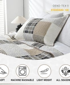 Este juego de edredón para cama king adopta un tono de color principal beige crema gris, mostrando una sensación elegante y sencilla. El diseño del patrón a cuadros en este juego de ropa de cama agrega un toque de atmósfera clásica y tradicional. En un día caluroso, puedes usar este edredón solo para acompañarte a dormir. En clima más frío, no solo sirve como decoración en la cama sino que también proporciona calor adicional. Su excelente transpirabilidad y ligereza evitan sudores nocturnos e incomodidades, asegurando una experiencia de sueño cómoda. Este juego de ropa de cama incluye 1 edredón (106″ x 98″) + 2 fundas de almohada (20″ x 36″). Un juego completo de edredón puede simplificar tu proceso de selección y mejorar el atractivo estético general y la coherencia estilística de tu ropa de cama. Este juego de ropa de cama está prelavado, ofreciendo un mejor tacto y reduciendo efectivamente el posterior encogimiento y decoloración. Lave el juego de edredón a máquina por separado en agua fría. Secar en línea o en secadora a baja temperatura. Evite el blanqueo para mantener su calidad. Después de varios lavados, el edredón de algodón se volverá más suave. Si tiene alguna pregunta sobre nuestros juegos de edredón, contáctenos. Responderemos a sus consultas lo antes posible y le proporcionaremos un servicio de alta calidad.