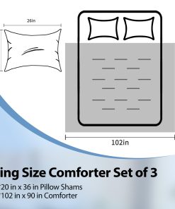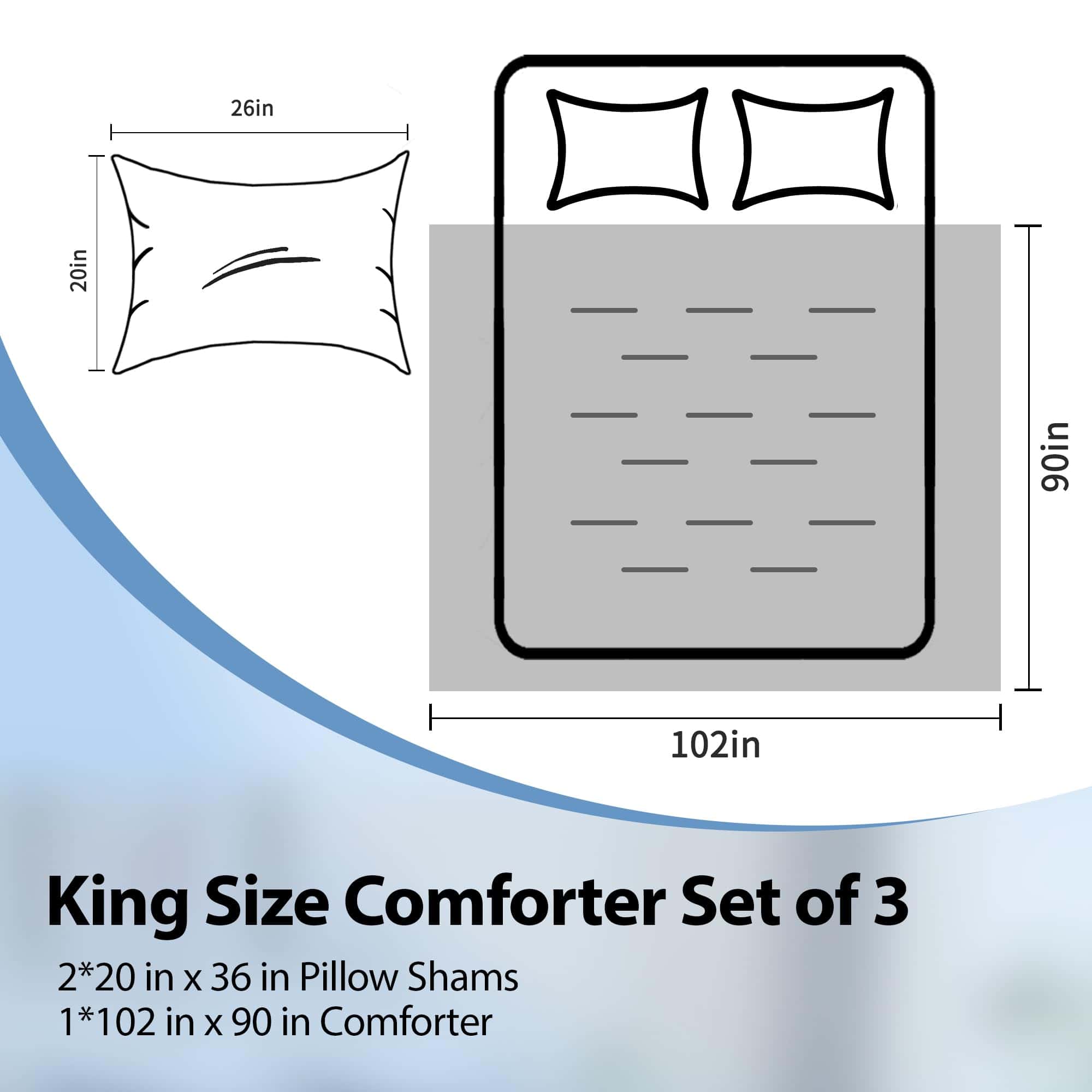 5. Lo que incluye: El juego de edredón King incluye 1 edredón (102 x90 ), 2 fundas de almohada (20 x36 ). Dado que el edredón viene en un empaque sellado al vacío, se recomienda lavarlo y secarlo a baja temperatura para hinchar el edredón antes del primer uso. O puedes exponerlo al sol y golpear suavemente, luego se hinchará nuevamente después de unas horas.