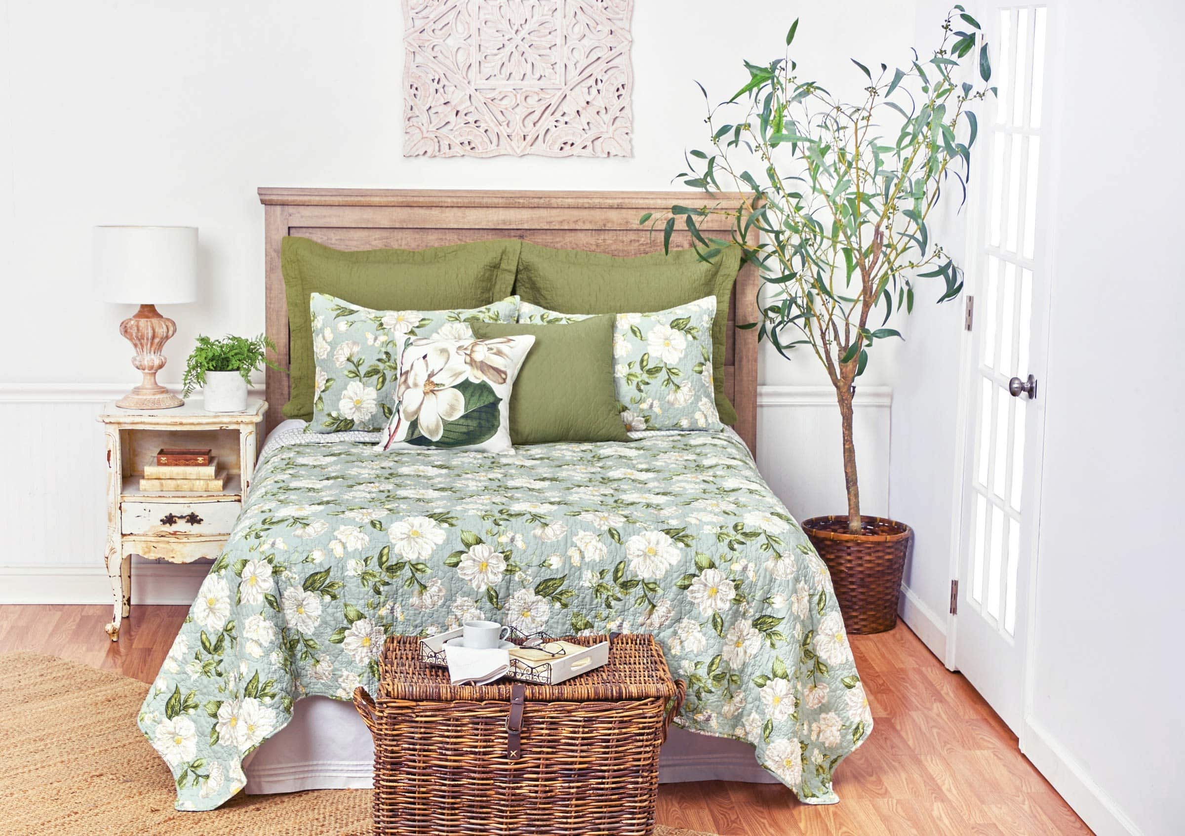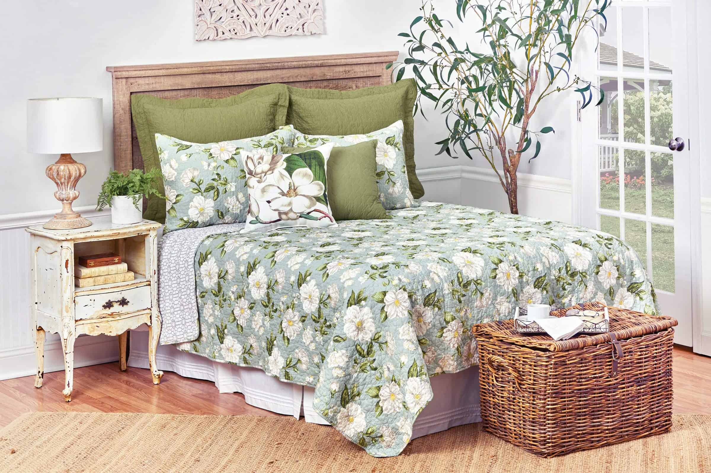 Este diseño floral creado en colaboración con WILLIAMSBURG transforma tu dormitorio con estilo de primavera y verano. Las grandes flores de magnolia y el fresco fondo azul de este juego de edredón king crean instantáneamente un refugio sereno en el dormitorio. El edredón Magnolia Garden también se invierte a un diseño de celosía impreso que se mezcla y combina con tus acentos favoritos, para que puedas crear tu propio estilo personalizado cualquier día del año.