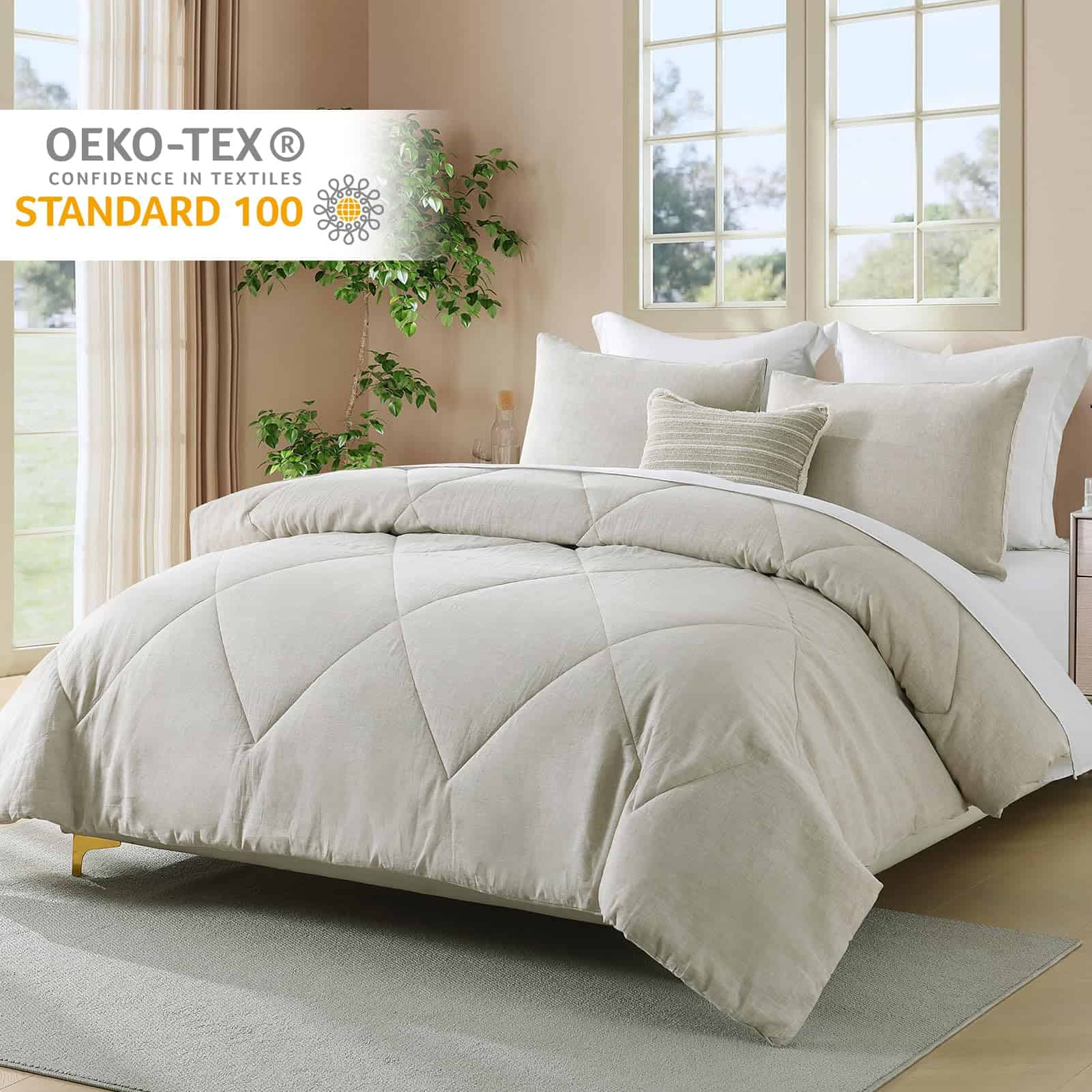 6. Certificado de Seguridad: Este juego de edredón está certificado por OEKO-TEX Standard 100 por cumplir con los criterios de prueba más altos para sustancias químicas dañinas y se ha encontrado que no son perjudiciales para los seres humanos. Es la mejor opción para personas con alergias.