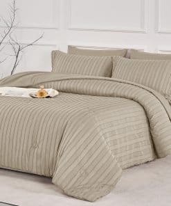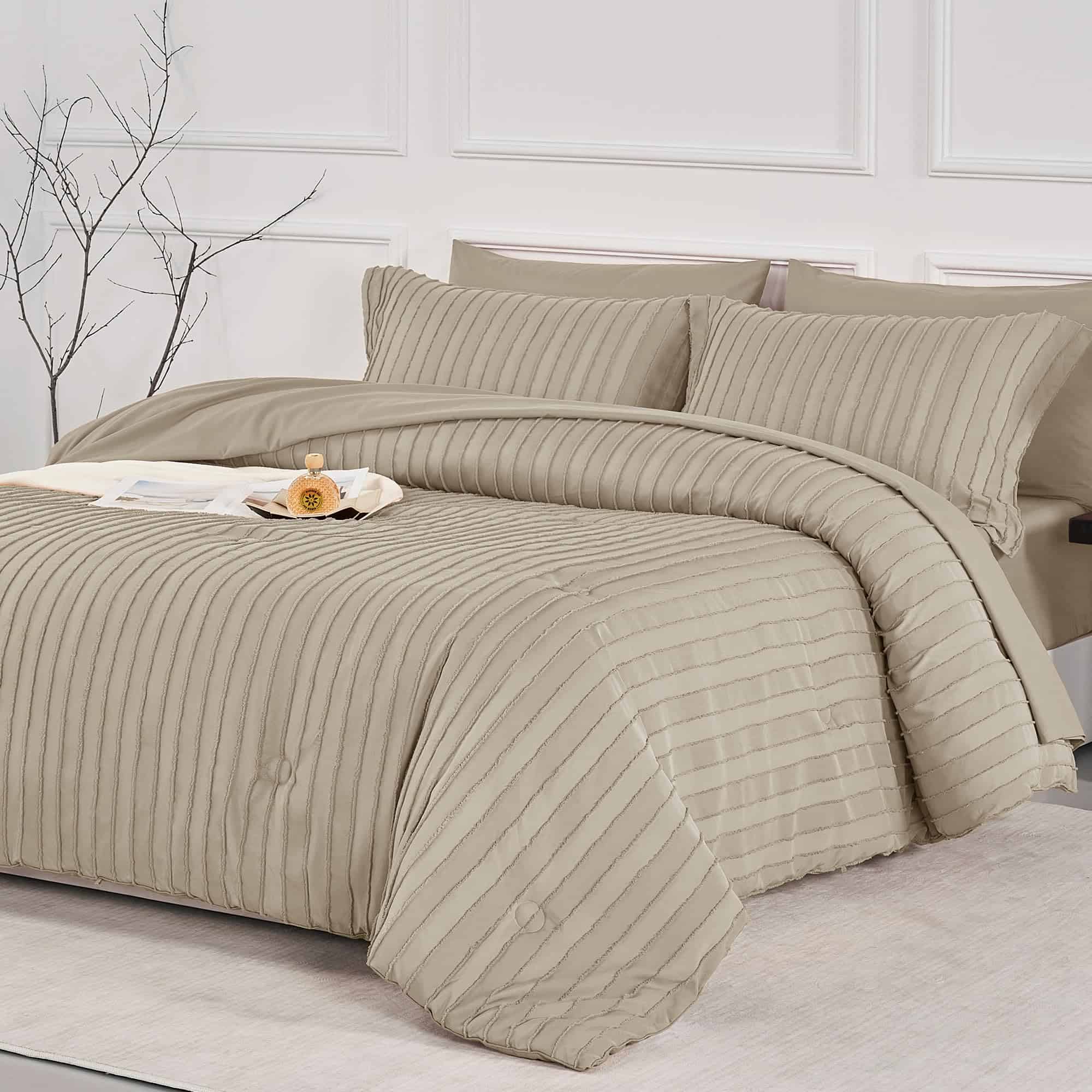 1. Material Premium: Nuestro juego de ropa de cama está hecho de microfibra lavada con textura jacquard, ofreciendo suavidad, transpirabilidad y ligereza para una excelente experiencia de sueño. El relleno de microfibra alternativa ultra suave del edredón es perfecto para aquellos alérgicos a plumas. El conjunto de ropa de cama cuenta con un diseño acolchado a rayas, agregando un toque de estilo bohemio para realzar la decoración de tu dormitorio. Sus colores simples hacen que sea fácil de coordinar con cualquier decoración de habitación.