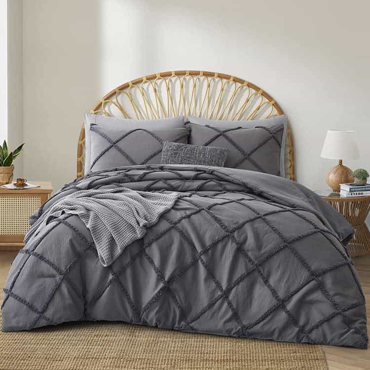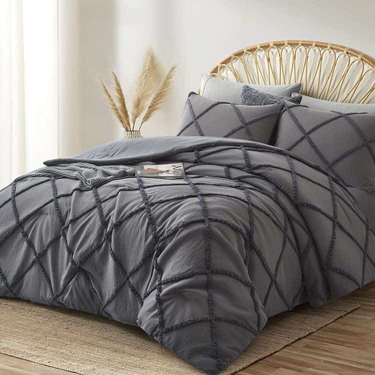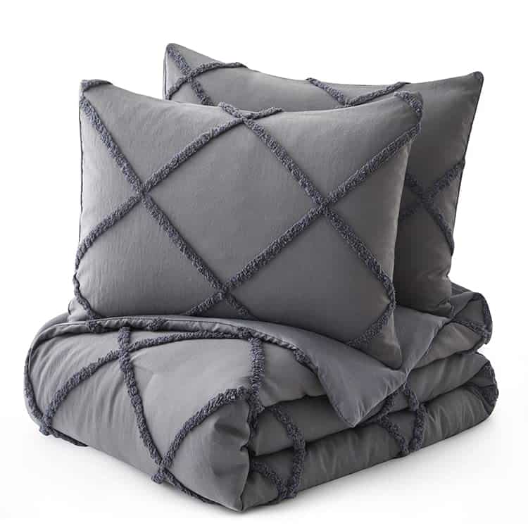 El juego de edredón shabby chic de Oli Anderson cuenta con un diseño oculto de costuras ordenadas que evita que el relleno se desplace o se agrupe después del lavado. El set de edredón tamaño King incluye 1 edredón gris (102″ x 88″) y 2 fundas de almohada (20″ x 36″) sin inserto de almohada. Fácil cuidado – Lavar a máquina en frío por separado en un ciclo suave/delicado. Secar en secadora a baja temperatura. Debido al envasado al vacío de los edredones, golpear suavemente para que quede esponjoso antes del primer uso.