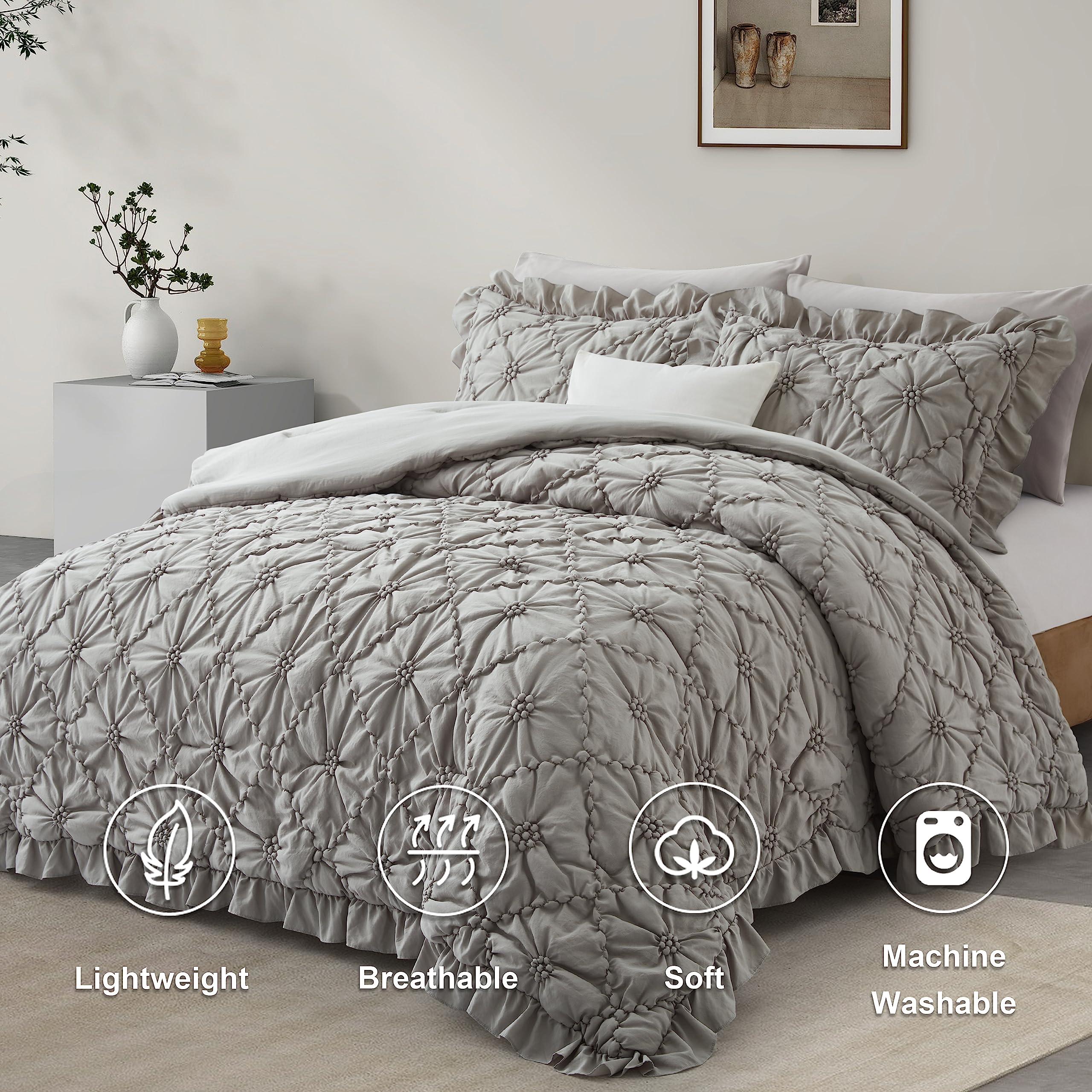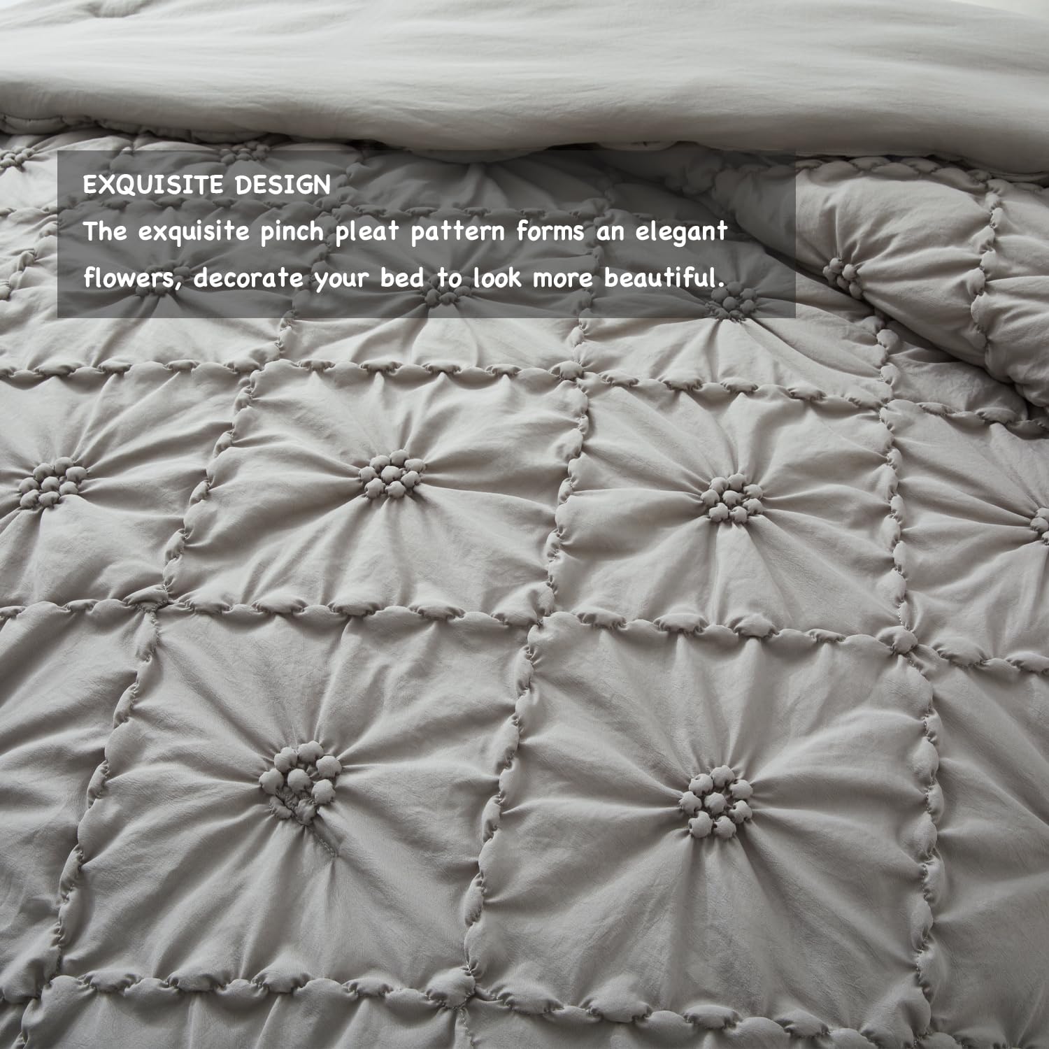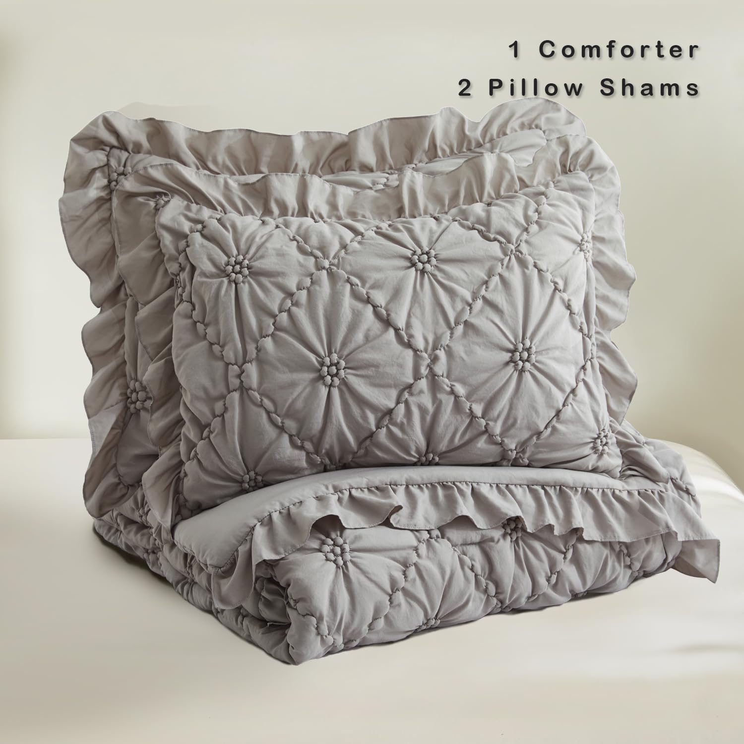 Este juego de edredón BEDAZZLED en tamaño king size es la combinación perfecta de comodidad y estilo. Hecho con 100% microfibra de alta calidad y relleno de poliéster, este conjunto de ropa de cama suave y acogedor es ideal para todas las estaciones. El juego incluye un edredón de 102×88 pulgadas y 2 fundas de almohada de 20×36 pulgadas, con pespuntes acolchados que evitan que el relleno se mueva. La exquisita artesanía de pliegues con forma floral y las fundas de almohada con volantes agregan un toque único y moderno a tu dormitorio. El edredón es cálido pero ligero, manteniendo el equilibrio perfecto entre peso y calidez para ofrecerte una comodidad acogedora todo el año. Además, es fácil de cuidar, simplemente mételo en la lavadora en frío y sécalo a baja temperatura. Transforma tu dormitorio en un espacio para dormir como en las nubes con este elegante y acogedor juego de edredón BEDAZZLED.