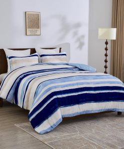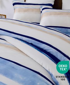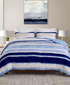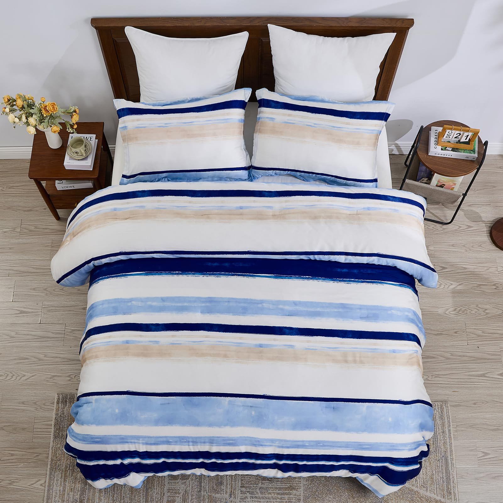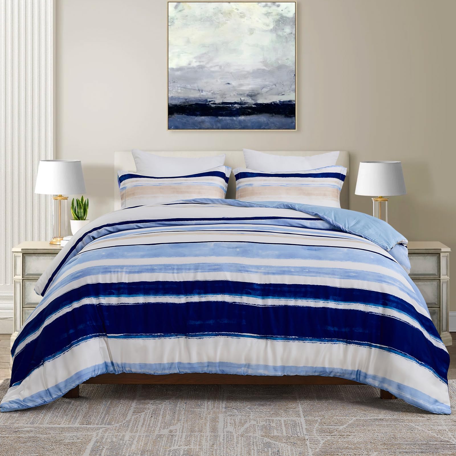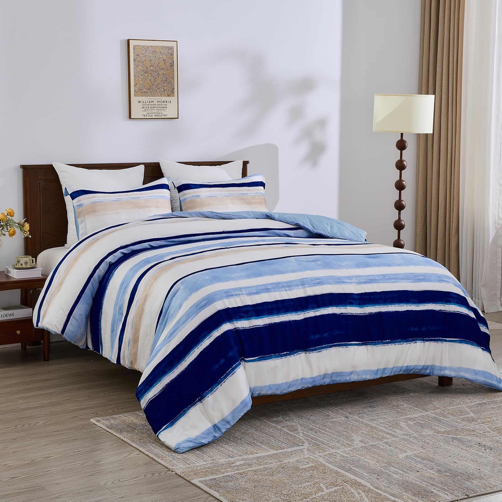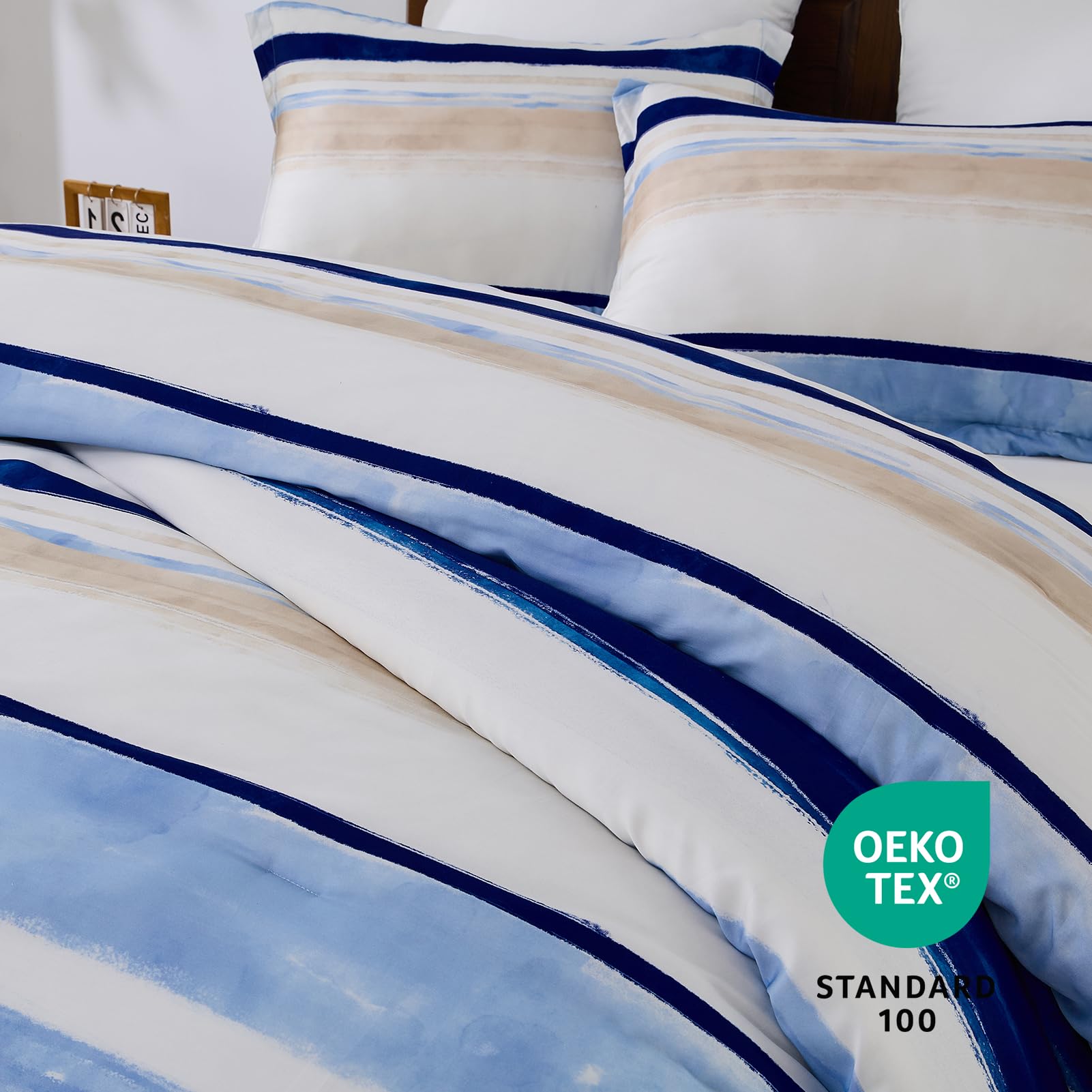 1. Edredón de Rayas Acuarela – Inspirado en marcadores acuarelas nítidos, este juego de edredón presenta rayas vibrantes azules y suaves beige canela en el lado A, con un simple azul en el lado B. Cambia fácilmente entre los lados para combinar con tu estado de ánimo y la decoración de tu dormitorio, lo que lo hace ideal para todas las edades. Este acogedor juego de edredón también es un regalo reflexivo para cumpleaños, fiestas o viajes.
