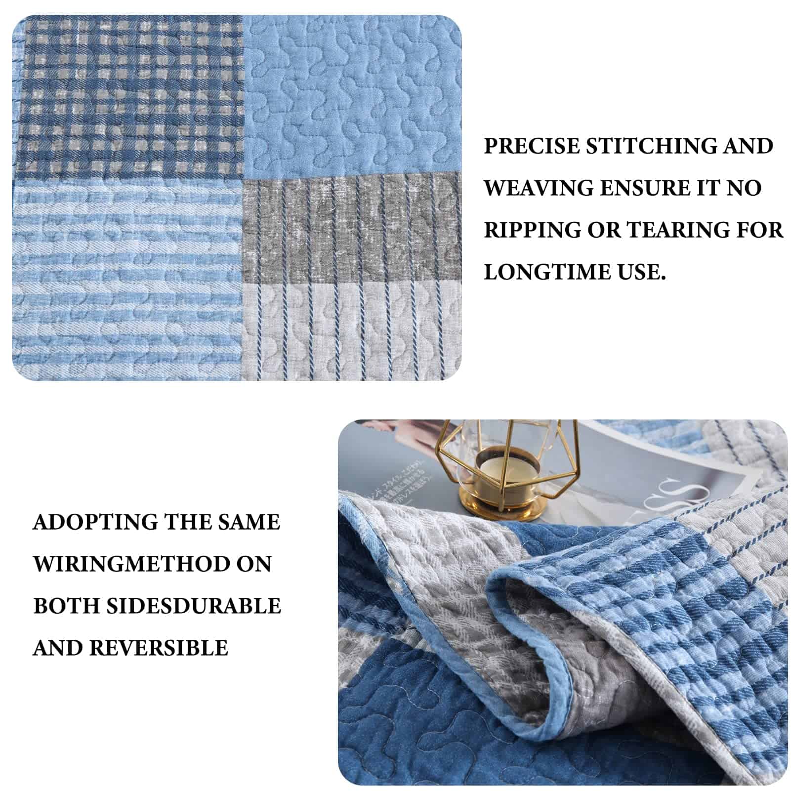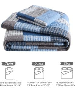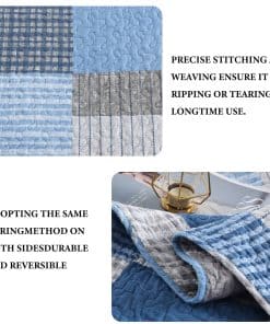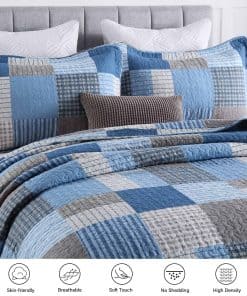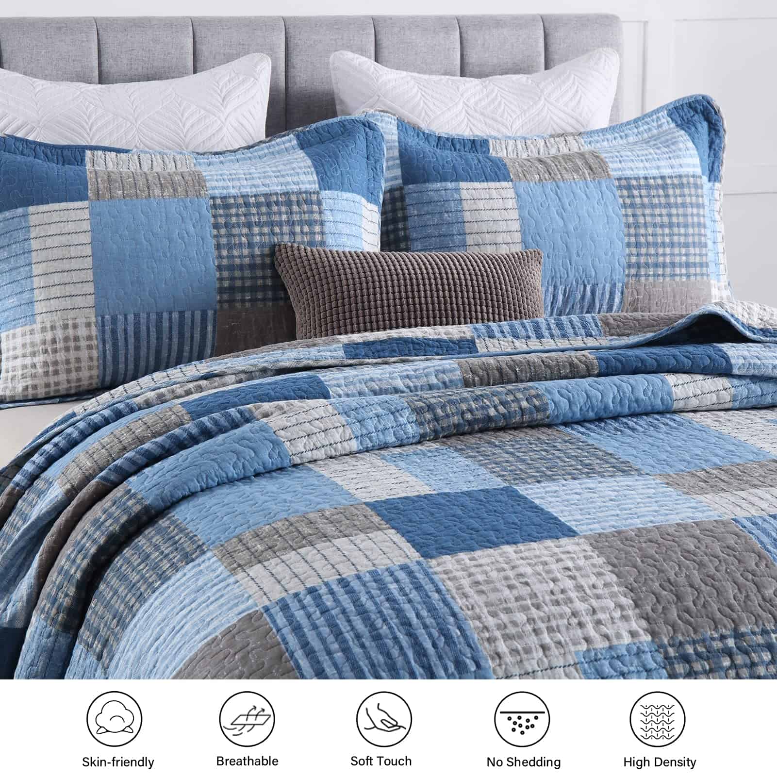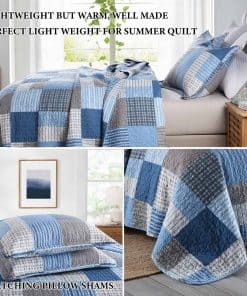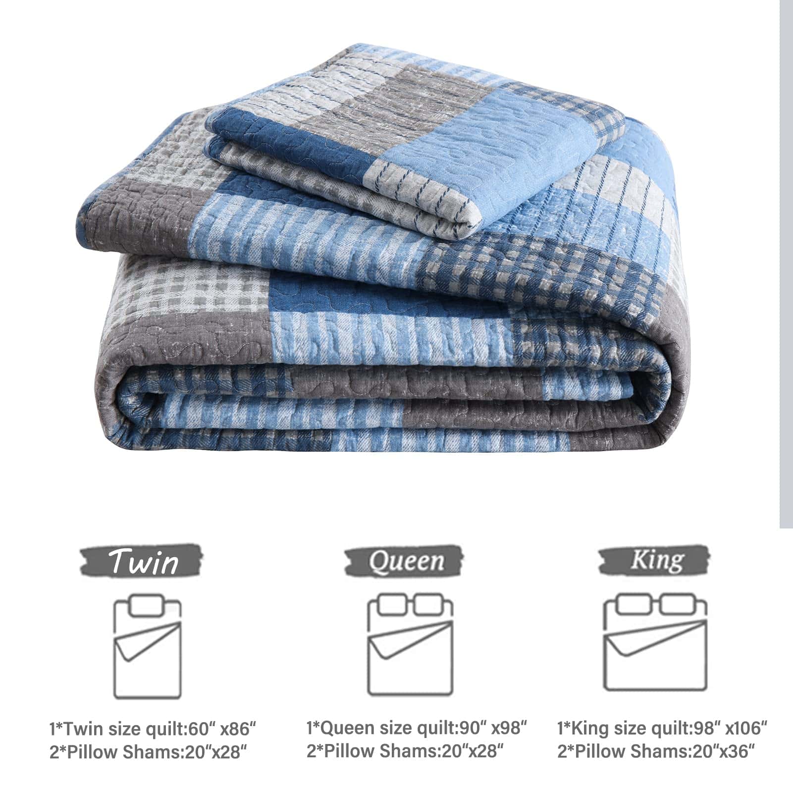 El juego de edredón king Y-PLWOMEN está hecho de algodón 100%, lo que lo hace saludable, suave y transpirable para una experiencia de sueño cómoda. Este edredón de tamaño king en tonos azul, gris y marino presenta un diseño a cuadros clásico y reversible que le permite cambiar el aspecto de su habitación al instante. Es ligero y fresco para las temperaturas más cálidas, pero sigue siendo lo suficientemente cálido para ser usado como una manta en primavera y verano, o como un juego de edredón en otoño e invierno. El conjunto de 3 piezas incluye 1 edredón king y 2 fundas de almohada, combinando perfectamente con la decoración de su hogar. La excelente artesanía de doble costura garantiza durabilidad y un aspecto elegante. Este edredón king es un regalo ideal para sus seres queridos. Además, es fácil de cuidar: lavar a máquina en frío, ciclo suave y por separado, no usar lejía, secar en secadora a baja temperatura y retirar inmediatamente para mantener su forma suave y cálida después de cada lavado.