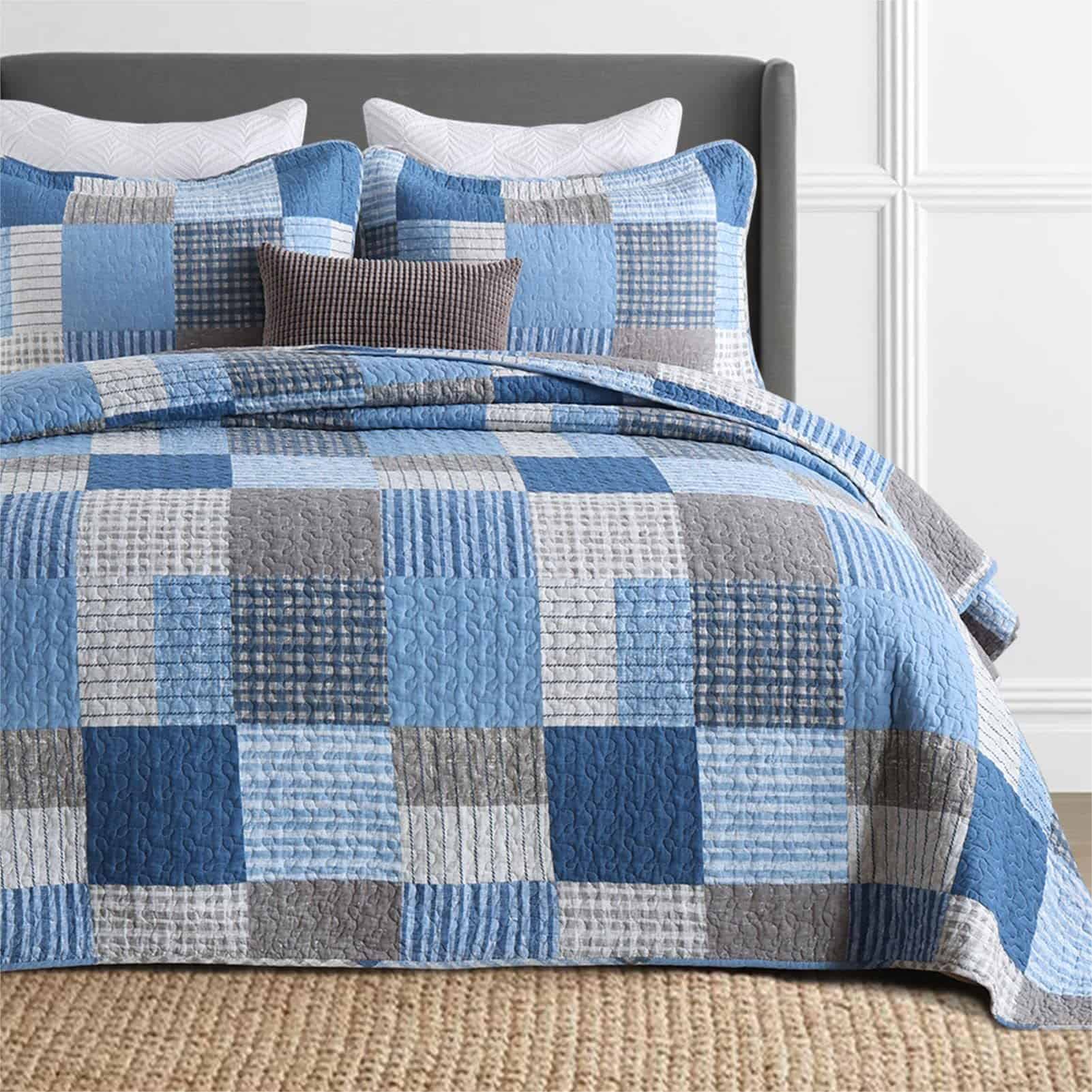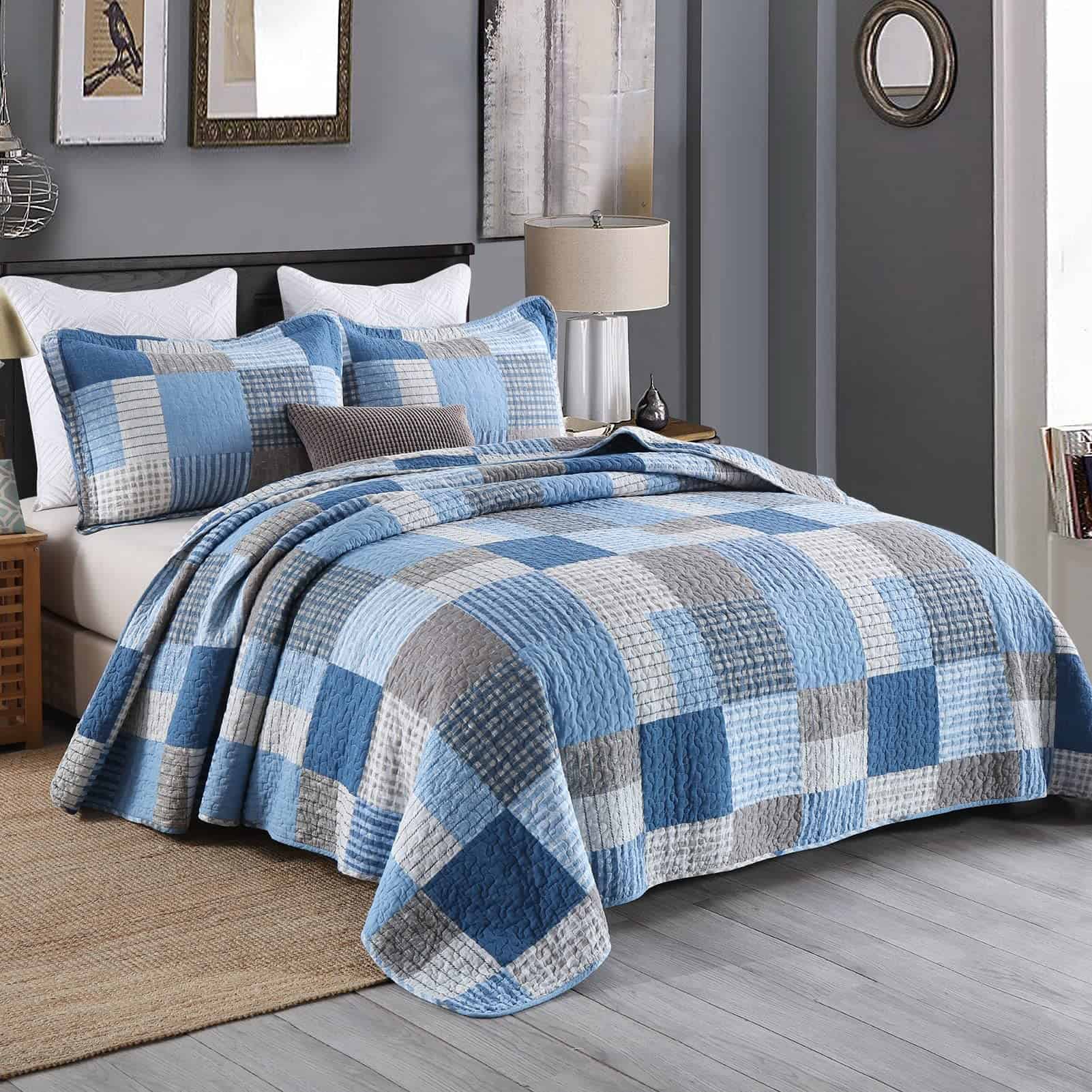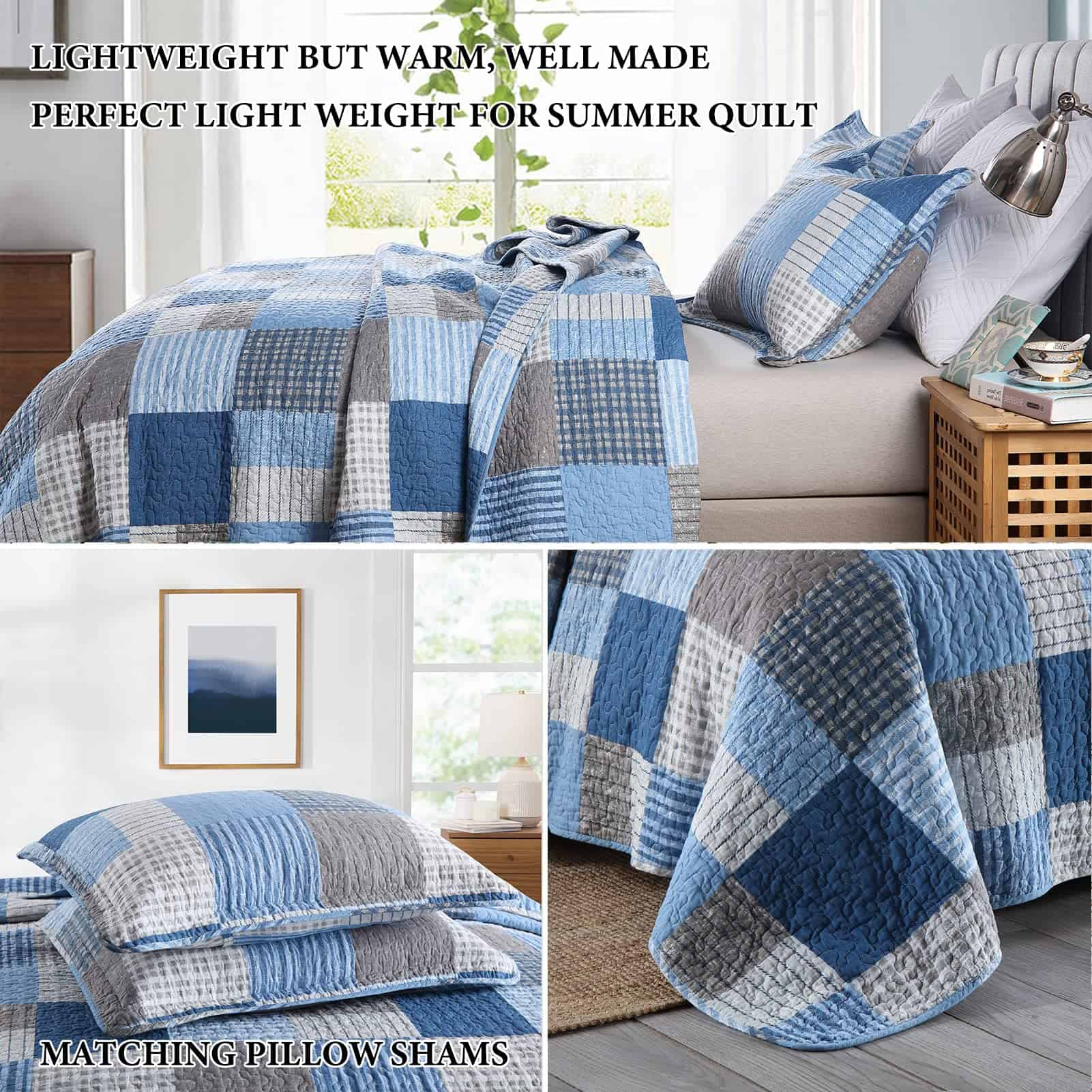 El juego de edredón king Y-PLWOMEN está hecho de algodón 100%, lo que lo hace saludable, suave y transpirable para una experiencia de sueño cómoda. Este edredón de tamaño king en tonos azul, gris y marino presenta un diseño a cuadros clásico y reversible que le permite cambiar el aspecto de su habitación al instante. Es ligero y fresco para las temperaturas más cálidas, pero sigue siendo lo suficientemente cálido para ser usado como una manta en primavera y verano, o como un juego de edredón en otoño e invierno. El conjunto de 3 piezas incluye 1 edredón king y 2 fundas de almohada, combinando perfectamente con la decoración de su hogar. La excelente artesanía de doble costura garantiza durabilidad y un aspecto elegante. Este edredón king es un regalo ideal para sus seres queridos. Además, es fácil de cuidar: lavar a máquina en frío, ciclo suave y por separado, no usar lejía, secar en secadora a baja temperatura y retirar inmediatamente para mantener su forma suave y cálida después de cada lavado.