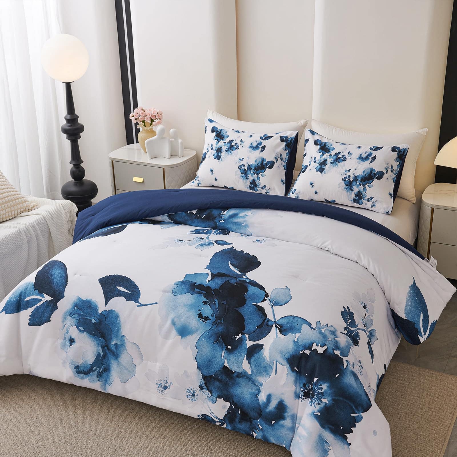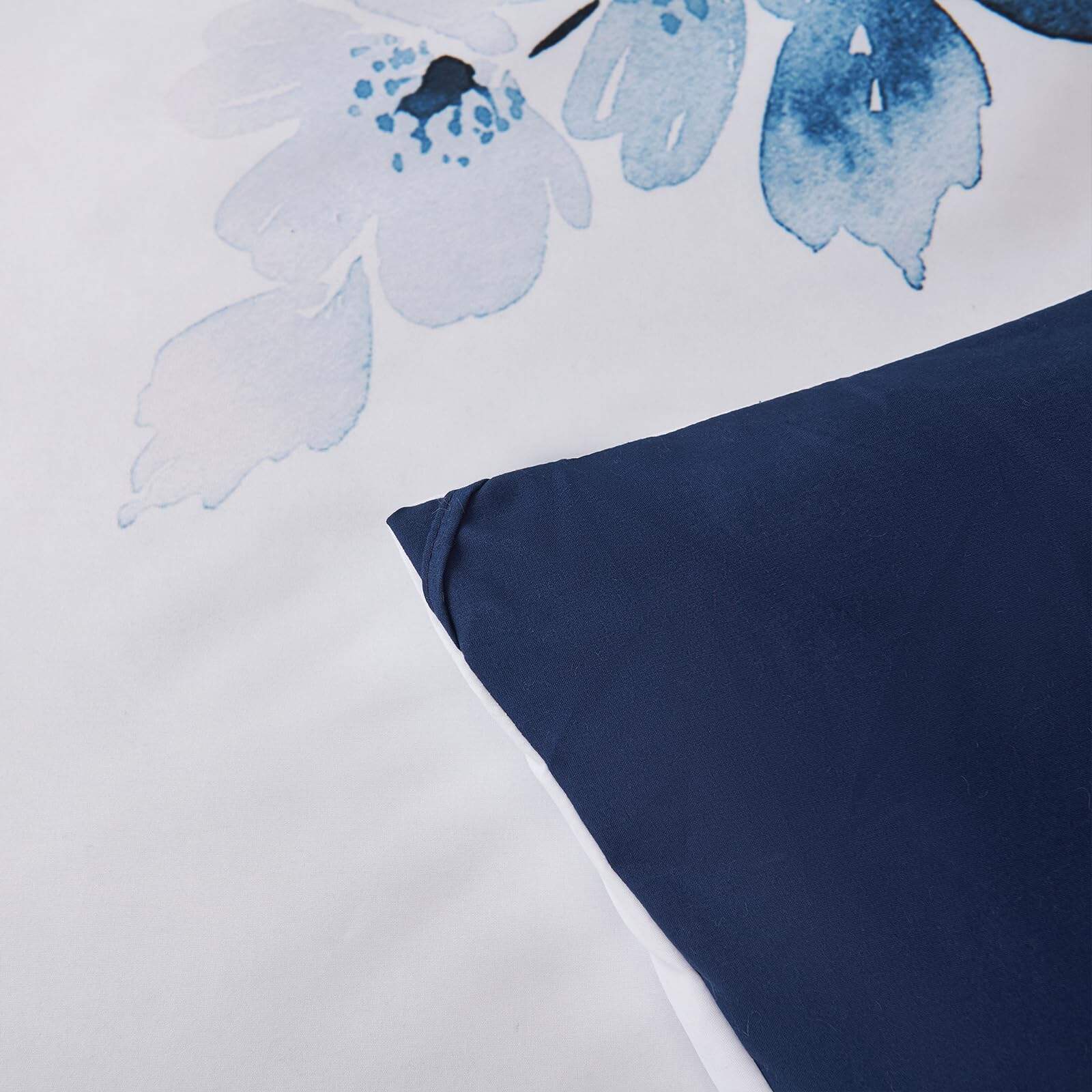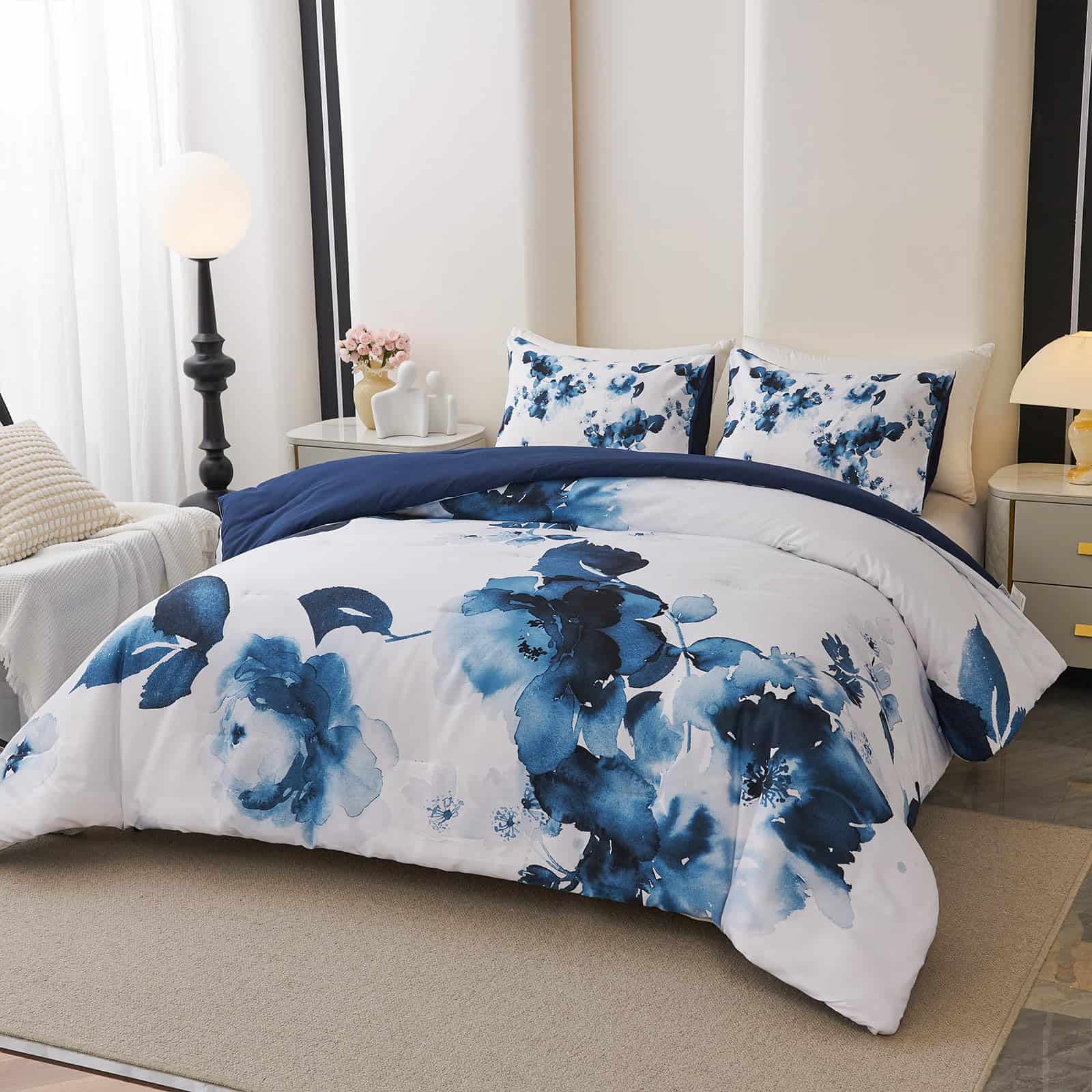 1. Diseño Floral Artístico: Presenta un impresionante patrón floral acuarela en tonos azules profundos sobre un fondo blanco nítido, añadiendo un toque artístico y sereno a cualquier decoración de dormitorio.