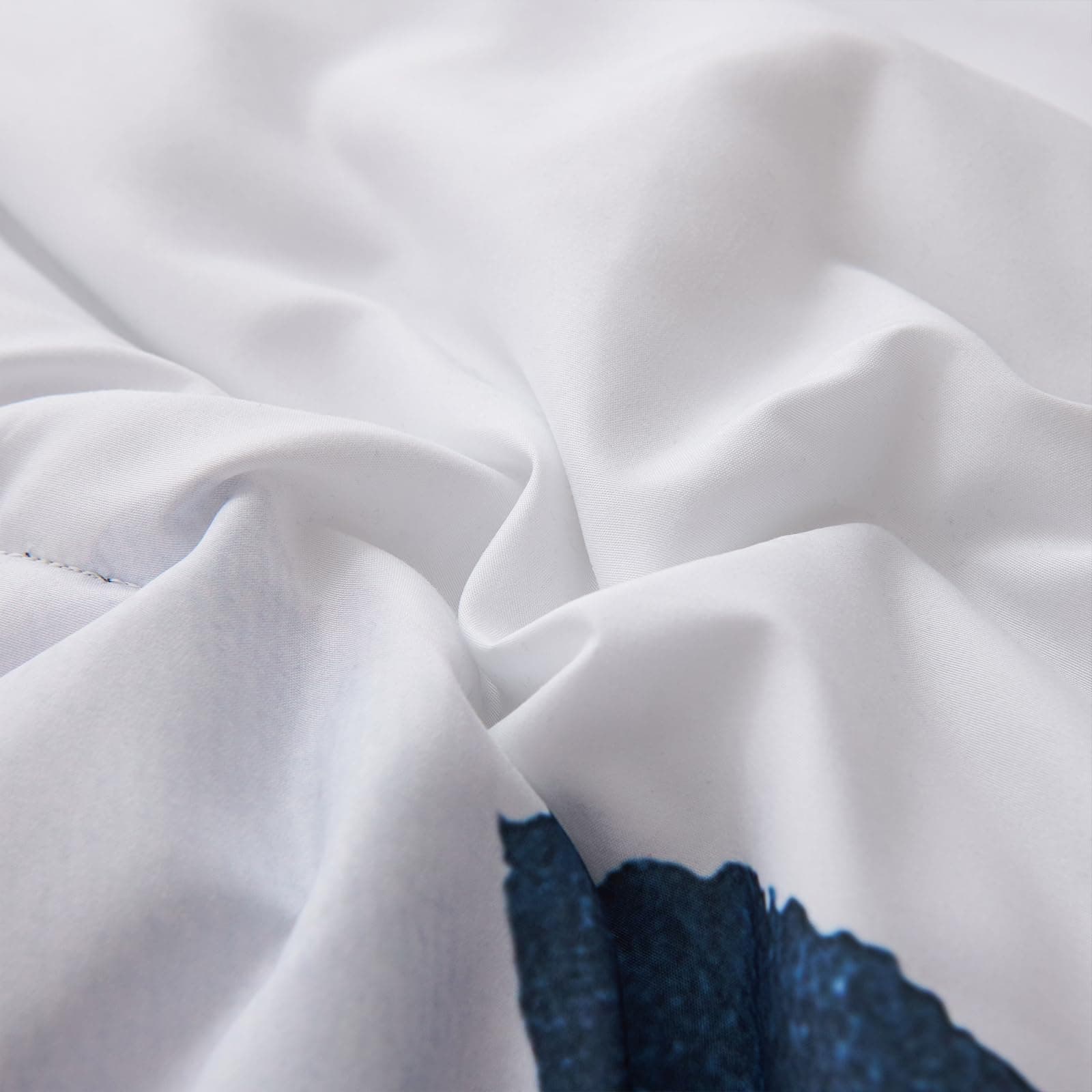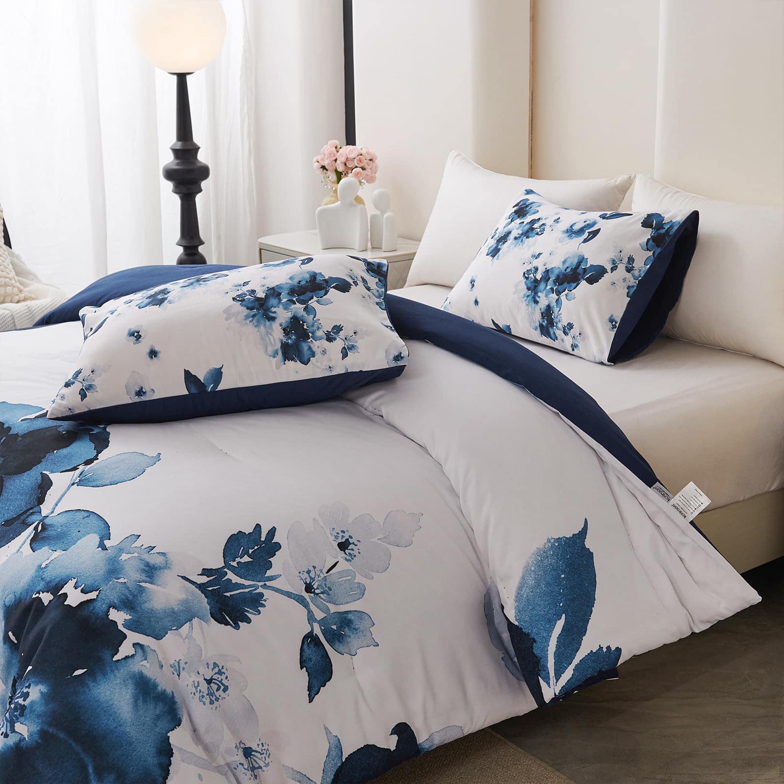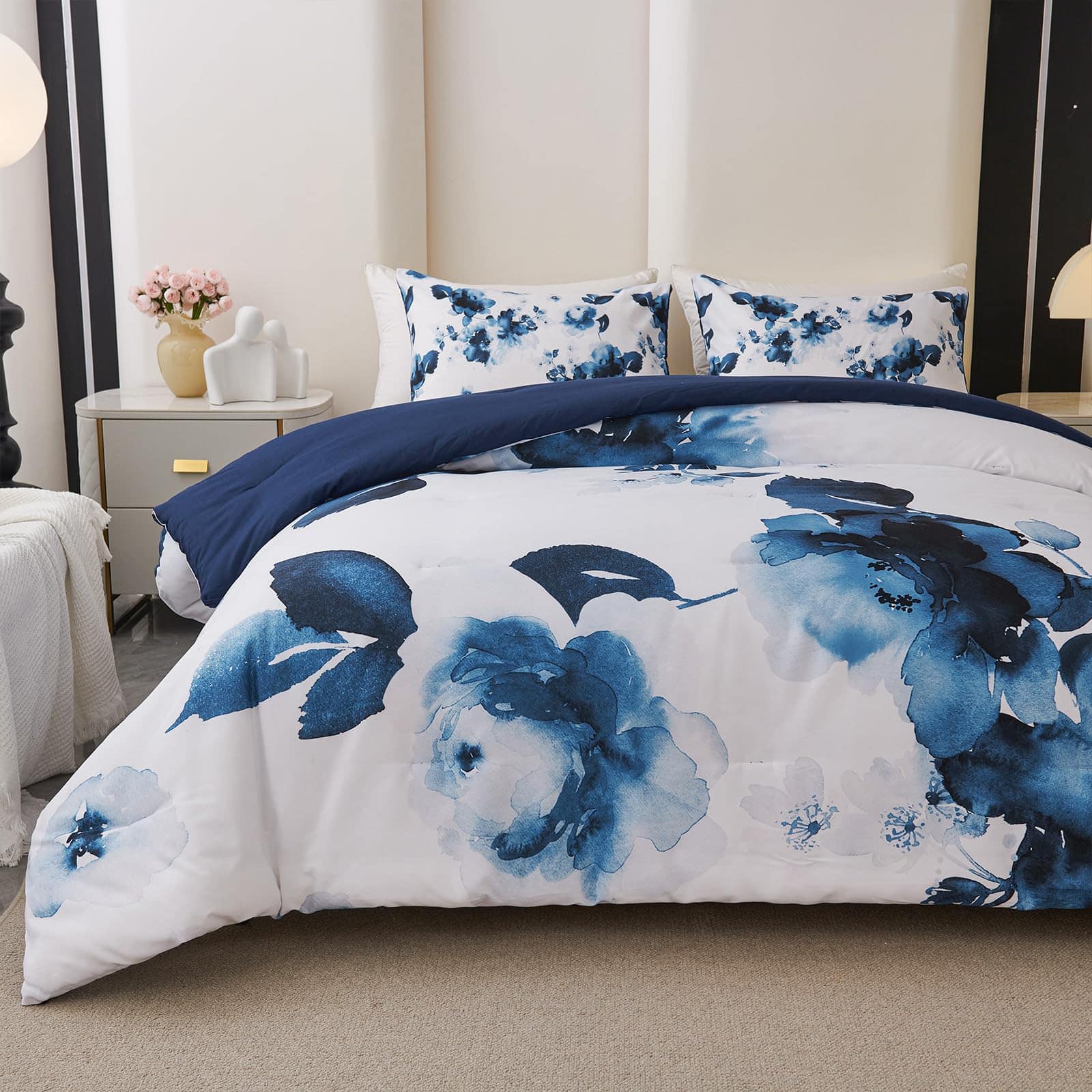 1. Diseño Floral Artístico: Presenta un impresionante patrón floral acuarela en tonos azules profundos sobre un fondo blanco nítido, añadiendo un toque artístico y sereno a cualquier decoración de dormitorio.