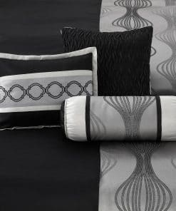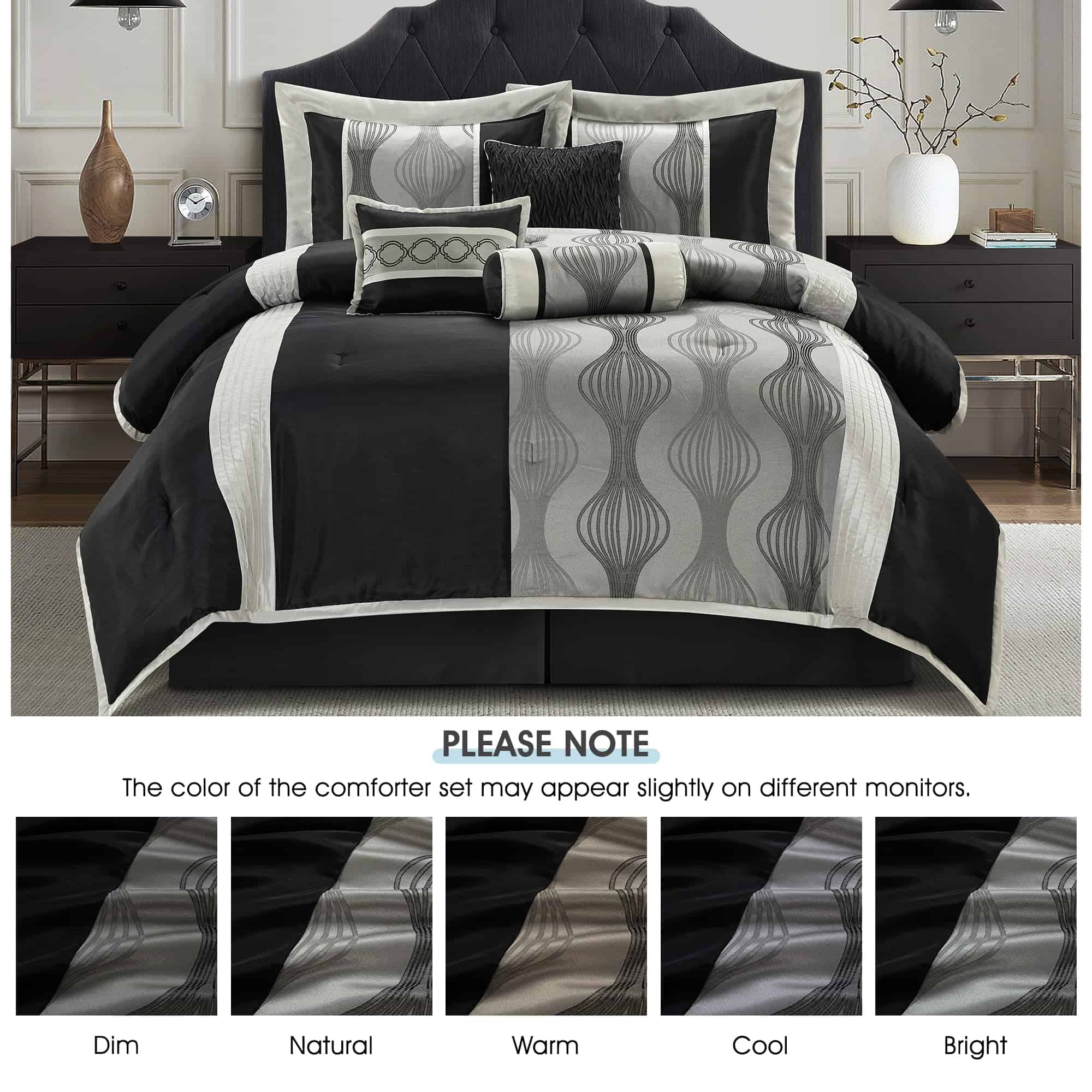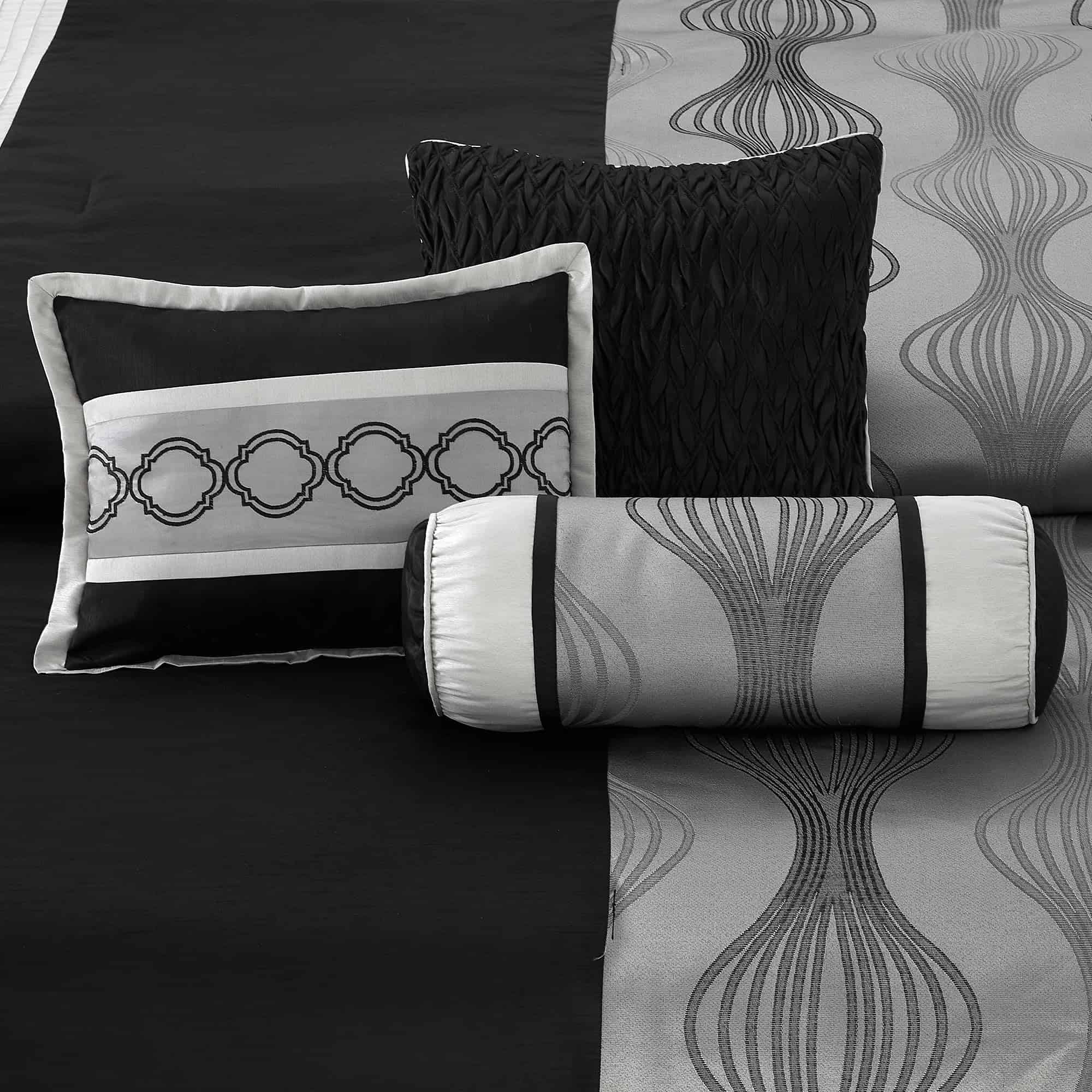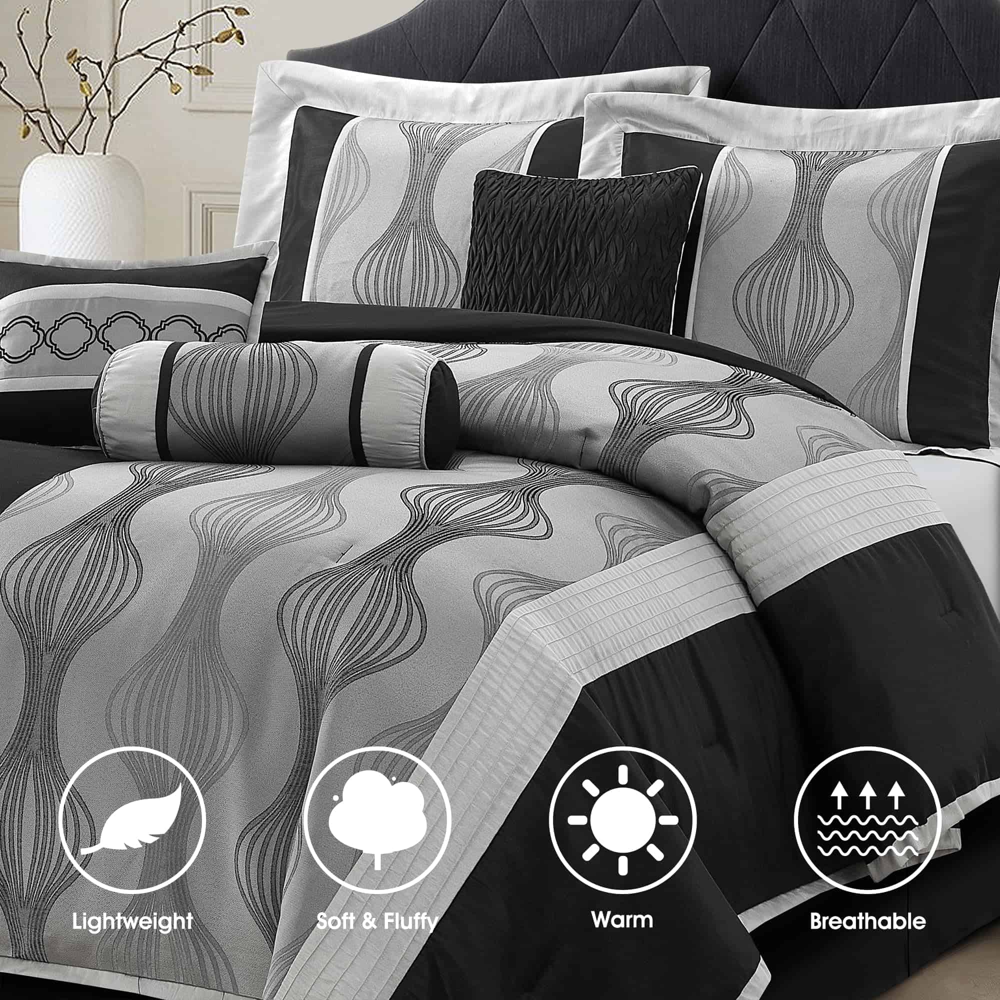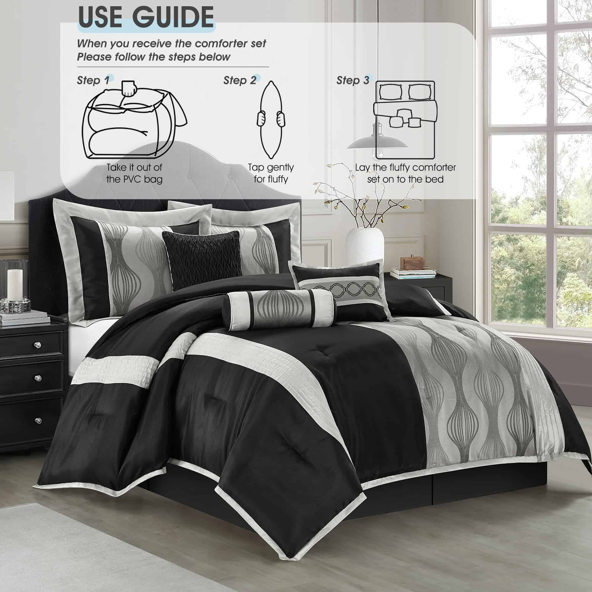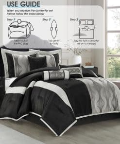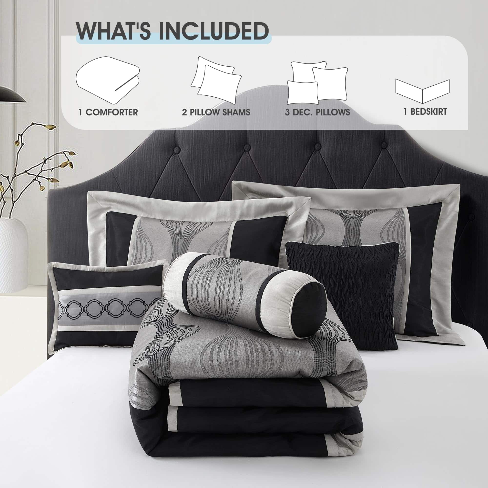 El juego de edredón LANCO MODERN LIFESTYLE para cama Queen en negro y plata de 7 piezas es la elección perfecta para añadir elegancia moderna a tu dormitorio. Con un tejido jacquard y una combinación de colores negro y plata, combina patrones geométricos con arte en patchwork para añadir un toque de elegancia moderna a tu dormitorio. Este juego incluye un edredón (90″x92″), una falda de cama (60″x80″+15″), 2 fundas de almohada (27″x21″) y 3 cojines decorativos (12″x16″, 16″x16″, 6.5″x16″). Cada juego viene empaquetado individualmente, haciéndolo una elección ideal para uso personal o como regalo pensado. Fácil de mantener, este juego de edredón está diseñado para lavarse a máquina por separado en agua fría, ciclo suave y secar a baja temperatura para un mantenimiento sencillo. ¡Elige LANCO Modern Lifestyle como tu socio de confianza para calidad premium y un servicio al cliente excepcional!