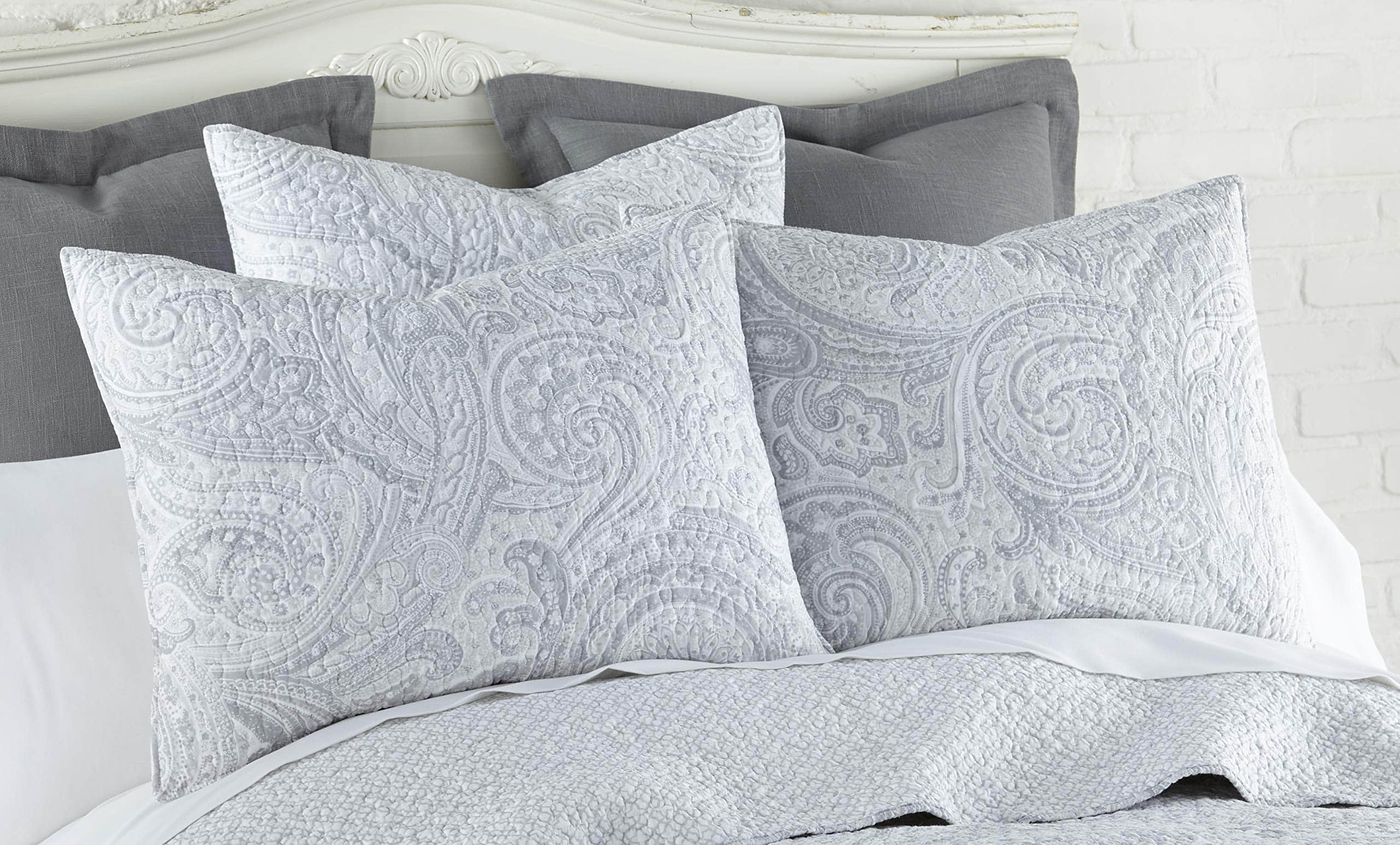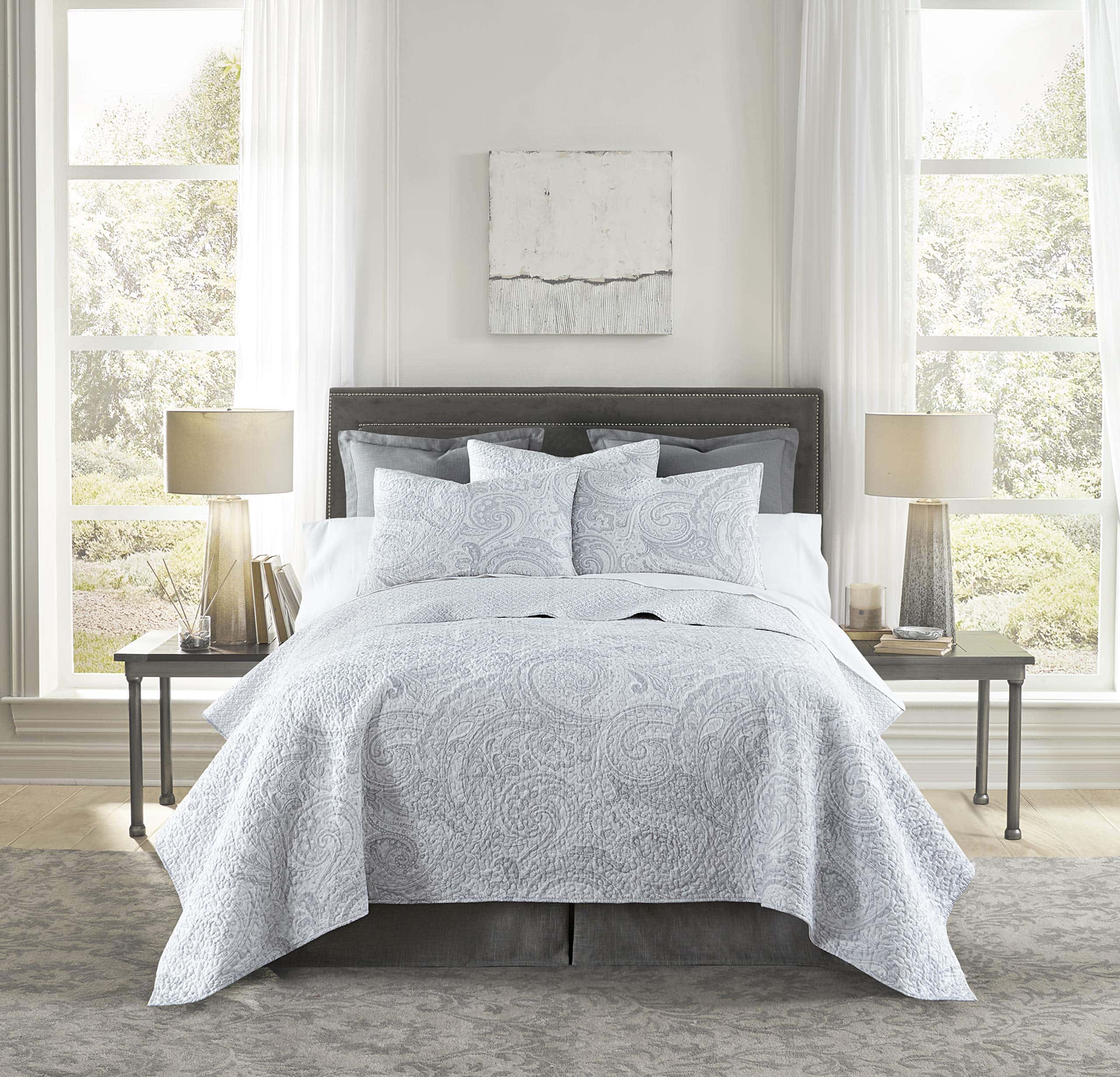Uno de nuestros juegos de edredones más populares, Gris de abeto está inspirado en patrones paisley tradicionales, con intrincados remolinos de paisley en tonos suaves de gris y un encantador patrón reverso de patrón de lattic. Un borde encuadernado proporciona contraste y textura para completar el look. Previamente lavado para su conveniencia, el juego de edredón y funda de almohada Gris de abeto es fácil de cuidar. Simplemente lavar a máquina en un ciclo frío y suave, luego secar en línea o secar en secadora a baja temperatura. Lavable a máquina. El producto incluye: Un edredón King y dos fundas King.
