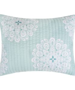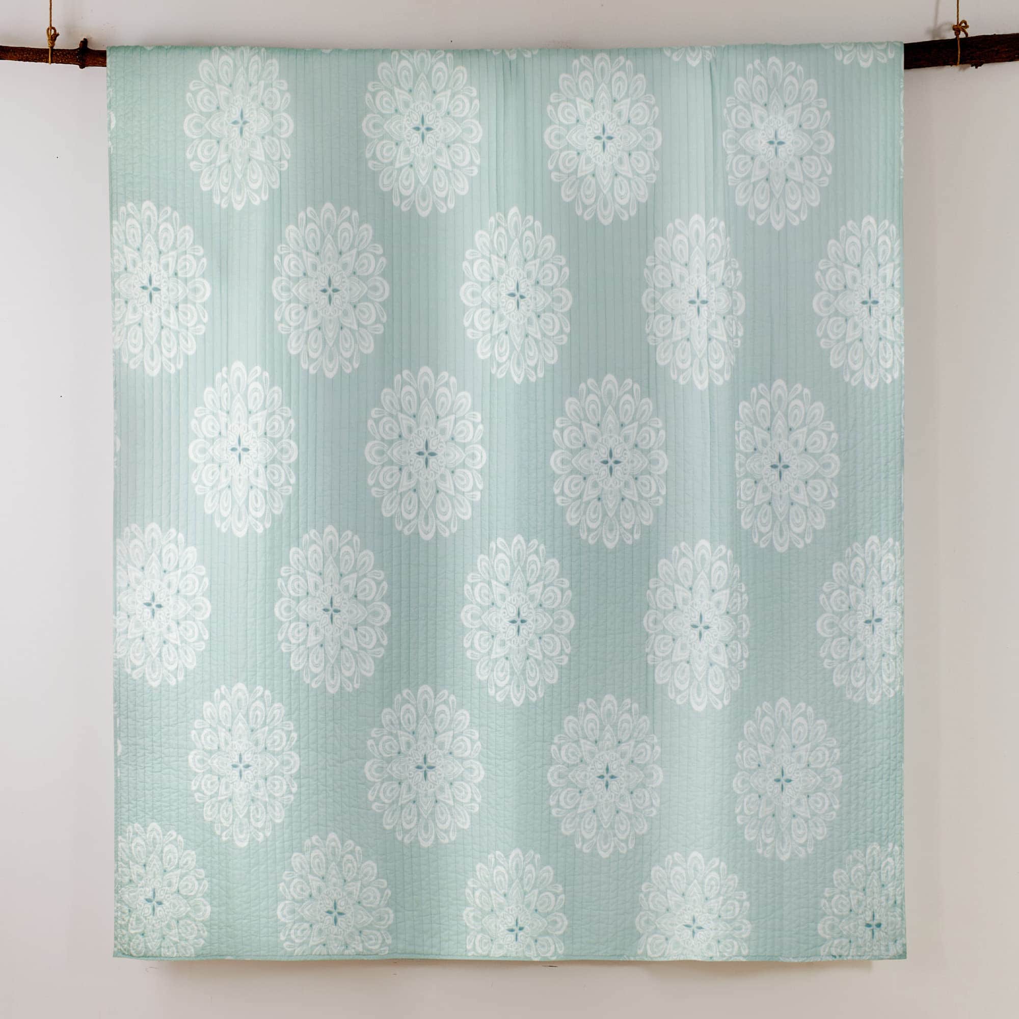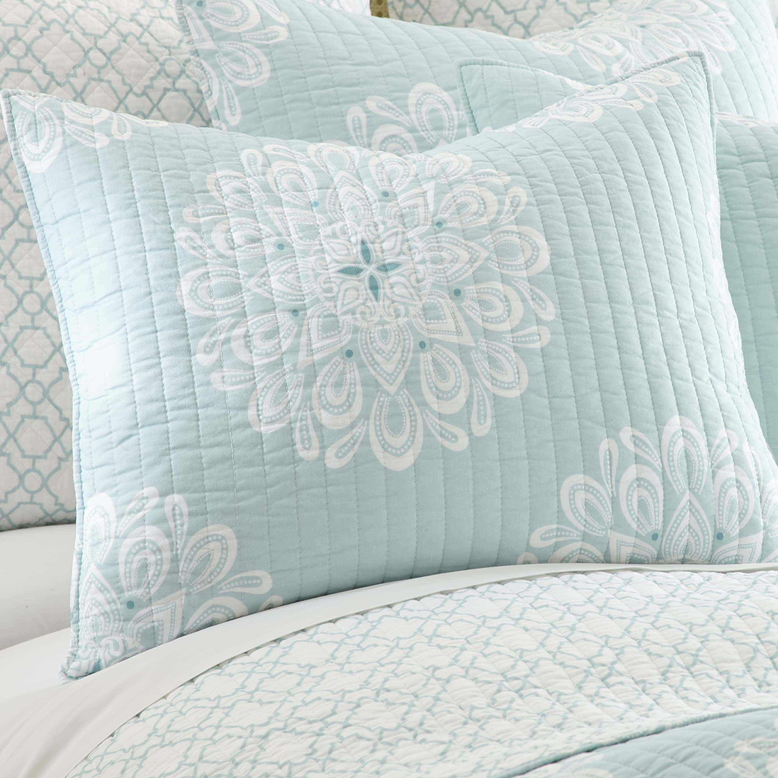 2. EL DISEÑO LARA SPA: Uno de nuestros juegos de edredón más populares, Lara Spa está inspirado en clásicos medallones de rosas, con un diseño de medallón redondo ligero y sofisticado y un encantador patrón reverso de spa azul y blanco geométrico. Un borde encuadernado proporciona contraste y textura para completar el aspecto.