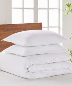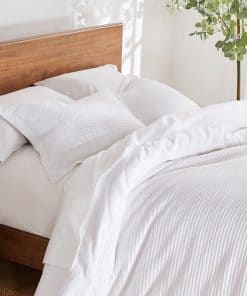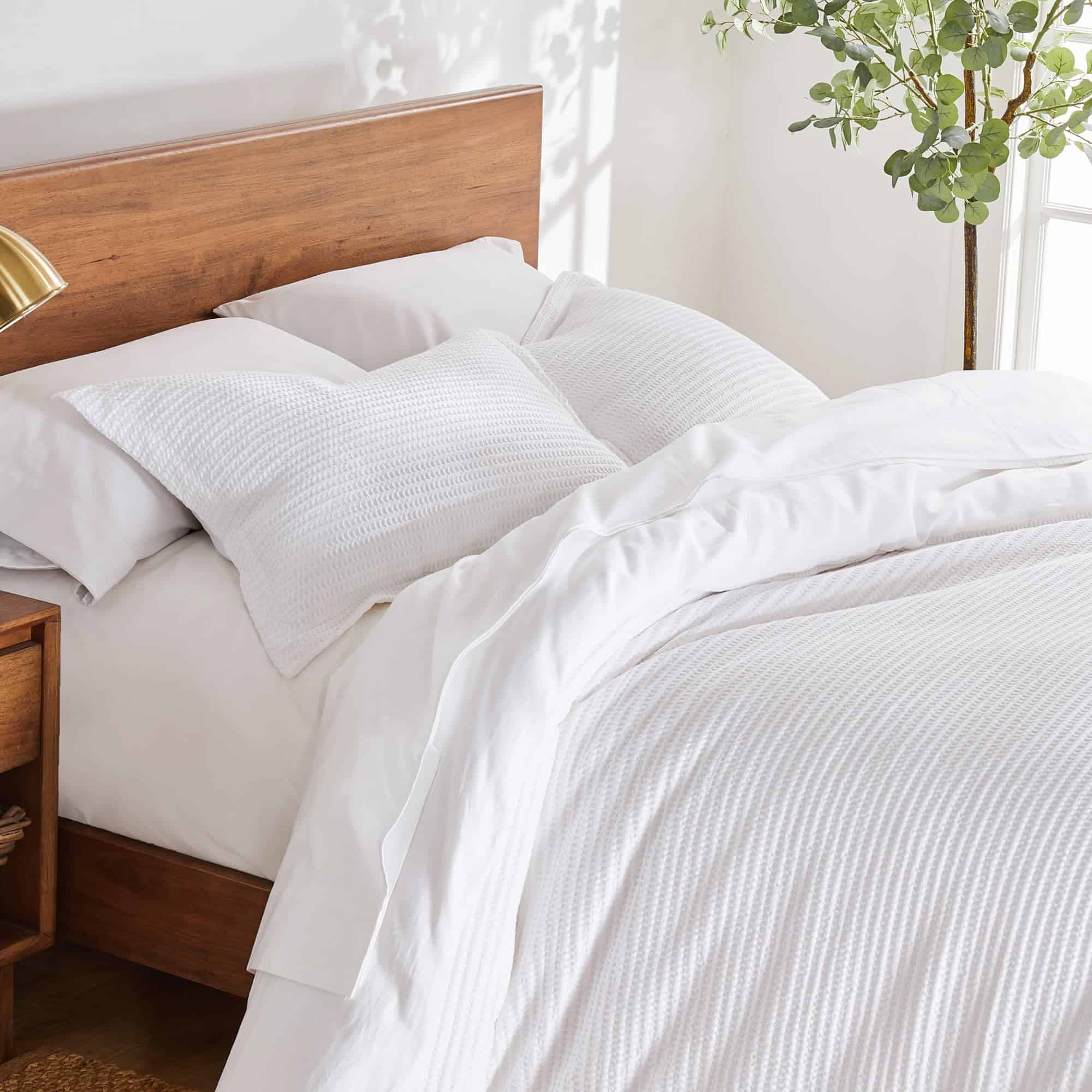 1. EL DISEÑO DE WAFFLE CLOUD: Uno de nuestros conjuntos más populares, Waffle Cloud Bright White es versátil y lujoso. El frente es un tejido de gofrado texturizado y el reverso es de algodón sólido. El edredón está relleno de suave poliéster hipoalergénico al 100%.