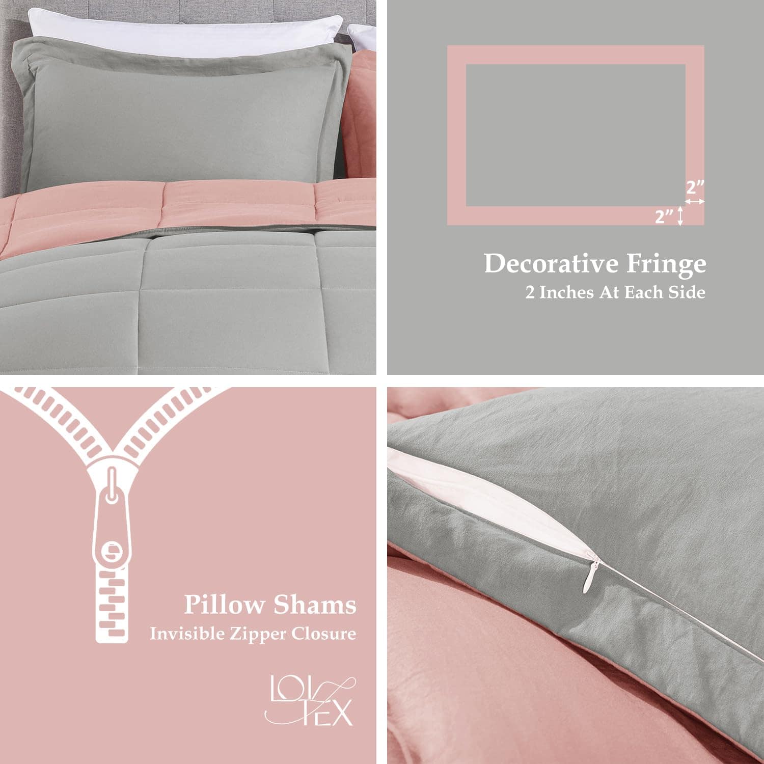 ¡Diseñado para brindarle comodidad y estilo en su dormitorio, este juego de edredón LOVTEX de 3 piezas es la elección perfecta para su cama tamaño king! El paquete incluye un edredón de tamaño king de alta calidad y 2 fundas de almohada con flecos de 2 pulgadas para que pueda experimentar un verdadero lujo en su hogar. El relleno suave y esponjoso de microfibra proporciona una sensación de calidez y frescura al mismo tiempo, mientras que la tela de microfibra lavada prelavada garantiza que su piel permanezca cómoda y sin irritación. Este juego de edredón king reversible viene en dos tonos diferentes para que pueda adaptarlo a su decoración existente. Además, es lavable a máquina, lo que facilita su cuidado y mantenimiento. Con este juego de edredón LOVTEX, disfrute de noches de sueño reparador y acogedoras en cualquier estación del año.