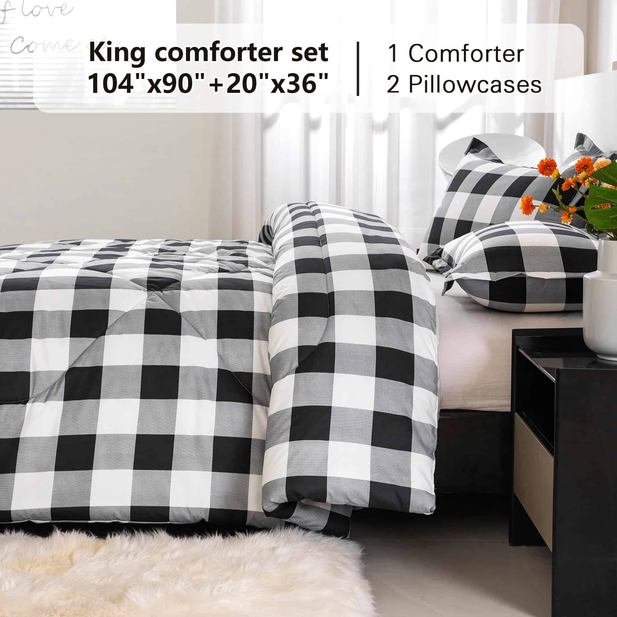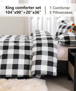 El edredón alternativo de cuadros en negro y blanco es ultra suave y ligero, está hecho de microfibra lavable al 100%. Las ventajas de la microfibra incluyen una gran retención de calor y un peso ligero. Así que el juego de edredón texturizado te ofrece la máxima sensación de suavidad y comodidad, para que puedas disfrutar de una noche cómoda y tranquila. El juego de ropa de cama es clásico y vintage, con un patrón de cuadros clásico que combina con diferentes tipos de habitaciones. Esta lujosa colección de edredón es maravillosa para familias, hoteles, casas rurales y granjas. Y el juego de edredón de microfibra es una buena elección como regalos de cumpleaños y regalos especiales de vacaciones. El edredón king ligero es altamente duradero con una alta resistencia a la tracción, lo que lo hace fuerte y menos probable que se rasgue o se rompa. Construido con técnicas que incluyen un mejor acolchado para que el relleno permanezca en su lugar y no se mueva ni se agrupe. El edredón alternativo de plumón es resistente al desgaste y a las arrugas para años de uso. Se recomienda que el edredón se seque al sol y se golpee suavemente durante el secado para que quede mullido antes de usarlo. Nuestro juego de edredón es lavable a máquina, lavar en agua fría, ciclo suave y secar en secadora a baja temperatura y luego secar de forma natural, no usar lejía.
