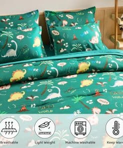 1. DIMENSIONES DEL CONJUNTO: El juego de edredón para niños de tamaño Queen incluye 1 edredón 88″x88″, 1 sábana plana 102″x90″, 1 sábana ajustable 80″x60″x14″, 2 fundas de almohada 20″x30″, 2 fundas para cojín 20″x26″. 2. DISEÑO DE PATRÓN ATRACTIVO: Ambos lados del edredón están diseñados con dinosaurios coloridos y brillantes que alegrarán a tu hijo, atrayéndolo temprano a la cama y brindándole un sueño dulce. 3. MATERIAL DE ALTA CALIDAD: Este juego de cama para niños está hecho de un material ligero, como dormir en una nube. Proporciona suficiente transpirabilidad y calidez, lo que lo hace adecuado para todas las estaciones, permitiendo que tu hijo duerma cómodamente. 4. FÁCIL CUIDADO: Resistente a las arrugas y decoloraciones; Duradero y lavable a máquina. Puedes tirar las sábanas y el edredón en la lavadora y secadora sin preocuparte por que el patrón temático colorido y los personajes de dibujos animados se desvanezcan. Diseñado para la comodidad, el material es súper suave y duradero. 5. EXCELENTE REGALO PARA NIÑOS Y NIÑAS: Este juego de edredón para niños con un patrón de dinosaurios vívido y lindo decorará tu habitación y sacará una sonrisa en la cara de cualquier niño. Es un regalo ideal para usar en la escuela o en casa. Se enrolla fácilmente para un almacenamiento y transporte conveniente.