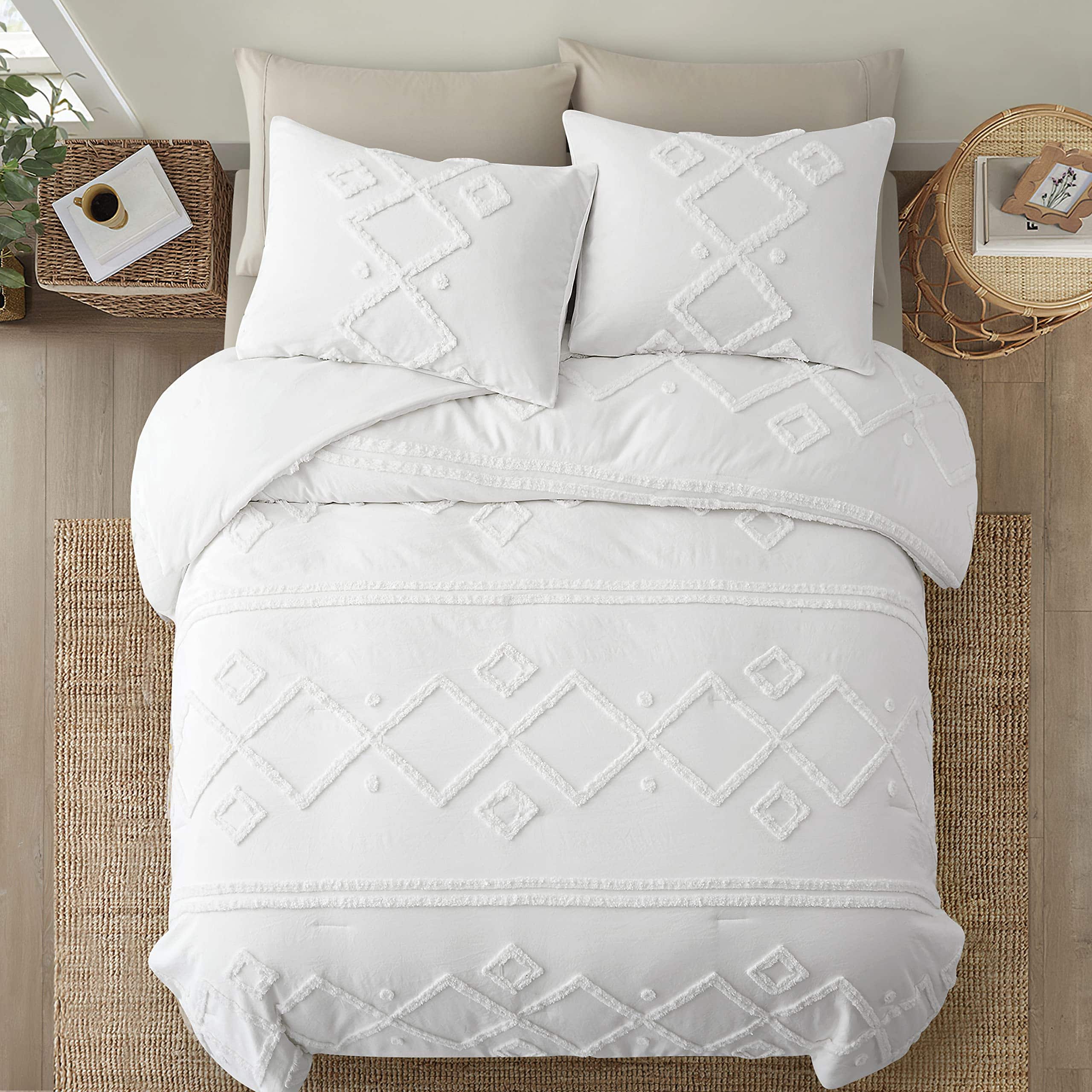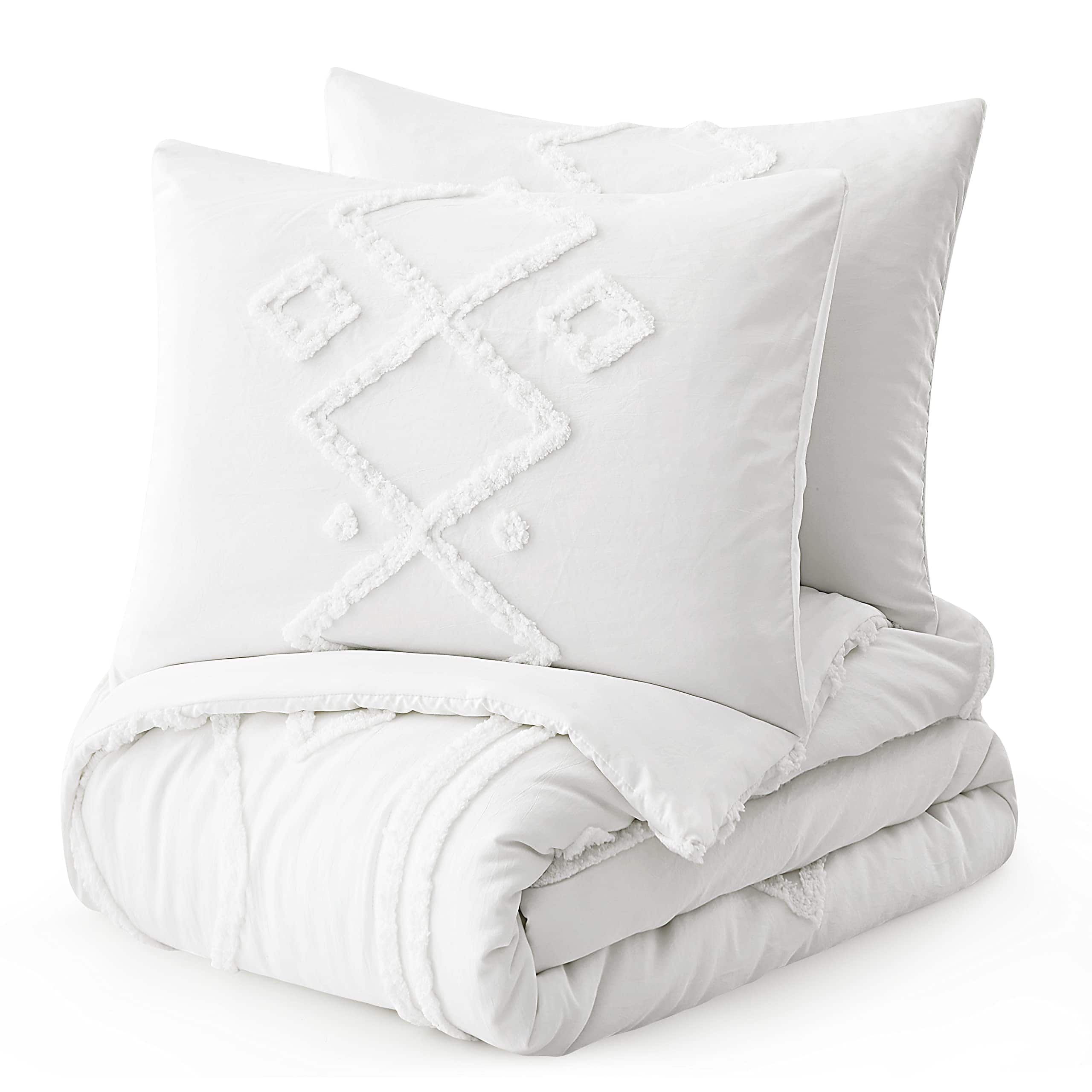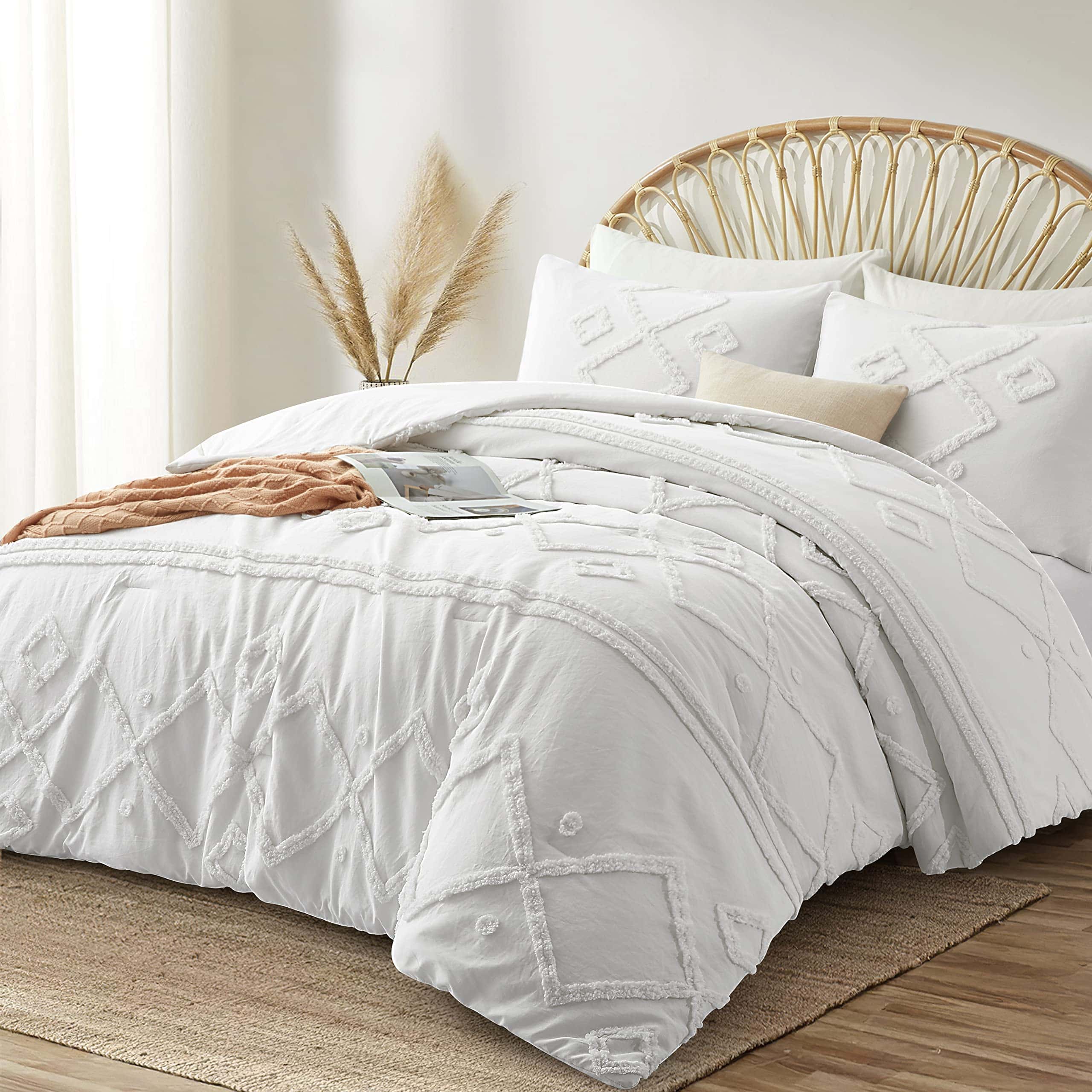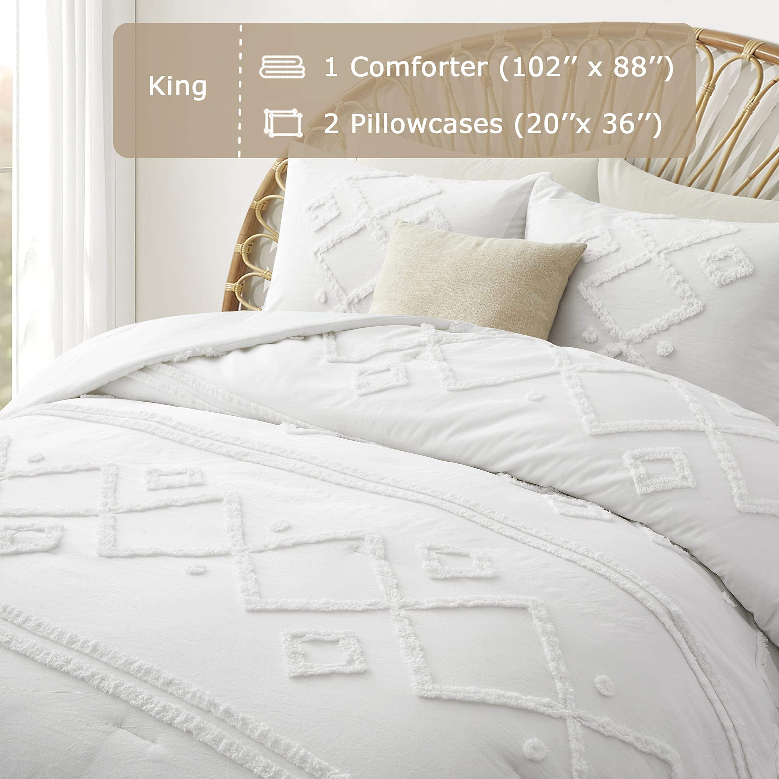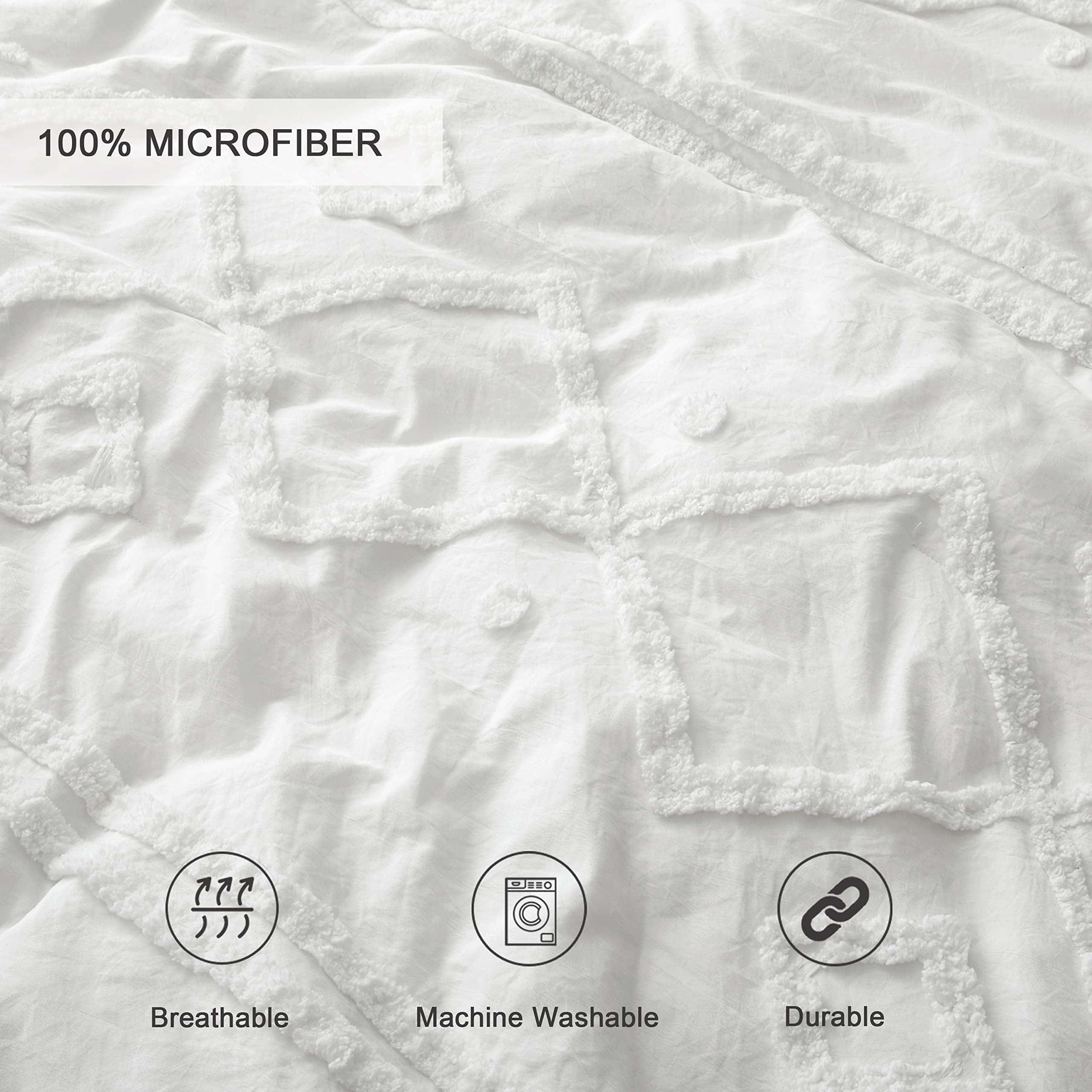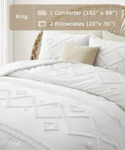 4. Paquete y Tamaño: El juego de edredón tamaño King incluye 1 edredón blanco (102×88 pulgadas) y 2 fundas de almohada (20×36 pulgadas) sin inserto de almohada.