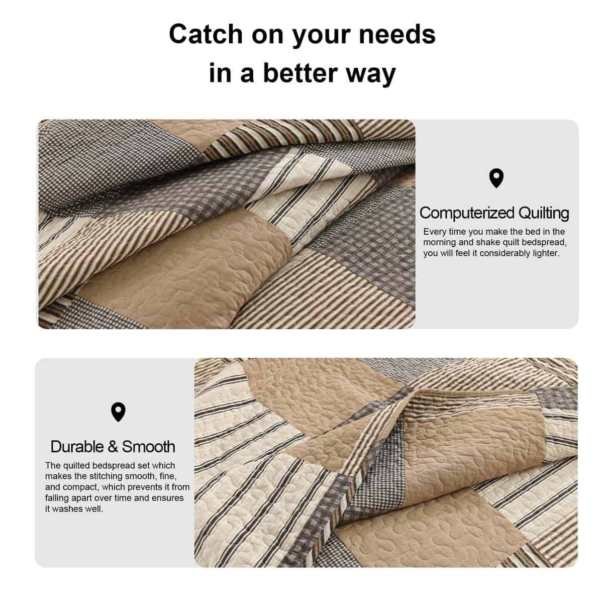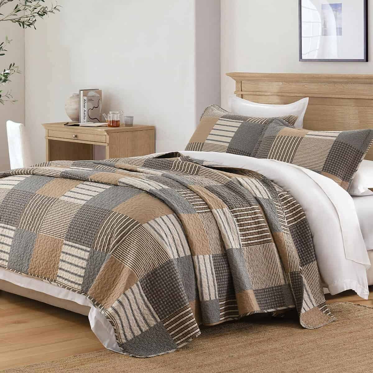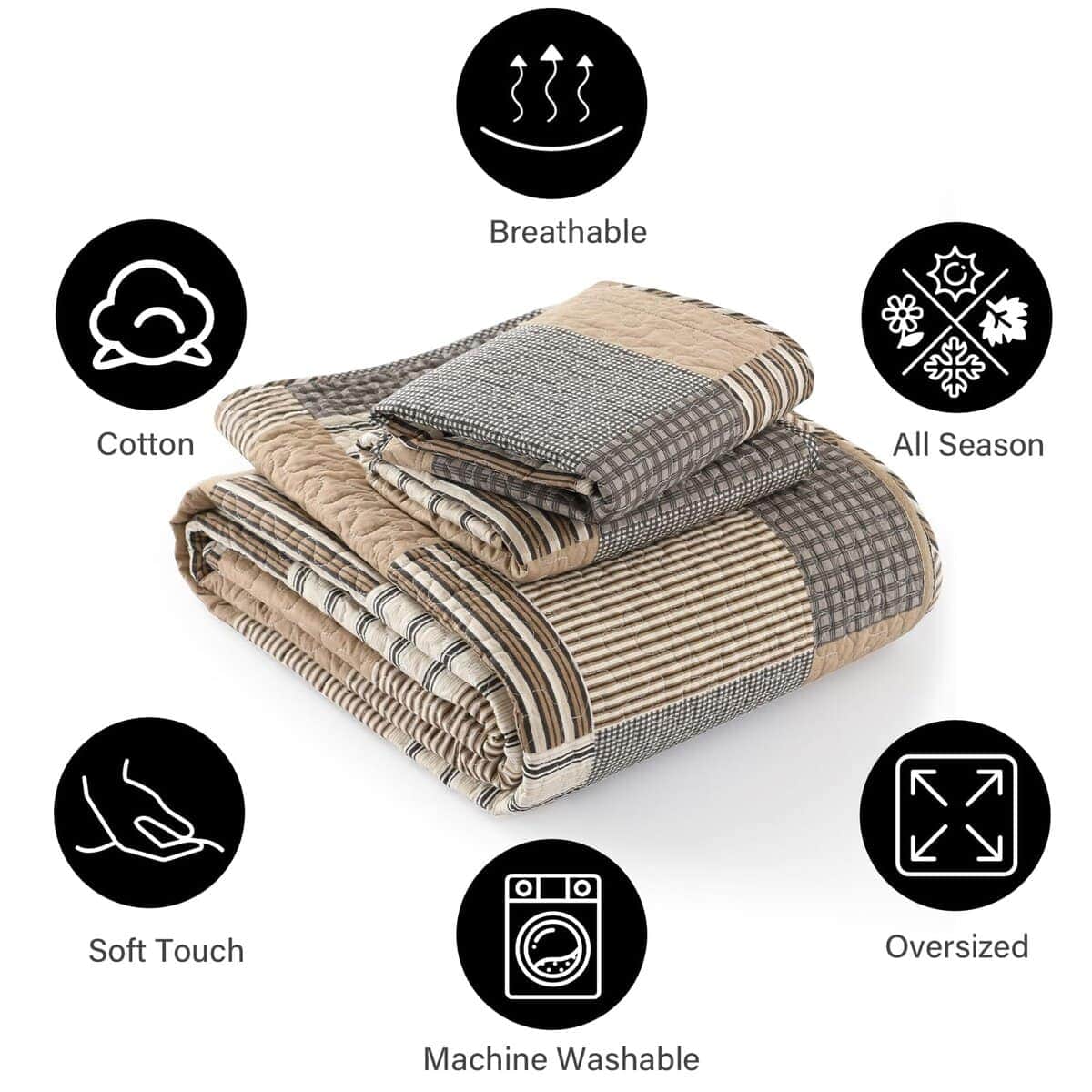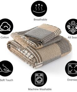 Juego de Edredón 100% algodón PANGUSHAN Tamaño King, Edredón King, Juego de Ropa de Cama Rústica Ligera de Granja a Cuadros Cubrecamas Acolchado, Edredón Gris/Marrón/Beige para Cama King, 3 Piezas. Este juego de edredón de algodón 100% natural es más saludable y transpirable. Suave, amigable con la piel y duradero. Ambos lados de este juego de edredón tienen los mismos patrones de cuadros en gris, marrón y beige, que se adaptan fácilmente a la decoración de su habitación. Es adecuado para dormitorios, salas de estar, habitaciones principales, habitaciones de invitados, estudios, dormitorios y RVs. Es ligero y portátil para habitaciones interiores y camping al aire libre. Este juego de edredón es ampliamente aplicable, por lo que puede ser una buena opción como regalo. Este juego de edredón se puede utilizar en primavera, verano, otoño e invierno. Si tiende a sudar más al dormir, este juego de edredón se puede usar solo en clima frío, o puede usar este juego de edredón junto con manta o edredón en clima frío. Puede utilizar este juego de edredón como parte de su decoración del hogar, y también puede utilizarlo como un edredón ligero, cubrecamas acolchado o manta de cama. O simplemente úselo como una capa de su juego de ropa de cama para crear atmósfera y dar vitalidad al espacio. El juego de edredón King de 3 piezas incluye 1 edredón (98 x 106 pulgadas) + 2 fundas de almohada (20 x 36 pulgadas). Material duradero, costuras ordenadas y firmes garantizan un uso a largo plazo. El diseño ligero facilita su transporte, cuidado y lavado, si tiene mascotas, este edredón también es una buena opción. Instrucciones de cuidado: Lavar a máquina por separado en agua fría, secar a baja temperatura, no usar lejía. El edredón mantendrá el calor y su forma original después del lavado. Si tiene mascotas, el edredón lavable es una buena elección.