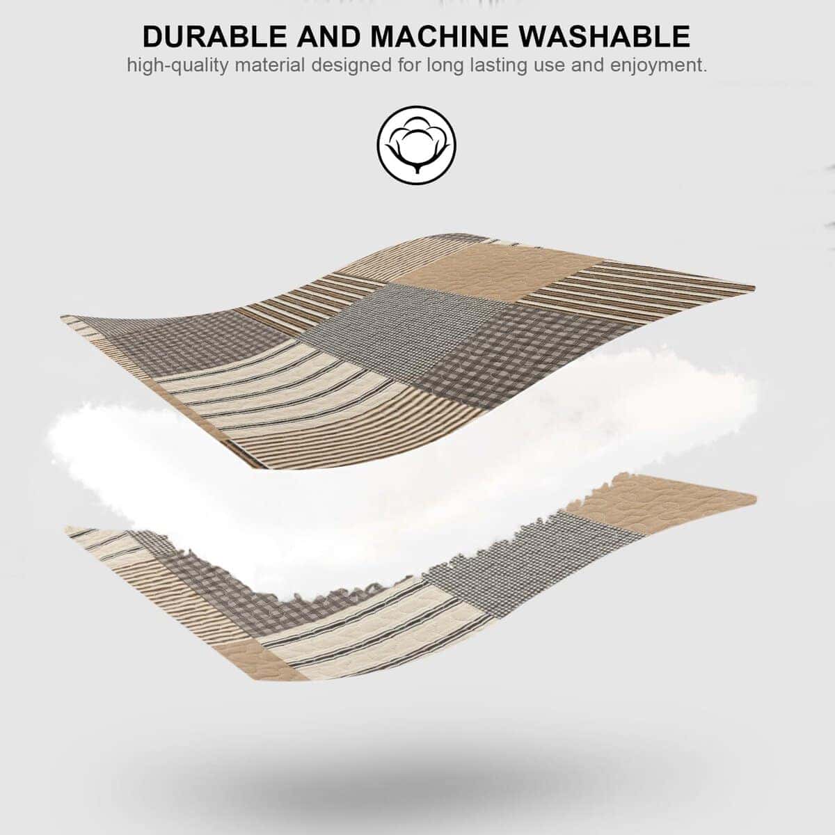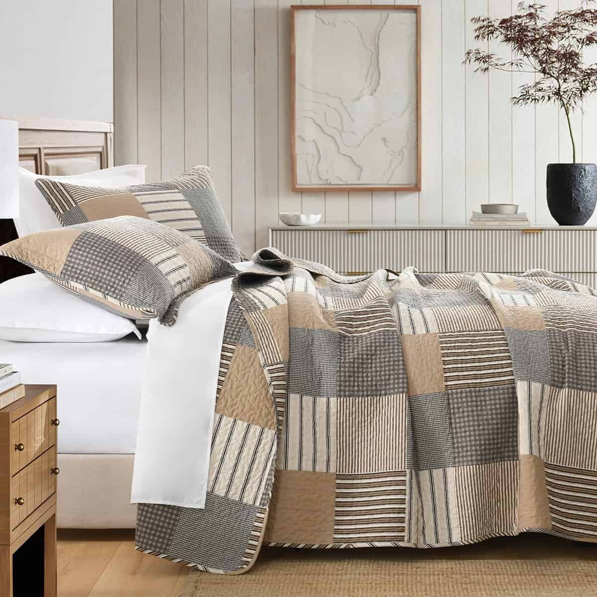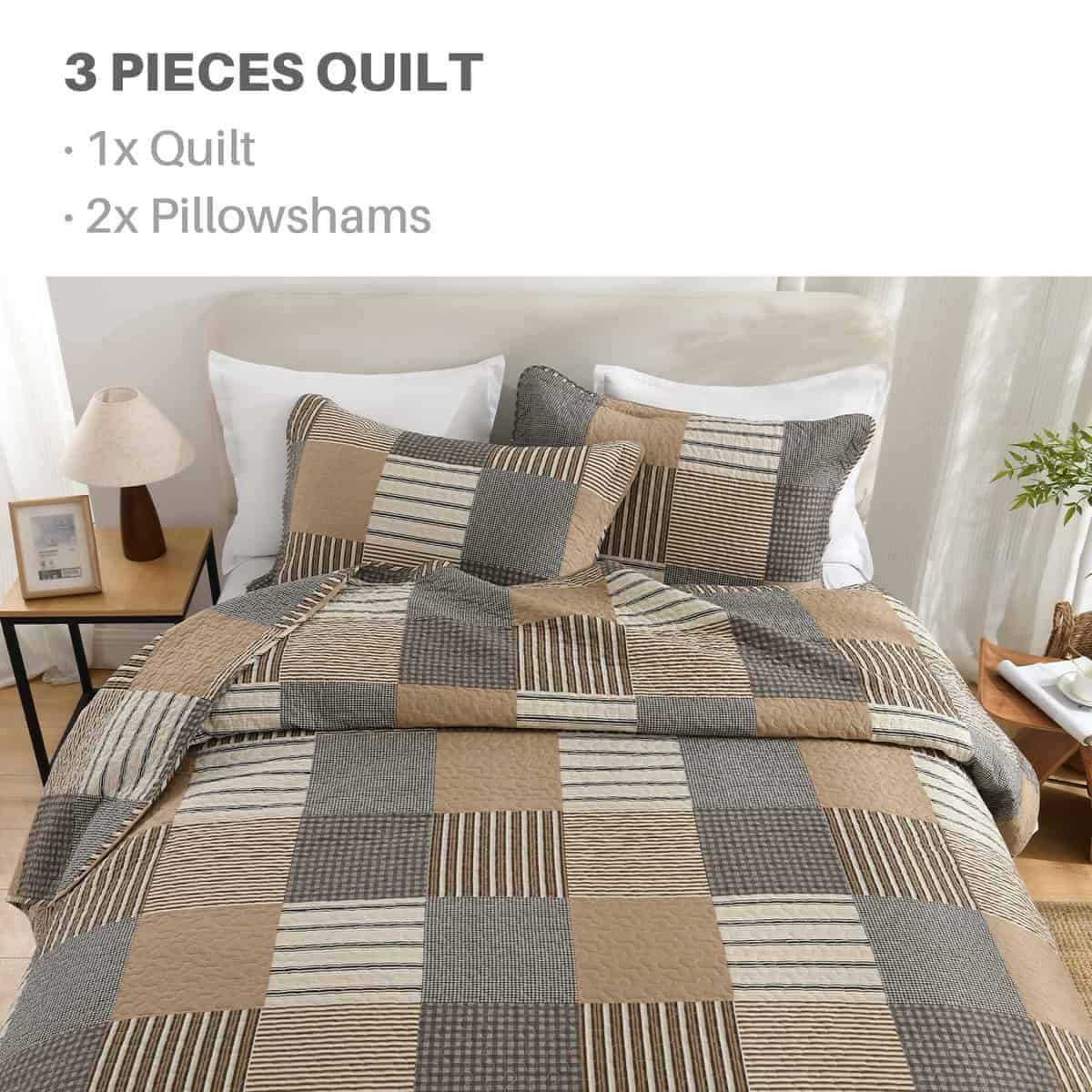 Juego de Edredón 100% algodón PANGUSHAN Tamaño King, Edredón King, Juego de Ropa de Cama Rústica Ligera de Granja a Cuadros Cubrecamas Acolchado, Edredón Gris/Marrón/Beige para Cama King, 3 Piezas. Este juego de edredón de algodón 100% natural es más saludable y transpirable. Suave, amigable con la piel y duradero. Ambos lados de este juego de edredón tienen los mismos patrones de cuadros en gris, marrón y beige, que se adaptan fácilmente a la decoración de su habitación. Es adecuado para dormitorios, salas de estar, habitaciones principales, habitaciones de invitados, estudios, dormitorios y RVs. Es ligero y portátil para habitaciones interiores y camping al aire libre. Este juego de edredón es ampliamente aplicable, por lo que puede ser una buena opción como regalo. Este juego de edredón se puede utilizar en primavera, verano, otoño e invierno. Si tiende a sudar más al dormir, este juego de edredón se puede usar solo en clima frío, o puede usar este juego de edredón junto con manta o edredón en clima frío. Puede utilizar este juego de edredón como parte de su decoración del hogar, y también puede utilizarlo como un edredón ligero, cubrecamas acolchado o manta de cama. O simplemente úselo como una capa de su juego de ropa de cama para crear atmósfera y dar vitalidad al espacio. El juego de edredón King de 3 piezas incluye 1 edredón (98 x 106 pulgadas) + 2 fundas de almohada (20 x 36 pulgadas). Material duradero, costuras ordenadas y firmes garantizan un uso a largo plazo. El diseño ligero facilita su transporte, cuidado y lavado, si tiene mascotas, este edredón también es una buena opción. Instrucciones de cuidado: Lavar a máquina por separado en agua fría, secar a baja temperatura, no usar lejía. El edredón mantendrá el calor y su forma original después del lavado. Si tiene mascotas, el edredón lavable es una buena elección.