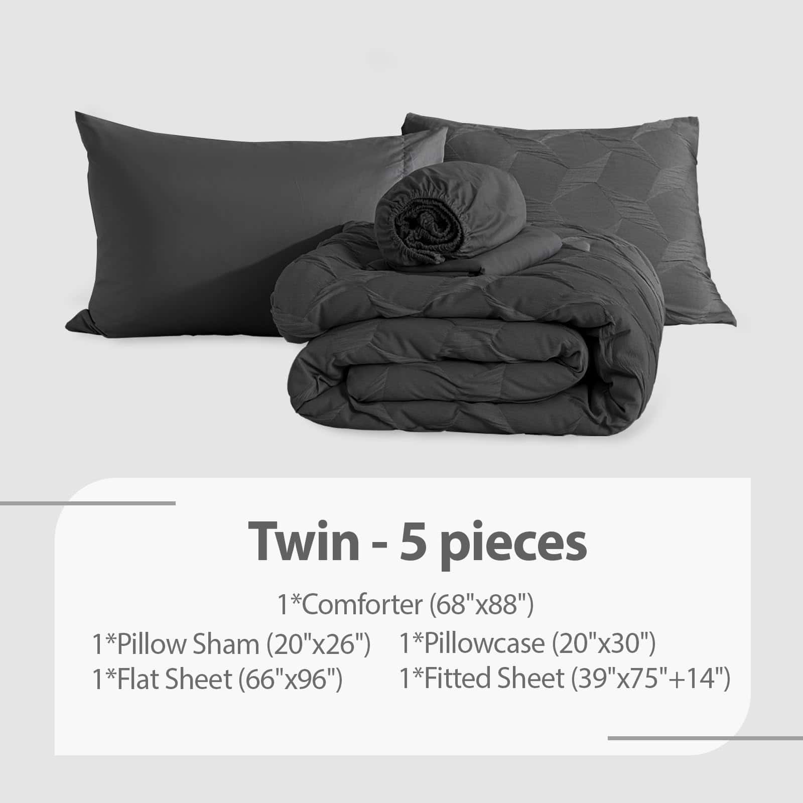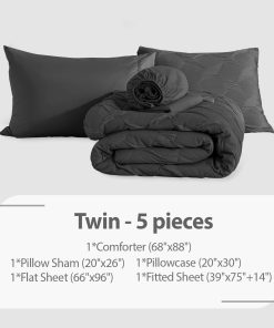 1. Juego de Cama en una Bolsa: Juego de Cama Twin (5 Piezas) incluye 1 Edredón (68″x88″), 1 Sábana Plana (66″x96″), 1 Sábana Ajustable (39″x75″+14″), 1 Funda de Almohada (20″x30″) y 1 Funda de Almohada (20″x26″).