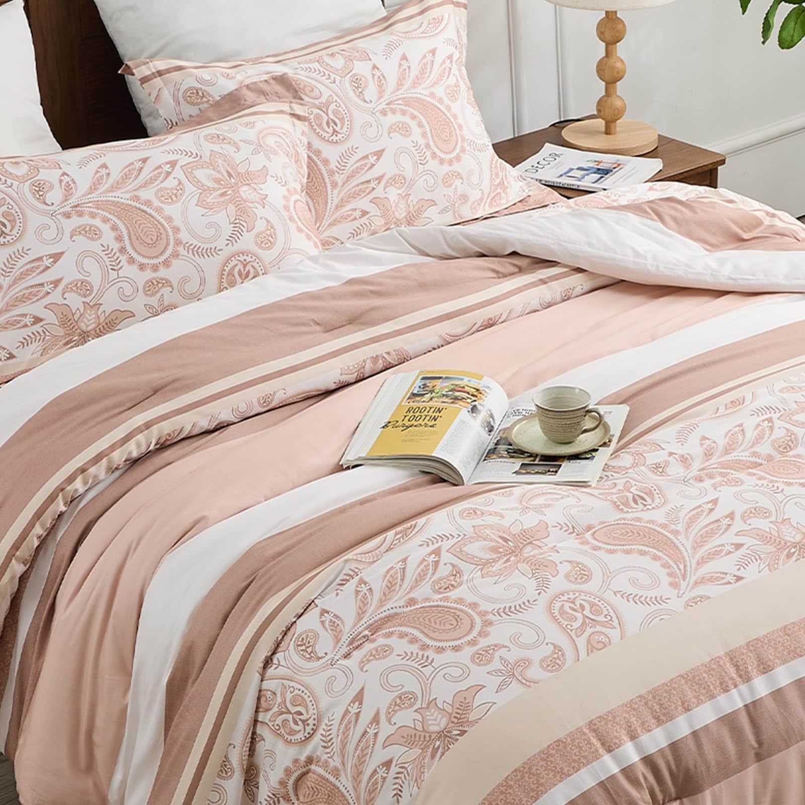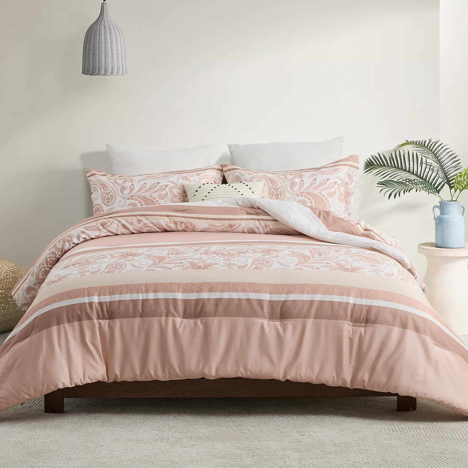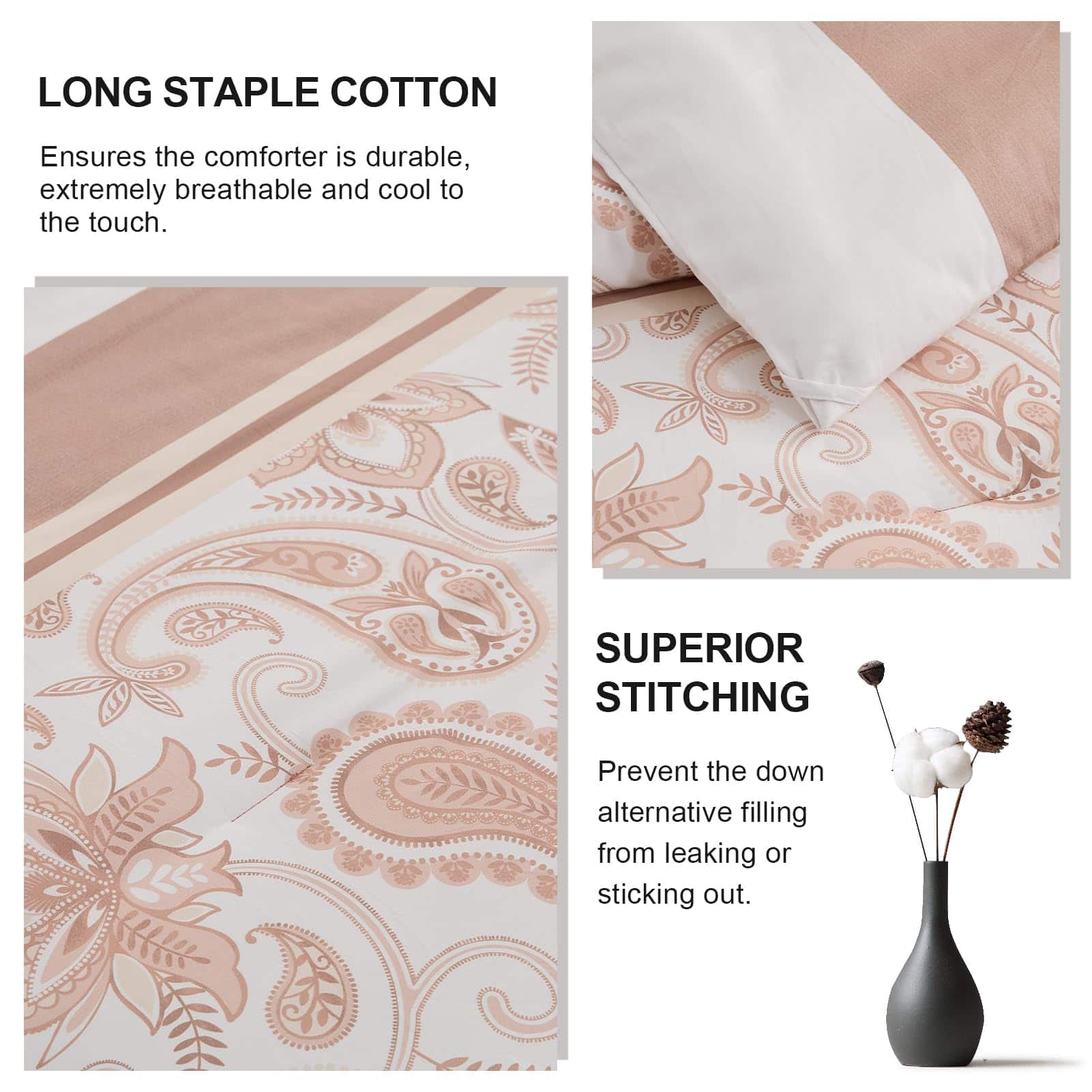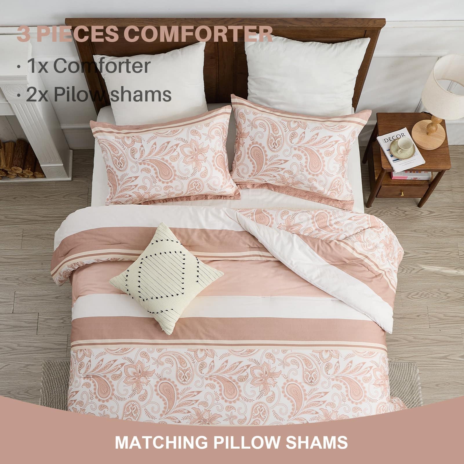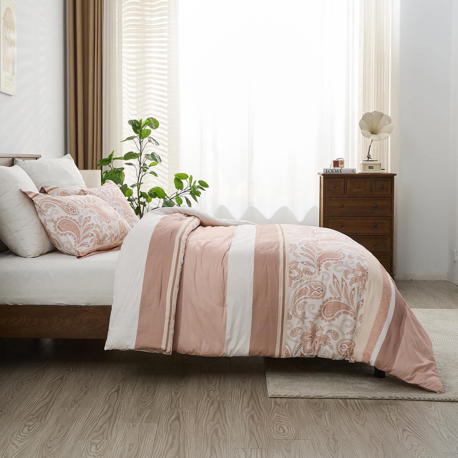 2. Diseño único: Transforma tu dormitorio en un refugio sereno con nuestro impresionante juego de edredón a rayas rosa. Con una cautivadora mezcla de suaves rayas rosas y blancas, combinadas con intrincados patrones florales y paisley, este juego emana un elegante encanto campestre que complementa sin esfuerzo cualquier estilo de decoración.