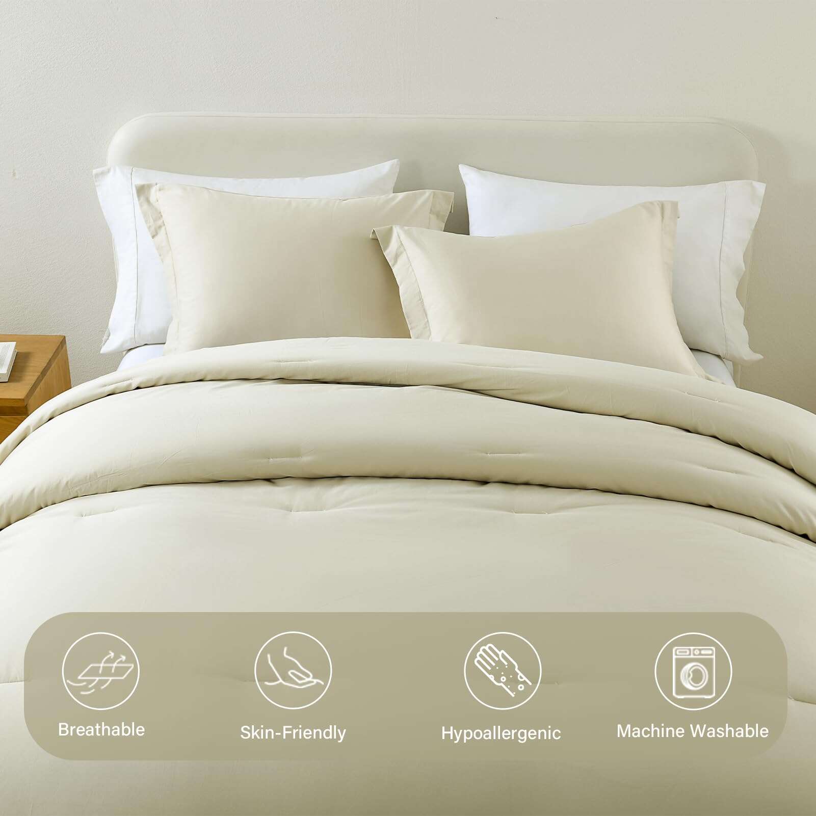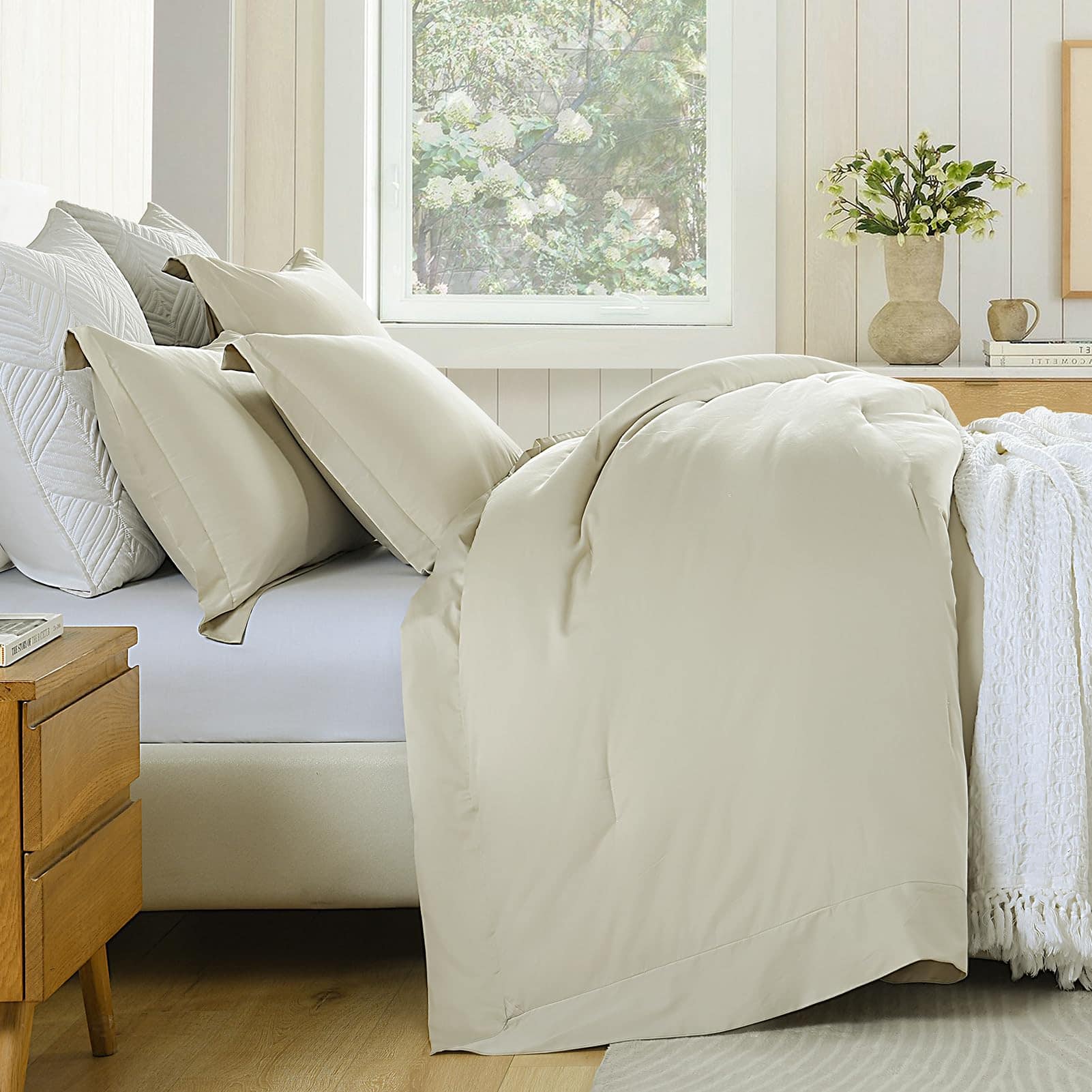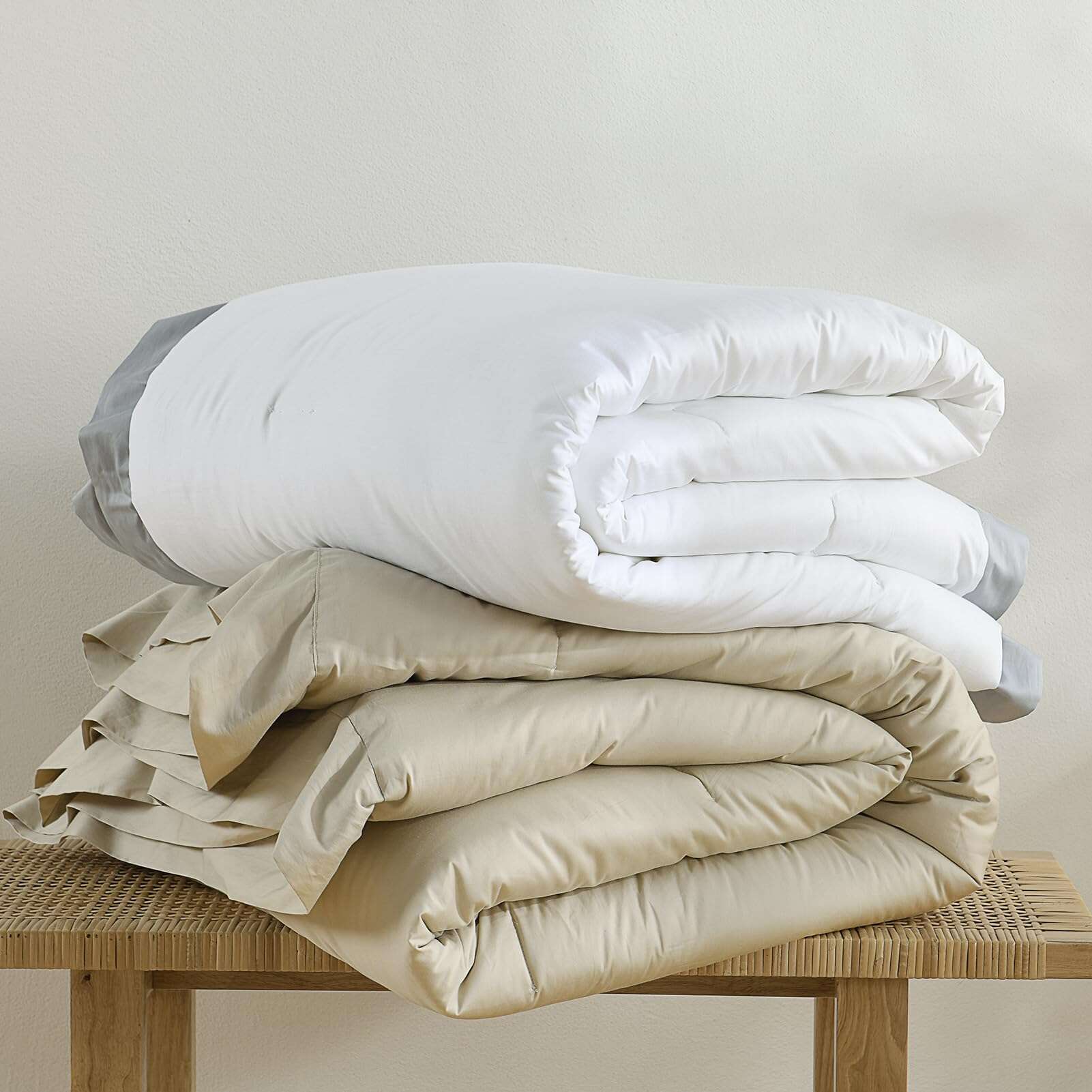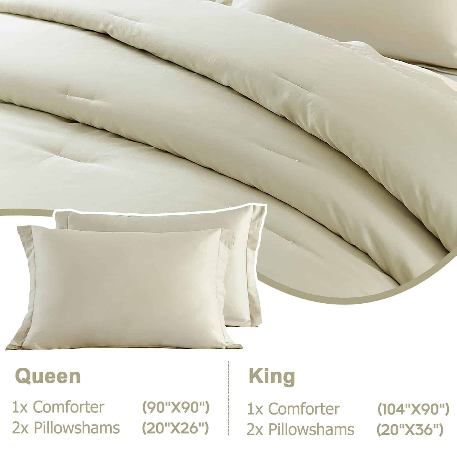 Este juego de edredón queen de Finlonte es la elección perfecta para aquellos que buscan comodidad y estilo en su dormitorio. Está hecho de algodón de alta calidad de 300TC y un relleno suave de poliéster que garantiza una sensación suave y acogedora durante todo el año. El diseño minimalista de borde ancho exterior en color champagne y beige agrega un toque de lujo y elegancia a tu habitación, creando un ambiente sofisticado y refinado.