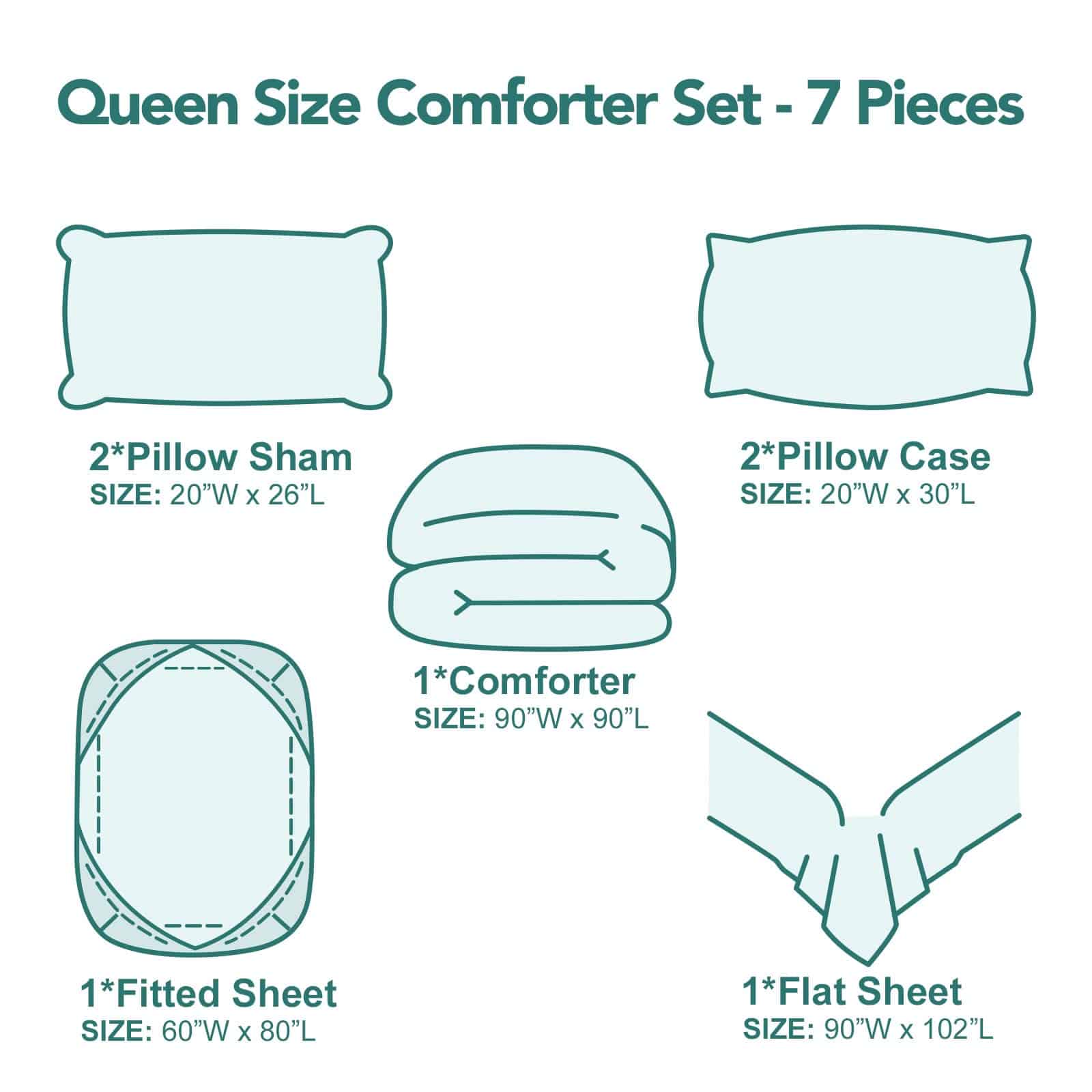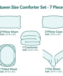 1. LO QUE OBTIENES: El juego de cama Queen incluye: 1 edredón 90″W x 90″L, 2 fundas de almohada 20″W x 26″L, 2 fundas de almohada 20″W x 30″L, 1 sábana plana 90″W x 102″L, 1 sábana ajustable 60″W x 80″L. Nota: el juego de edredones viene envasado al vacío, expónlo al sol y golpéalo suavemente después de recibirlo, se inflará rápidamente a su tamaño original y estará esponjoso después de unas horas. ¡La almohada no está incluida!
