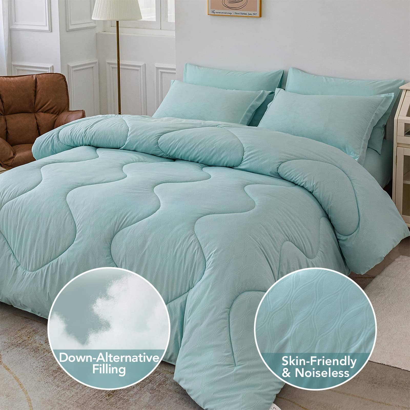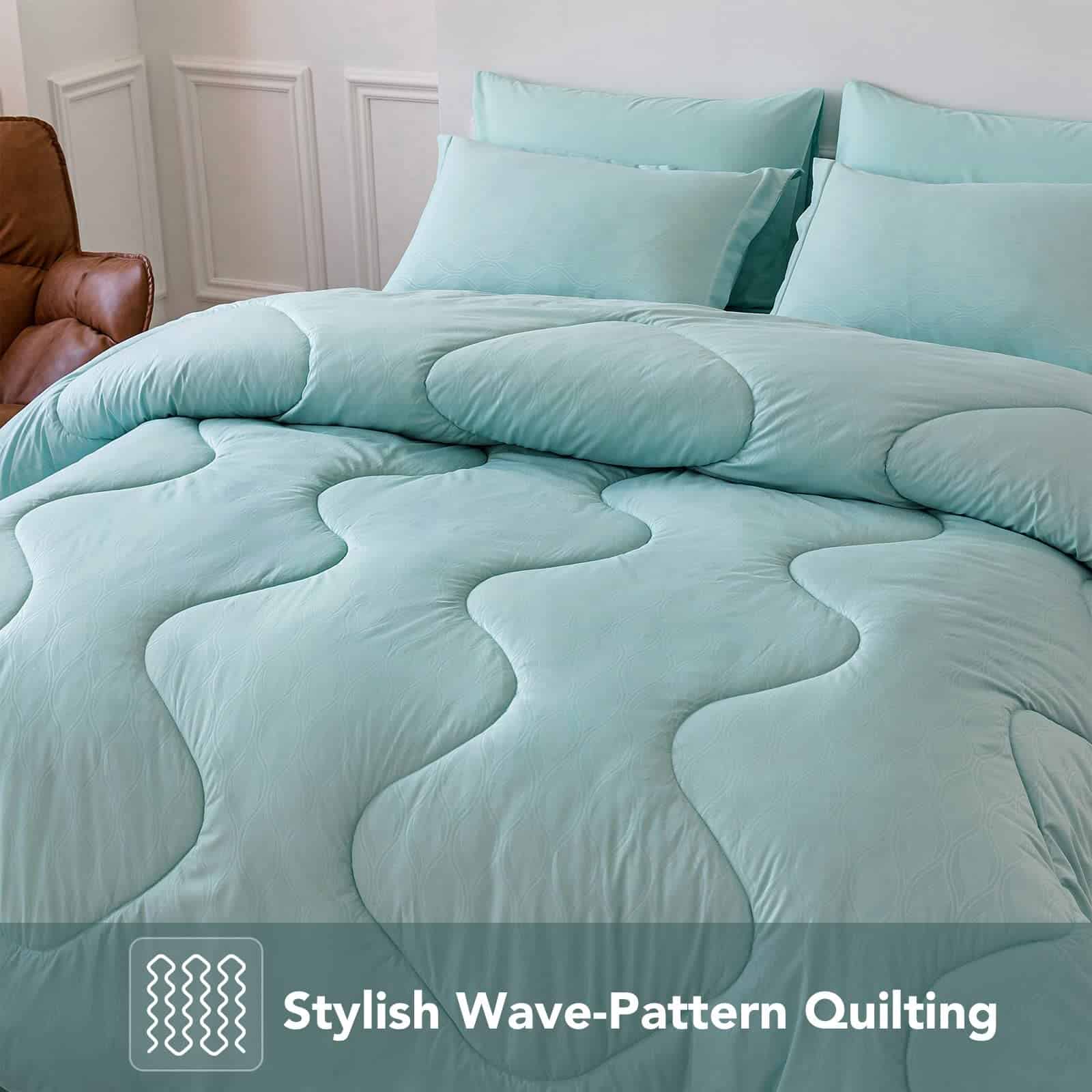 2. COSTURA EXQUISITA: El edredón acolchado alternativo a plumón presenta una costura duradera en onda que ofrece un aspecto sofisticado junto con la sencillez y evita que el relleno se desplace o se aglomere en una área, manteniendo la forma del edredón incluso después de lavarlo. ¡Listo para actualizar la decoración de tu dormitorio con todo lo que necesitas en un solo conjunto!