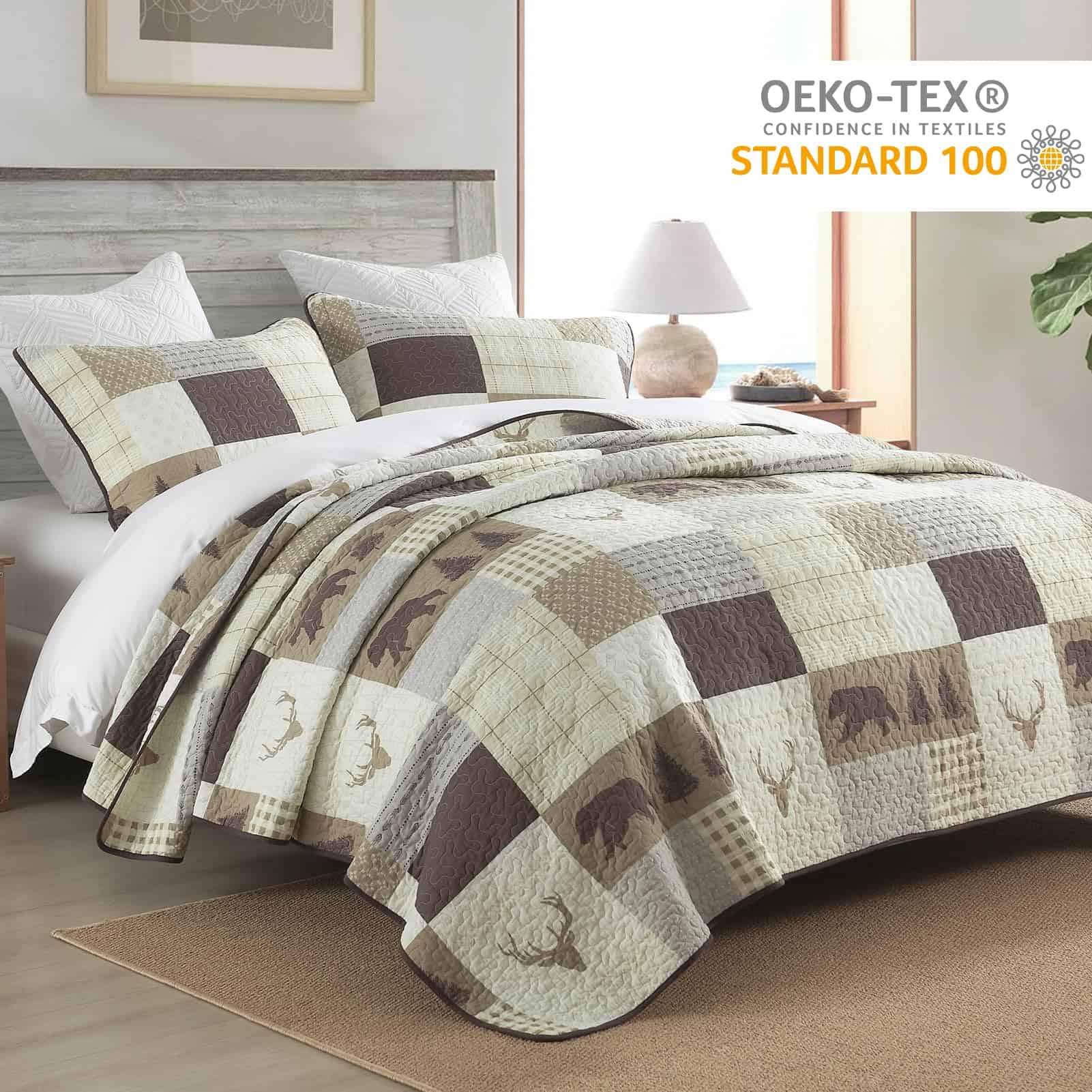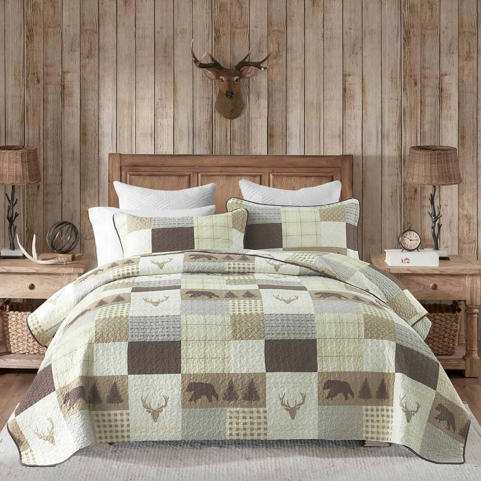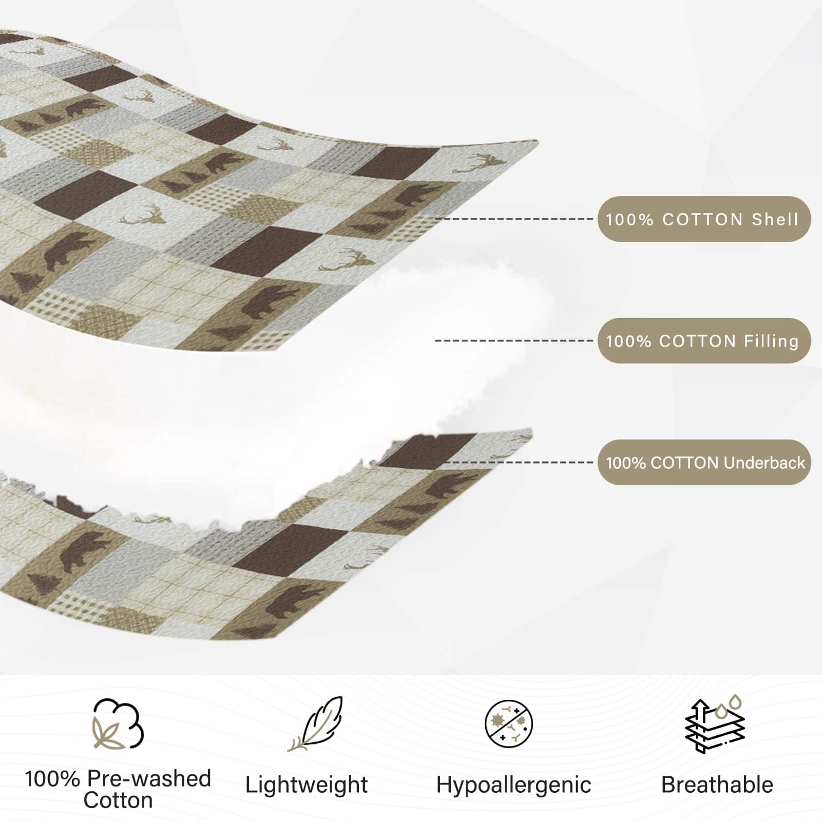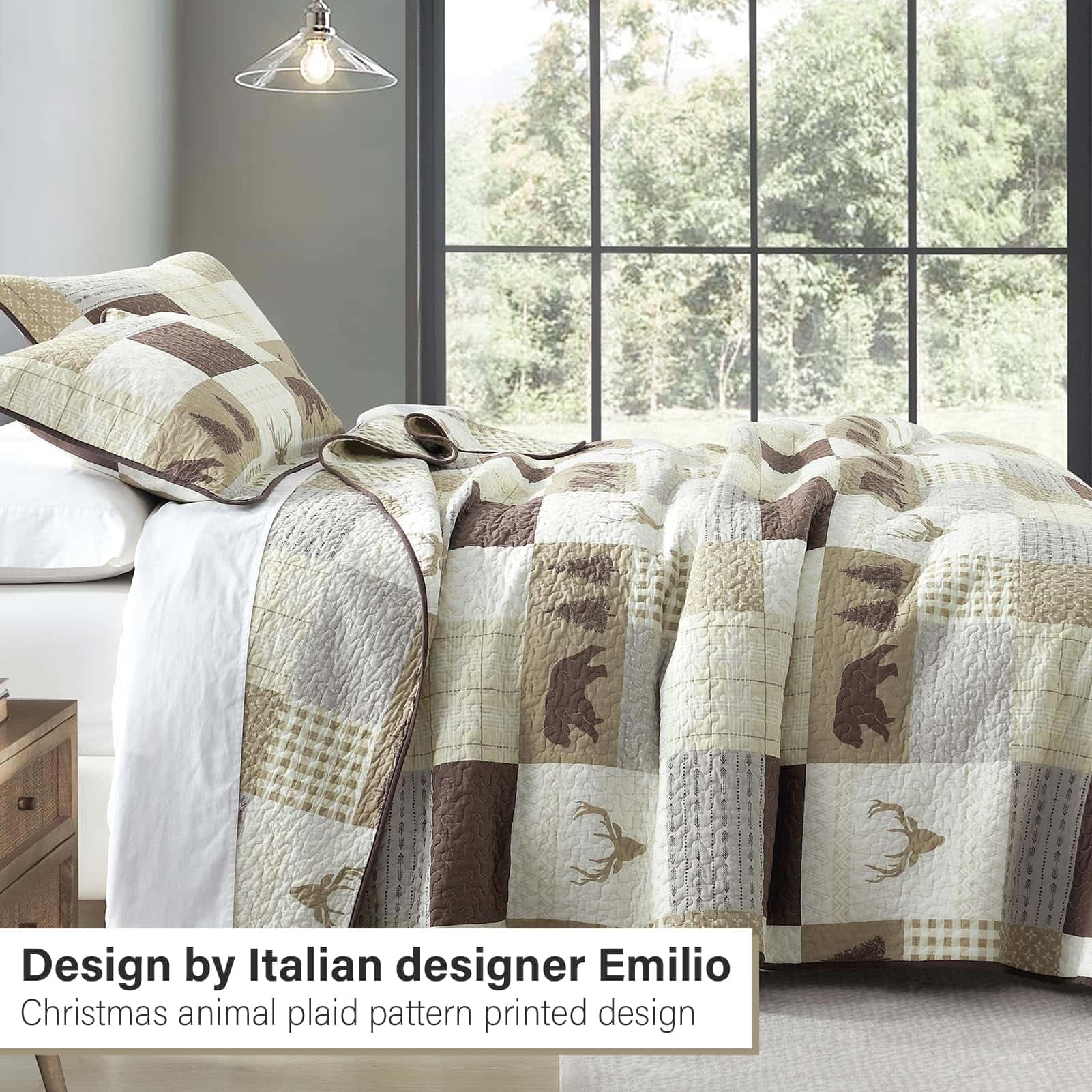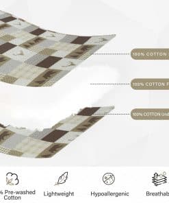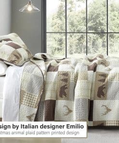 El juego de edredón Queen Size PERHOM está elaborado con los más altos estándares de calidad. Cuenta con un diseño de patchwork que combina hermosos patrones de árbol del bosque, oso, ciervo y cuadriculado en tonos marrón, creando una estética única para tu dormitorio. Este juego de edredón está confeccionado con 100% algodón prelavado, lo que lo hace más suave, duradero y fácil de cuidar que los edredones convencionales. Además, al ser hipoalergénico, es una excelente elección para personas con piel sensible o alergias. Este juego de edredón Queen Size PERHOM cuenta con certificación OEKO-TEX, garantizando que ha sido sometido a pruebas estrictas para garantizar que no contiene sustancias dañinas. Los tintes reactivos utilizados en la impresión garantizan colores vibrantes, un tacto suave y respetuoso con el medio ambiente. El juego de edredón incluye 1 edredón (98 x 90 pulgadas) y 2 fundas de almohada (20 x 28 pulgadas), lo que lo convierte en una opción versátil y completa para tu cama. Gracias a su diseño de tres capas y relleno de algodón al 100%, este juego de edredón es ligero pero cálido, ideal para primavera, verano, otoño e invierno. Puede utilizarse como juego de edredón, colcha, cubrecamas o edredón. La costura resistente y duradera de este juego de edredón garantiza que pueda soportar un uso y lavado frecuente. Fácil de mantener, ya que el algodón es lavable a máquina y conserva su forma y color incluso después de múltiples lavados. Este juego de edredón te ahorrará tiempo y esfuerzo en el mantenimiento de una apariencia fresca y limpia en tu ropa de cama.
